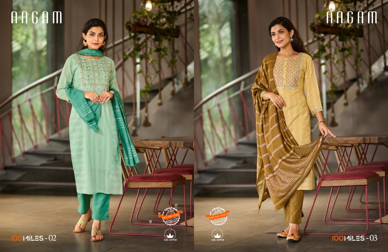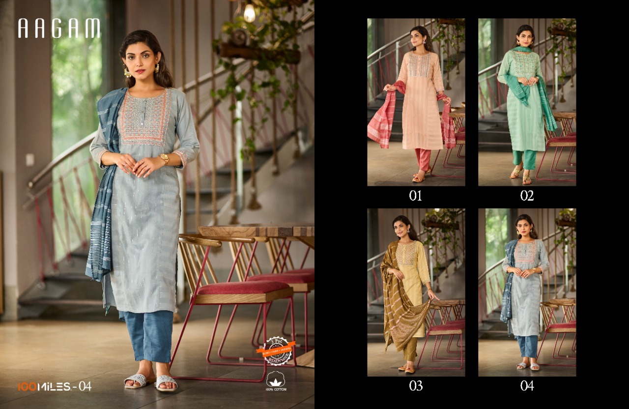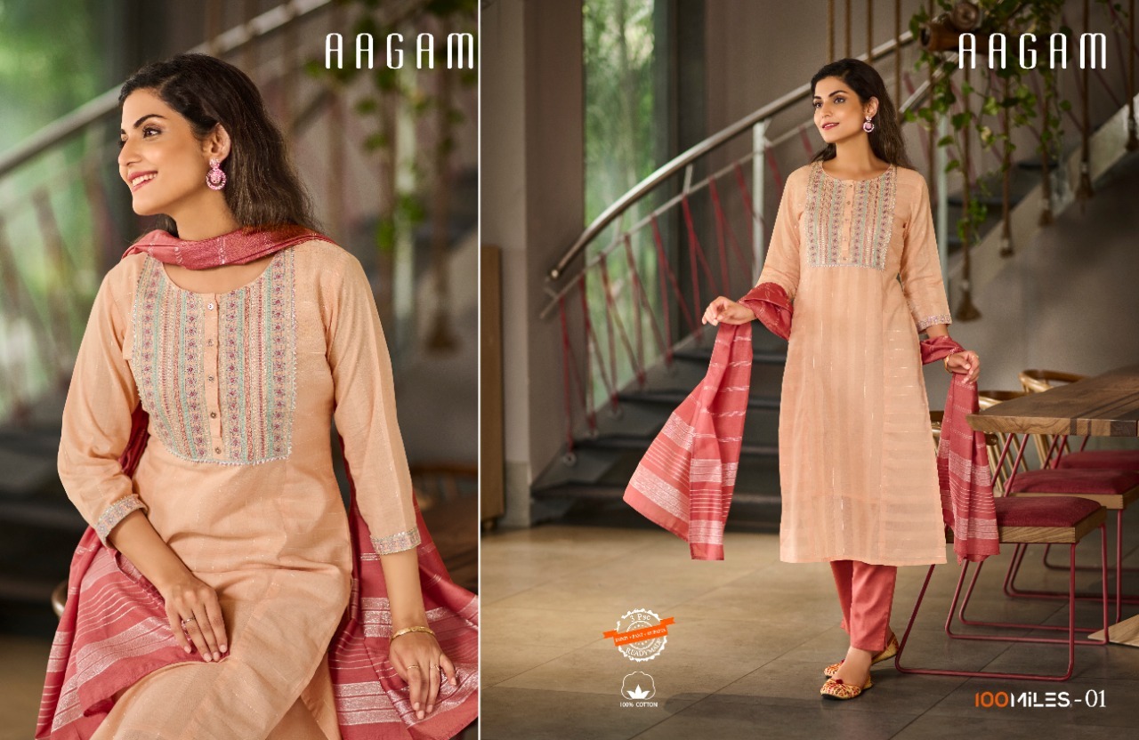 Aagam Kurti By 100 Miles Designer With Work Cotton Kurti With Bottom And Dupatta Are Available At Wholesale Price
