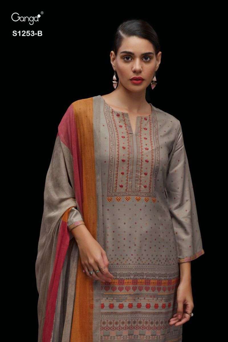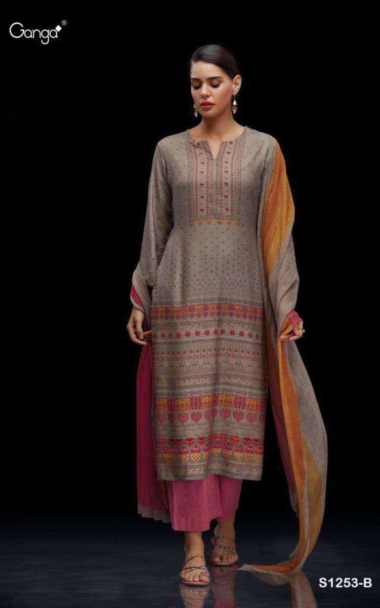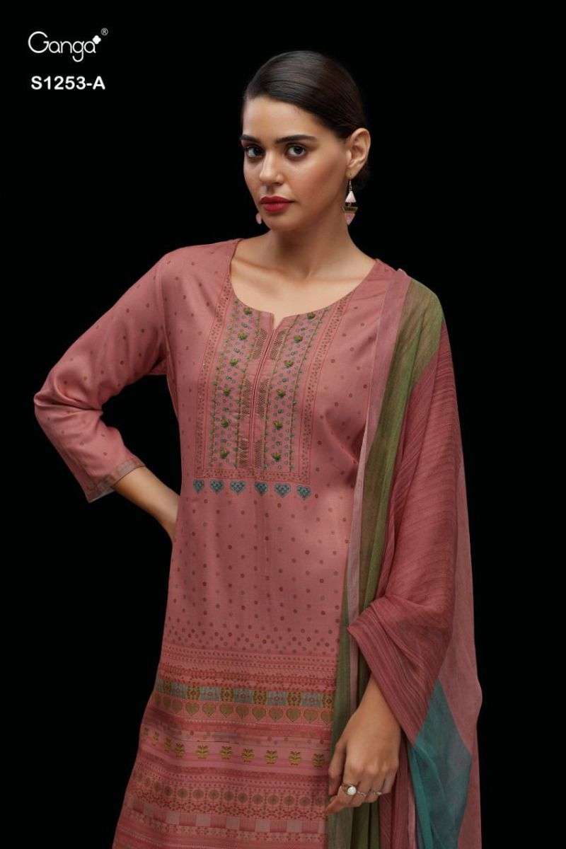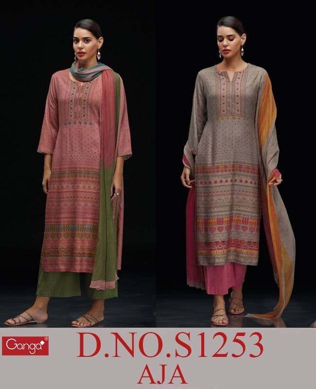 AJA 1253 SERIES BY GANGA DESIGNER WITH PRINTED AND EMBROIDERY WORK PASHMINA DOBBY SUITS ARE AVAILABLE AT WHOLESALE PRICE