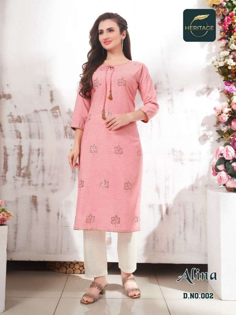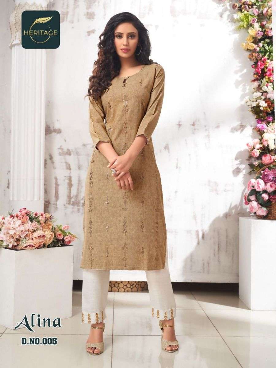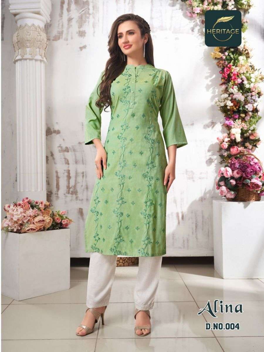 ALINA KURTI BY HERITAGE DESIGNER WITH WORK RAYON SLUB KURTI WITH PANT ARE AVAILABLE AT WHOLESALE PRICE