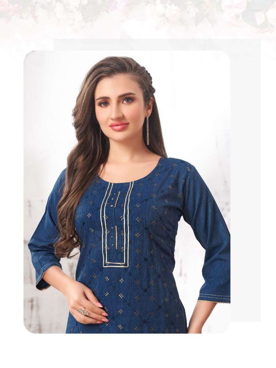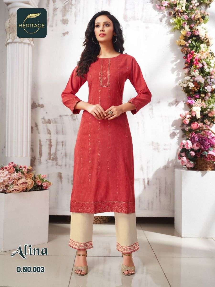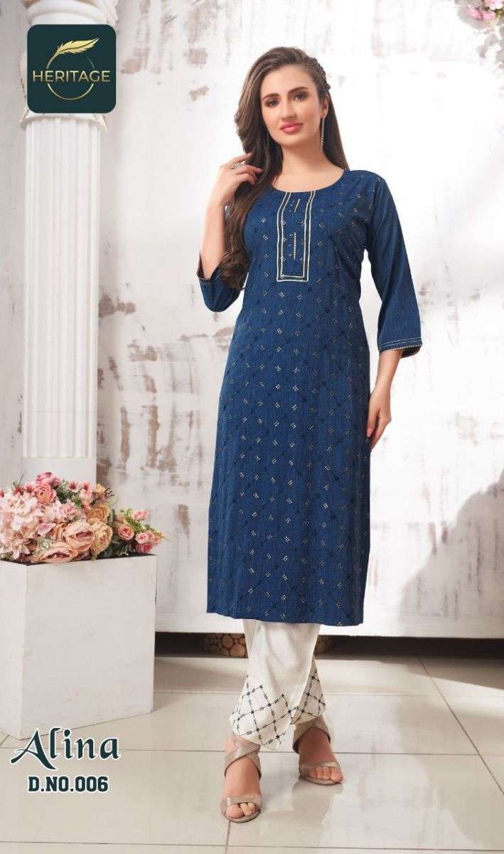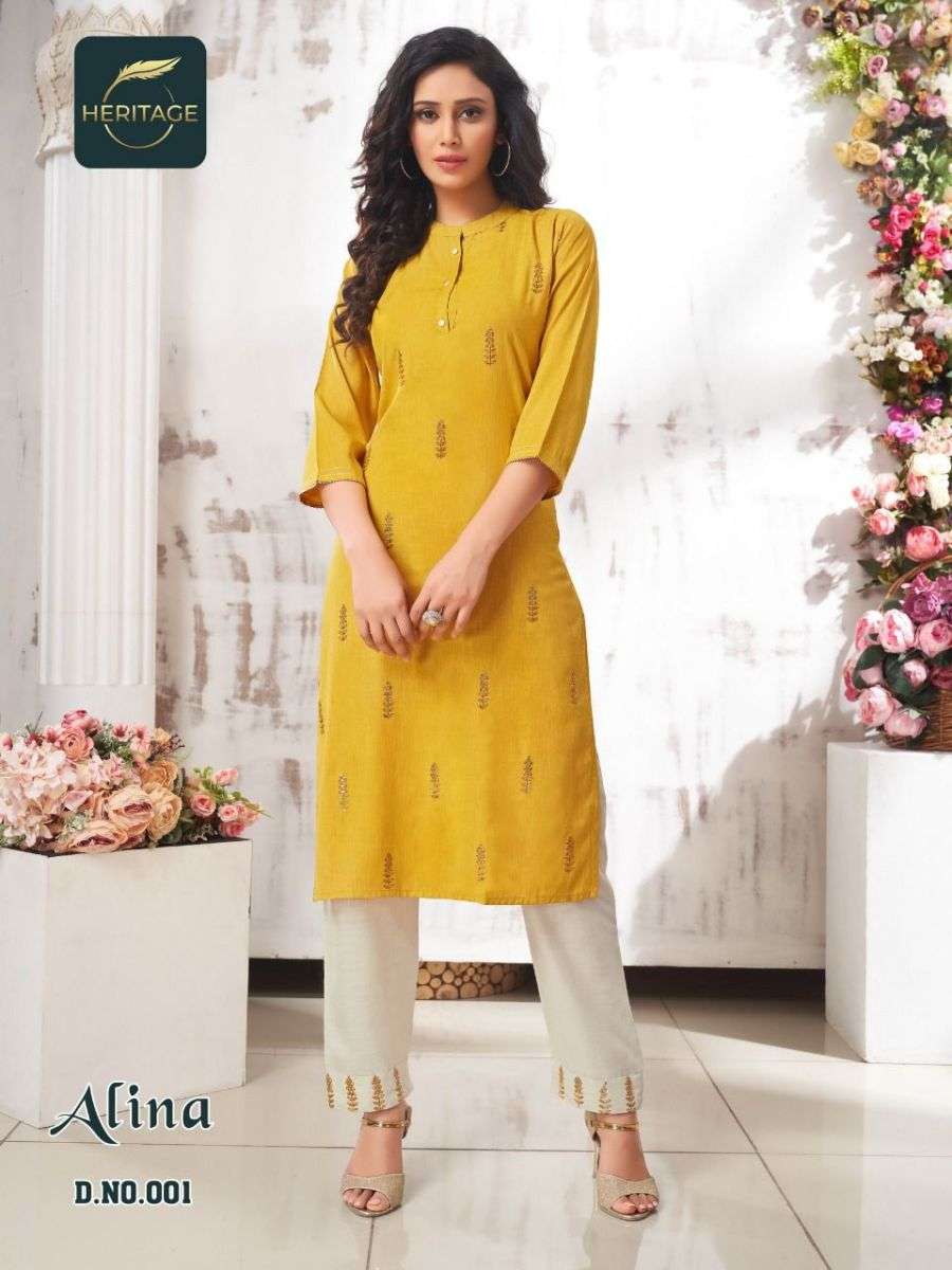 ALINA KURTI BY HERITAGE DESIGNER WITH WORK RAYON SLUB KURTI WITH PANT ARE AVAILABLE AT WHOLESALE PRICE