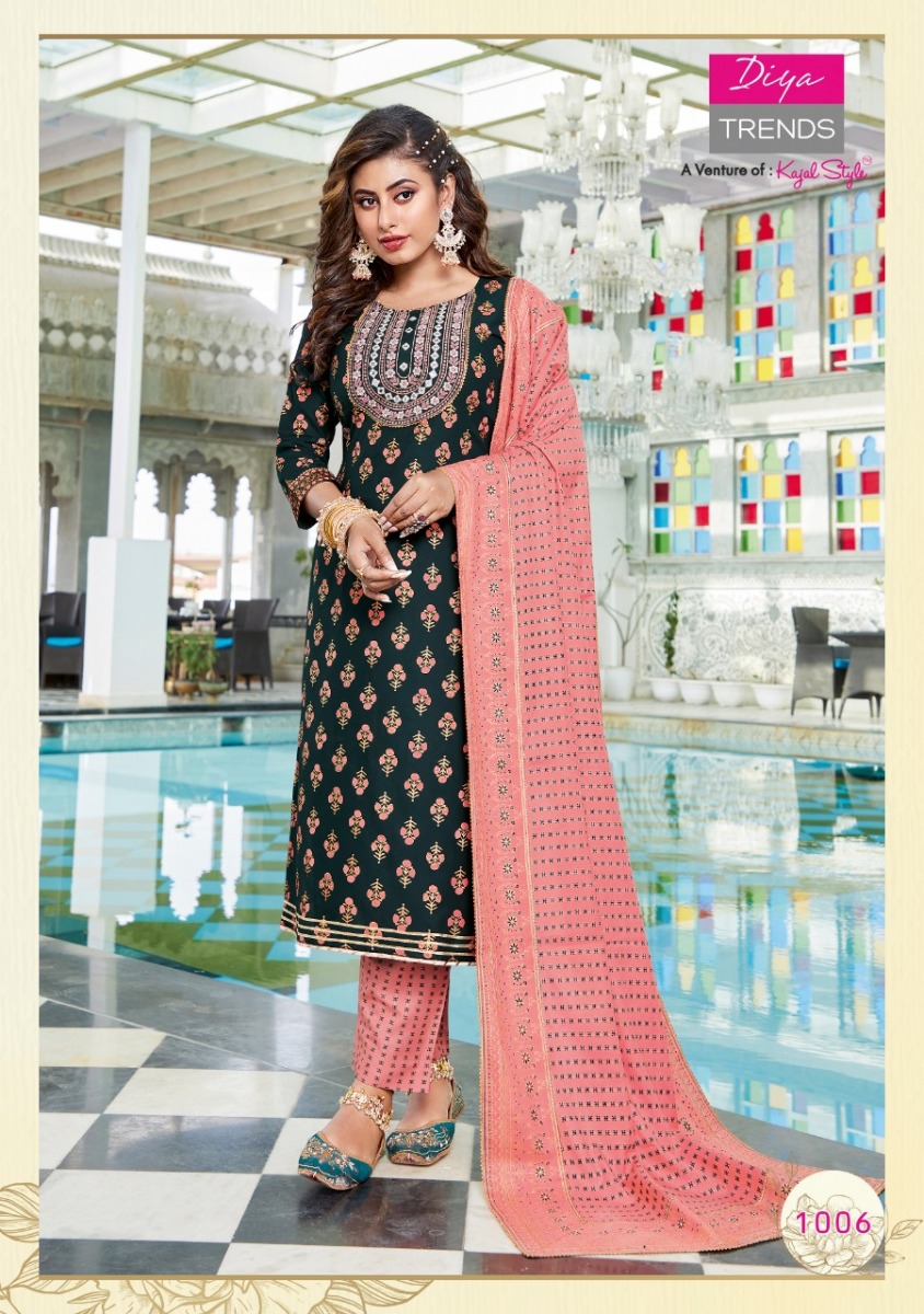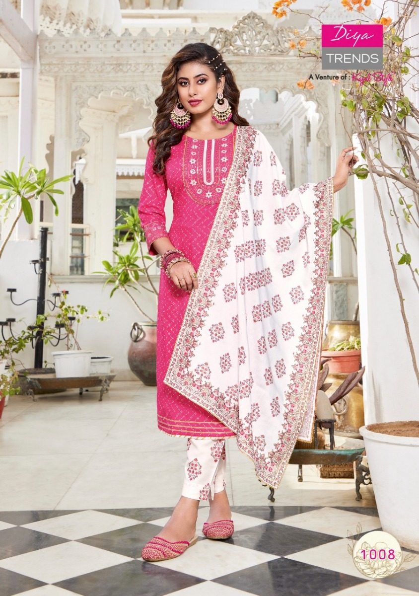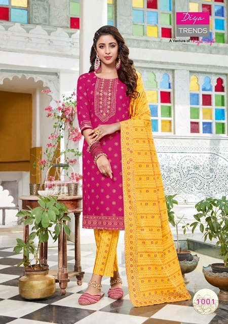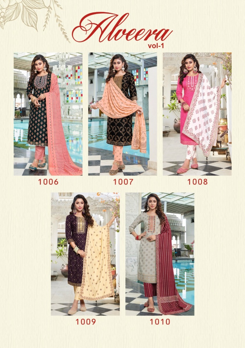 Alveera Vol-1 Kurti By Diya Trends Designer With Printed Rayon Kurti With Bottom And Dupatta Are Available At Wholesale Price