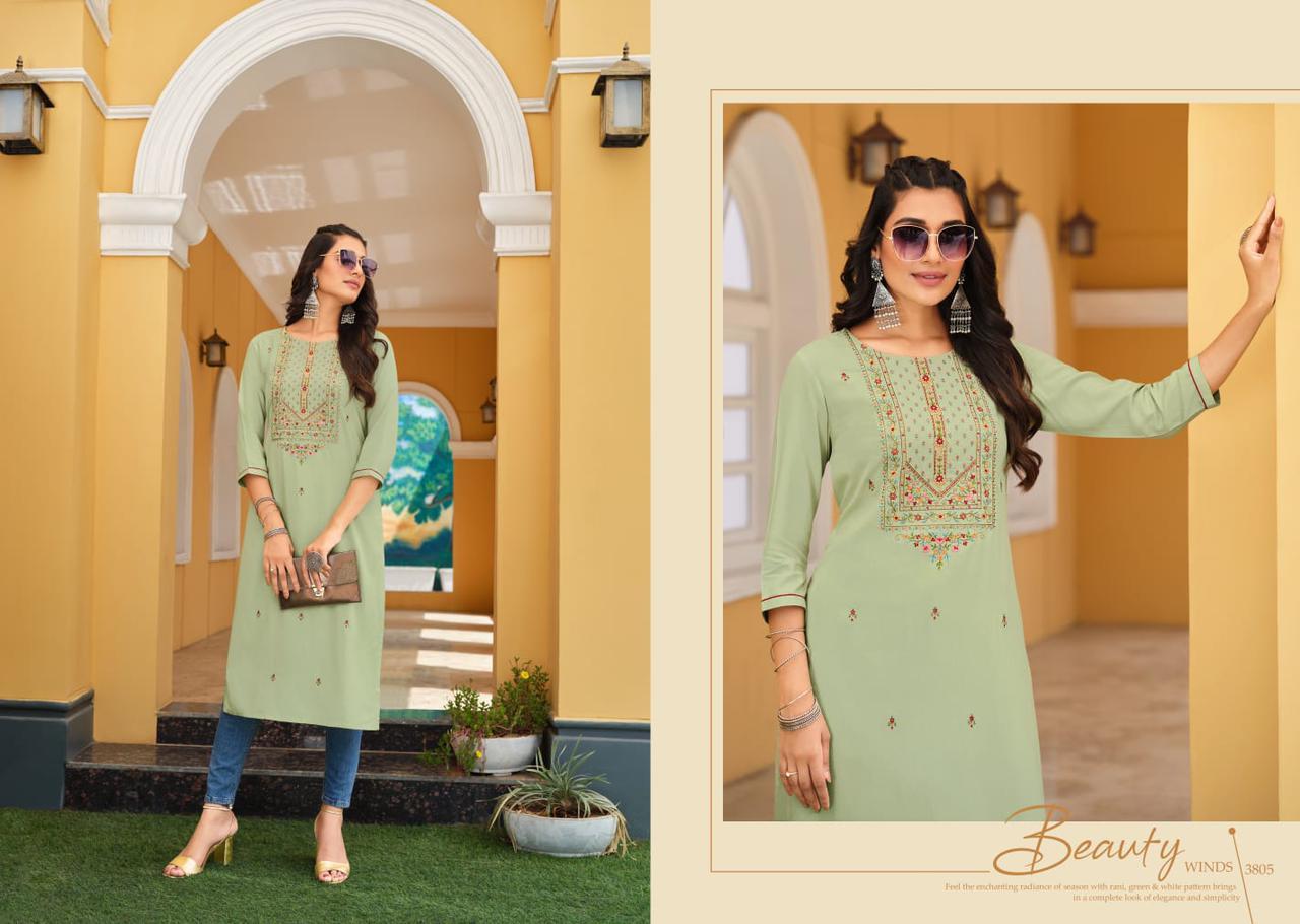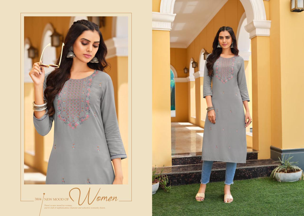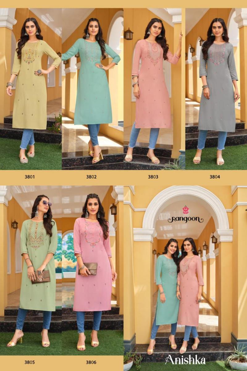 Anishka Kurti By Rangoon Designer With Embroidery Work Rayon Long Kurtis Are Available At Wholesale Price