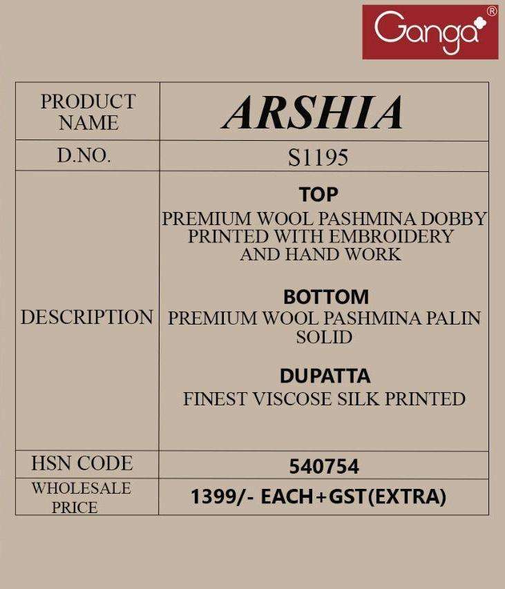ARSHIA S1195 BY GANGA DESIGNER WITH WORK PASHMINA SUITS ARE AVAILABLE AT WHOLESALE PRICE