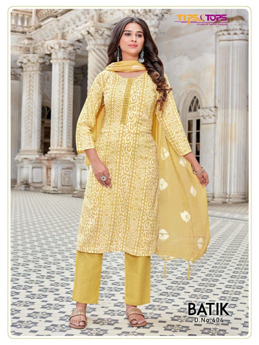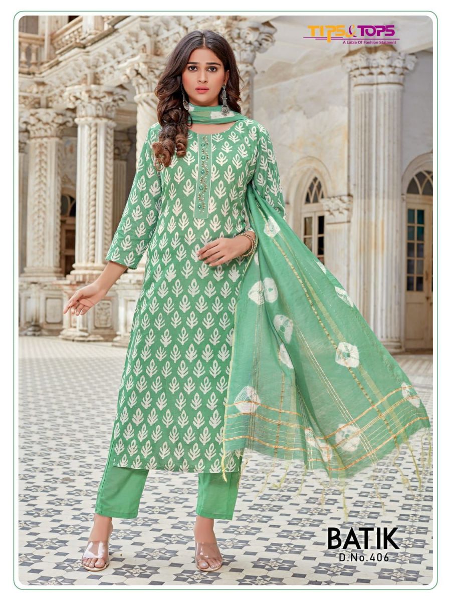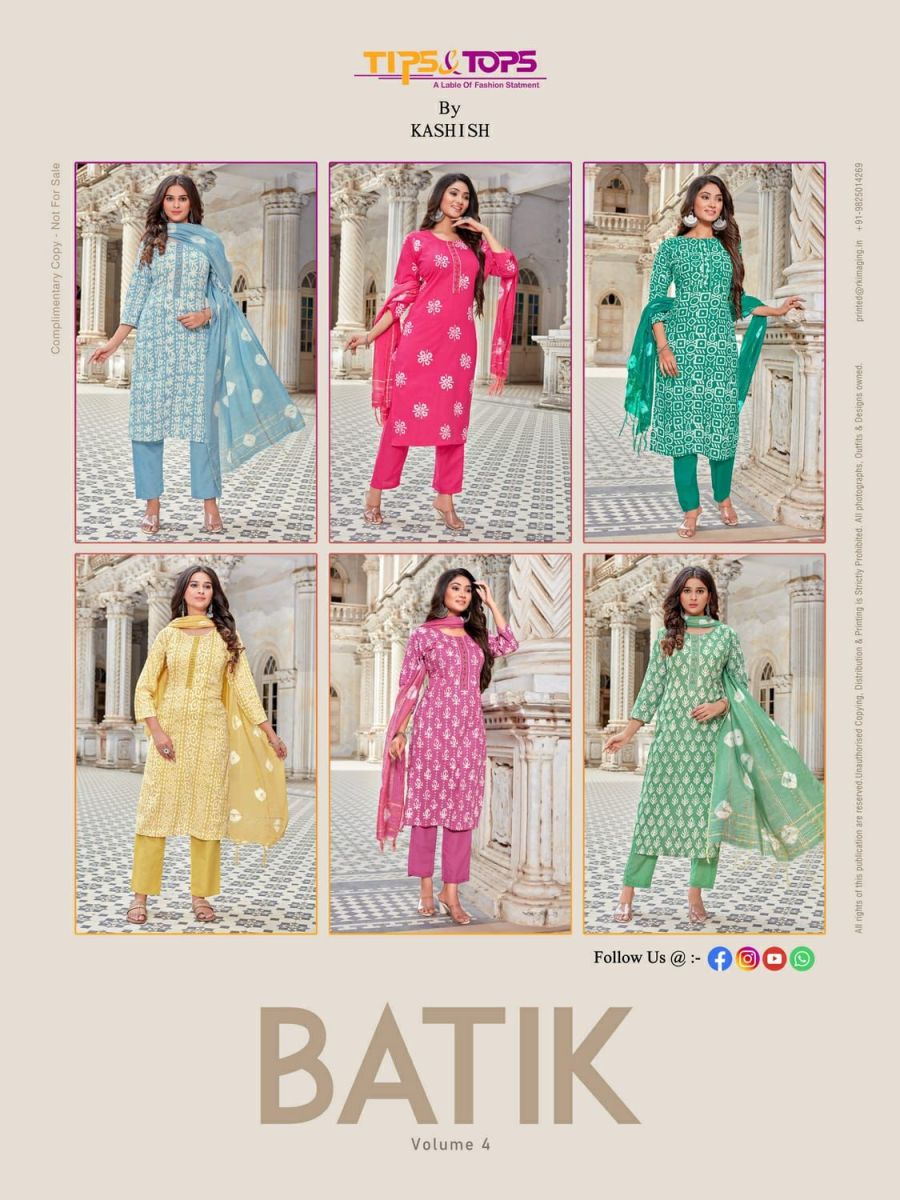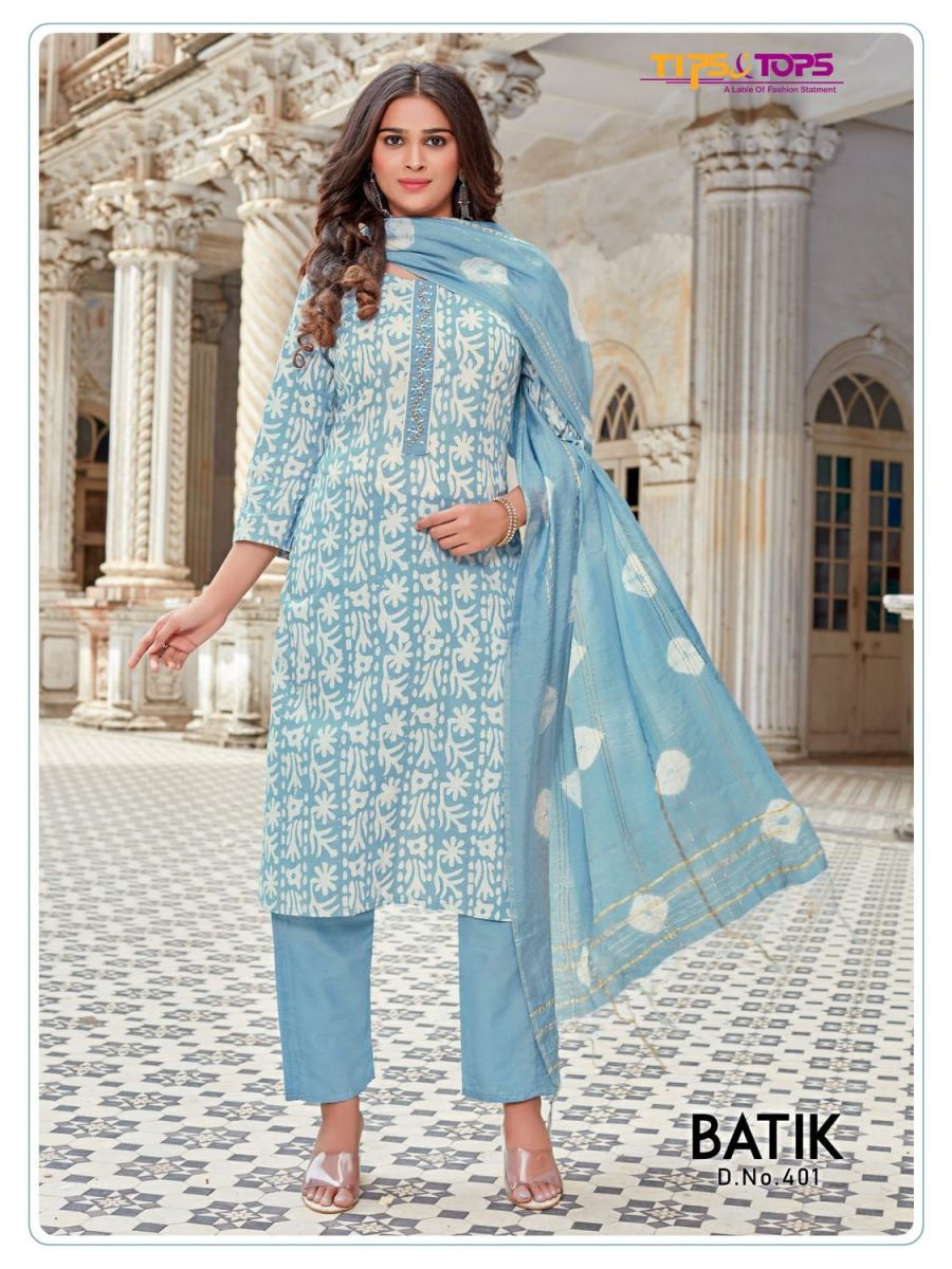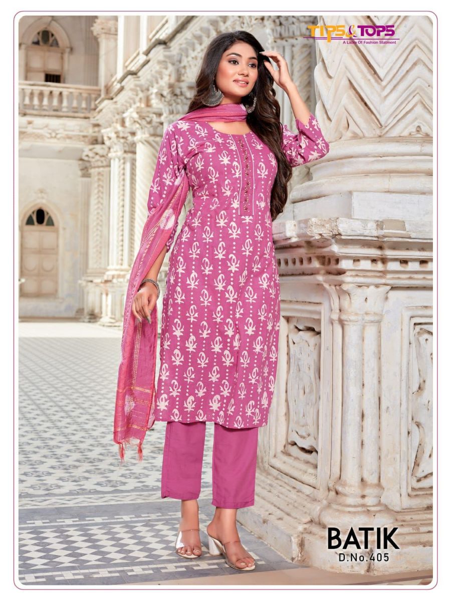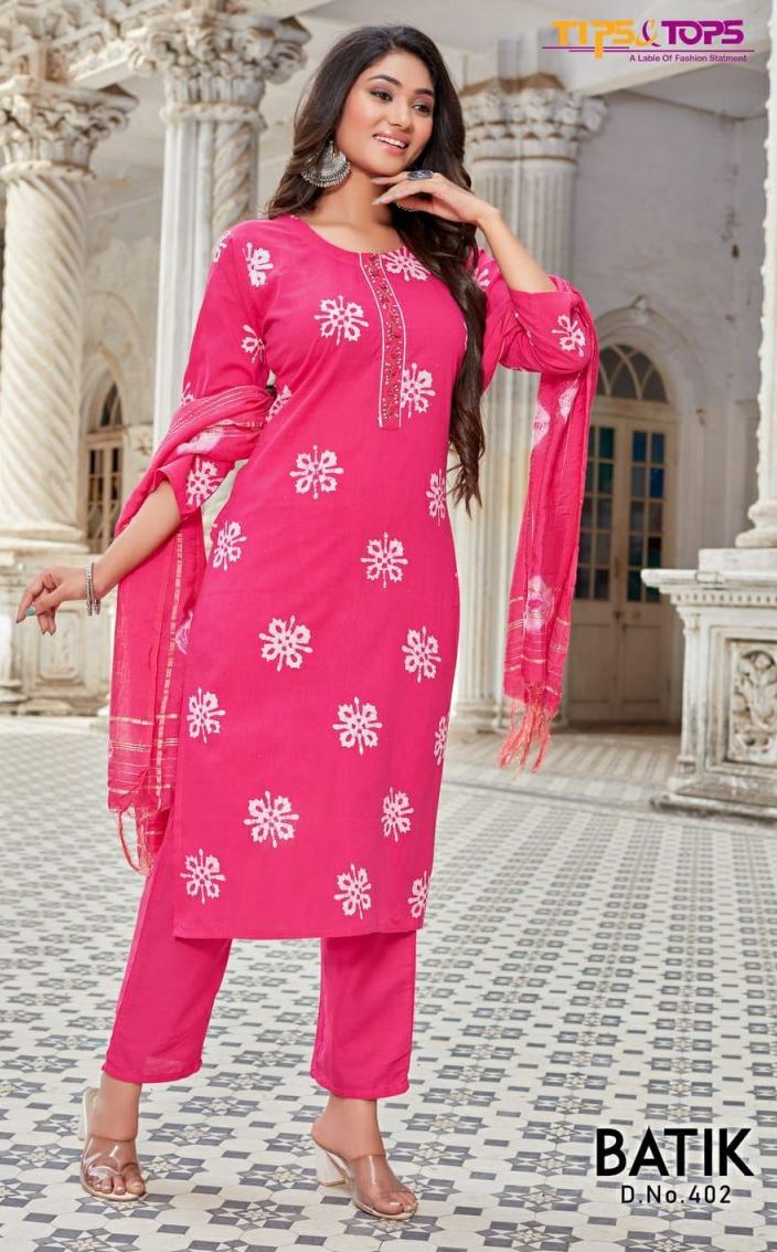 Batik Vol-4 Kurti By Tips & Tops Designer With Batik Print And Hand Work Cotton Kurti With Bottom And Dupatta Are Available At Wholesale Price