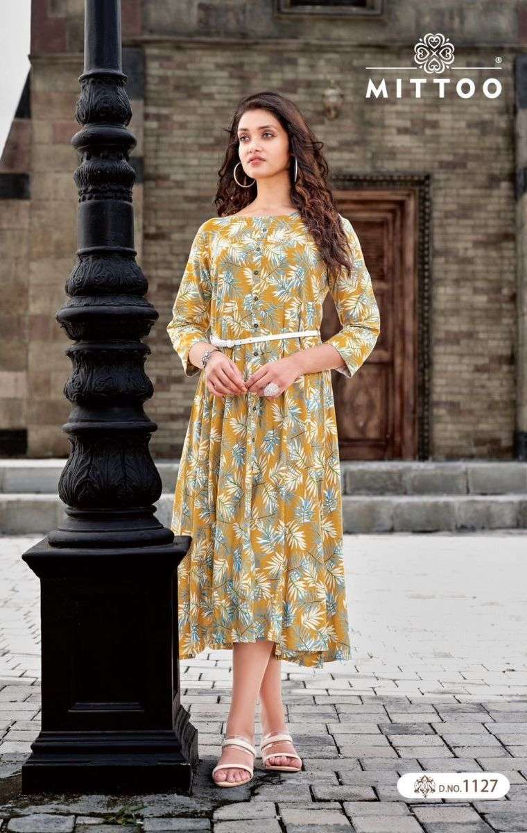 BELT VOL-11 KURTI BY MITTO DESIGNER WITH PRINTED RAYON KURTIS ARE AVAILABLE AT WHOLESALE PRICE