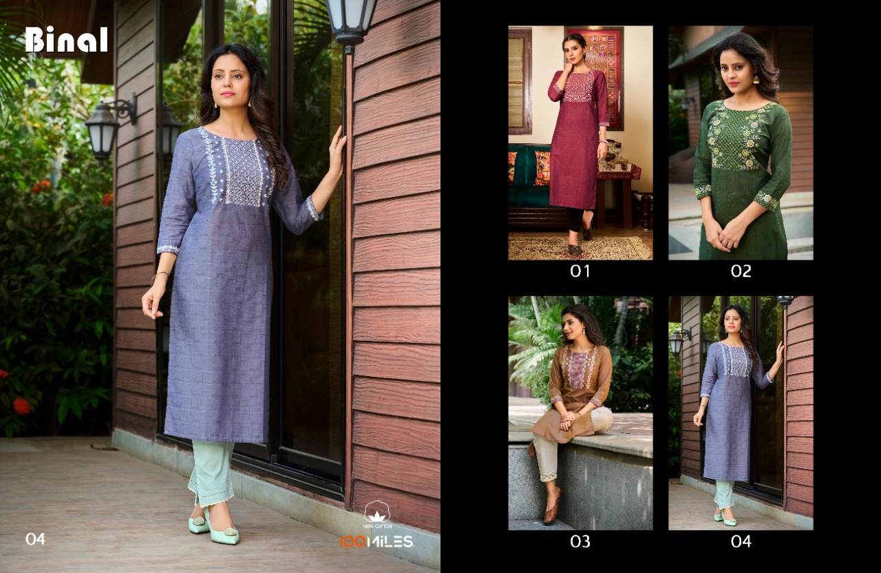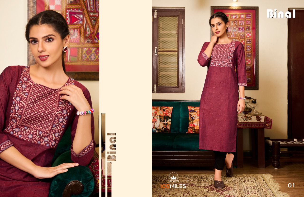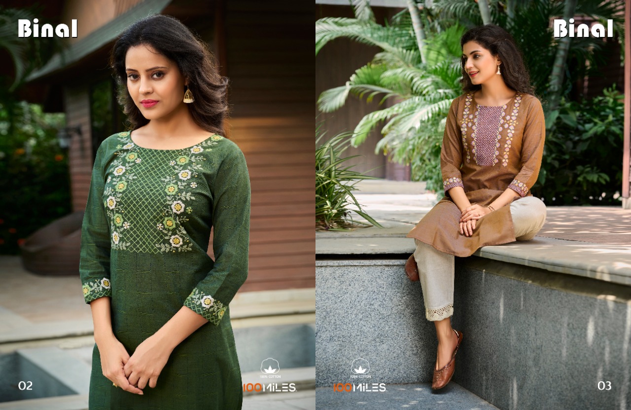 Binal Kurti By 100 Miles Designer With Embroidery Work Cotton Long Casual Wear Kurtis Are Available At Wholesale Price