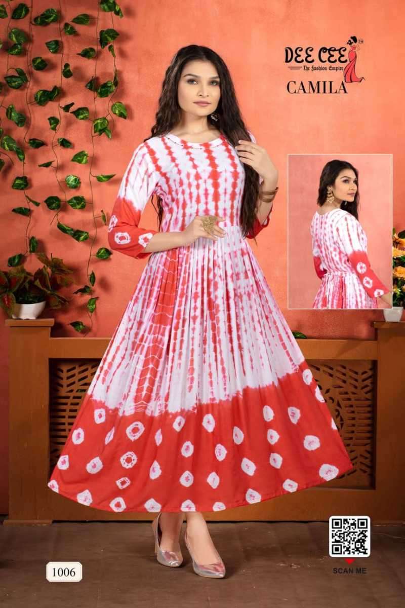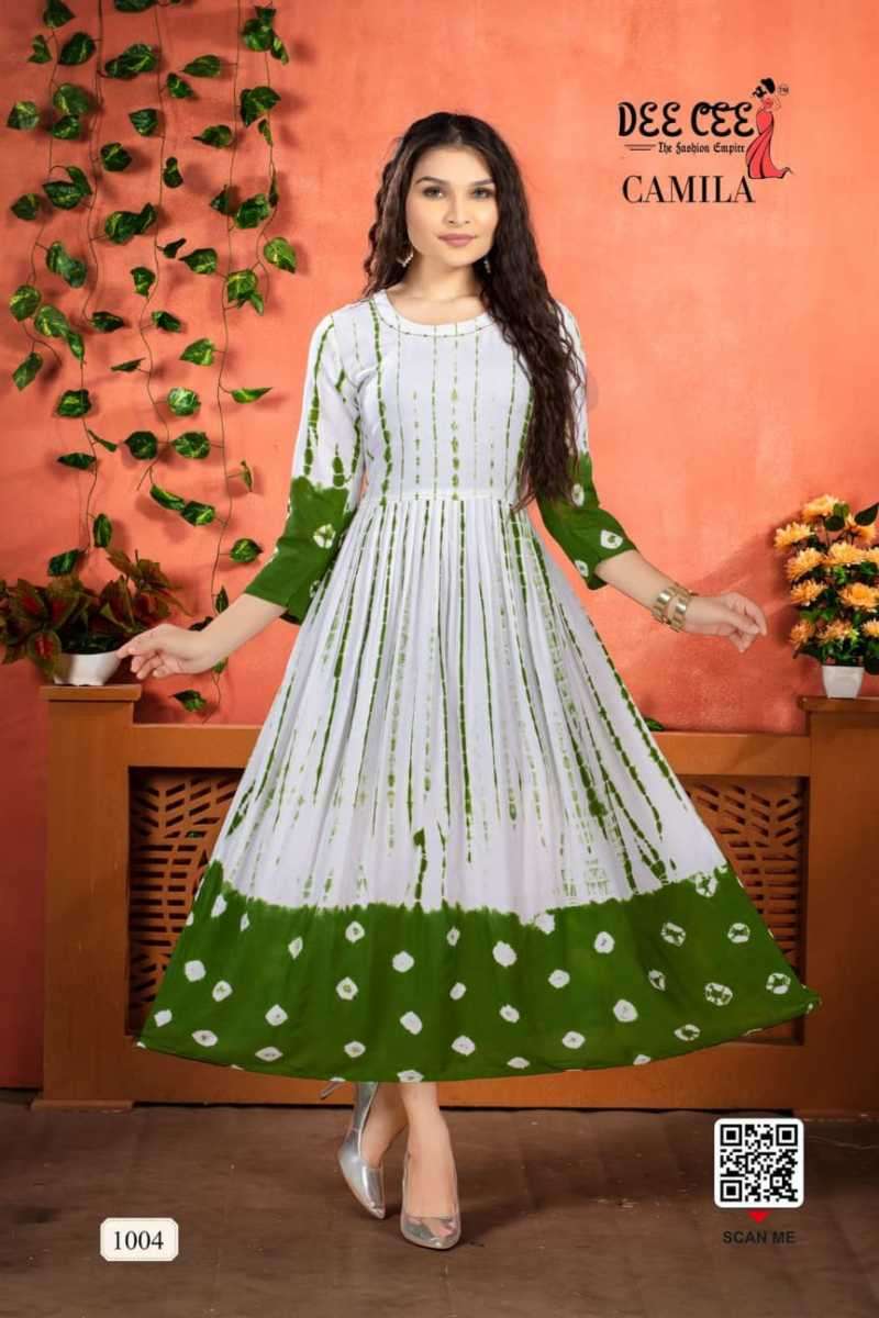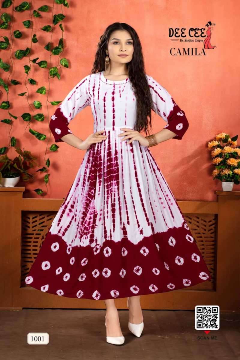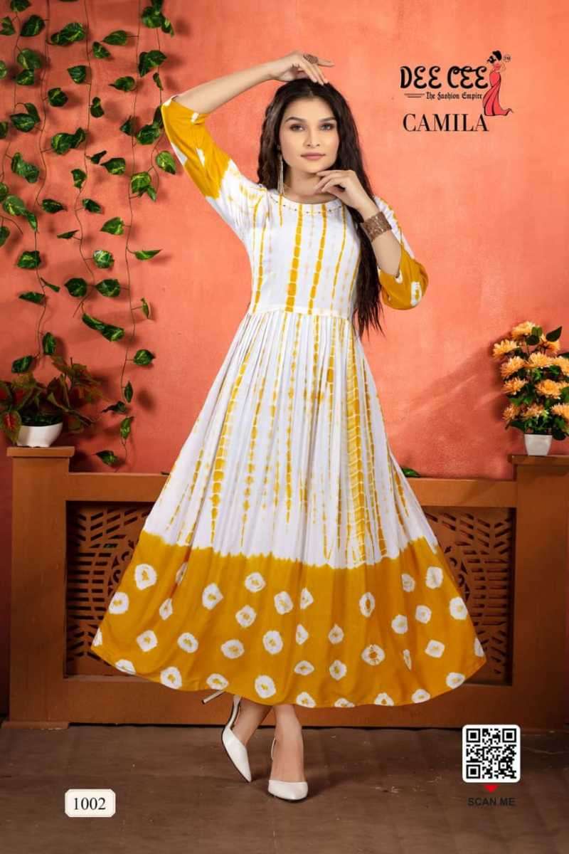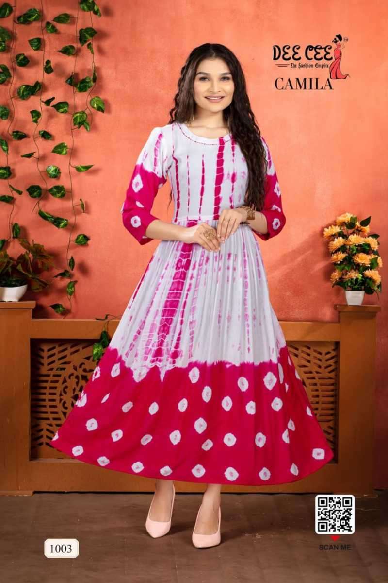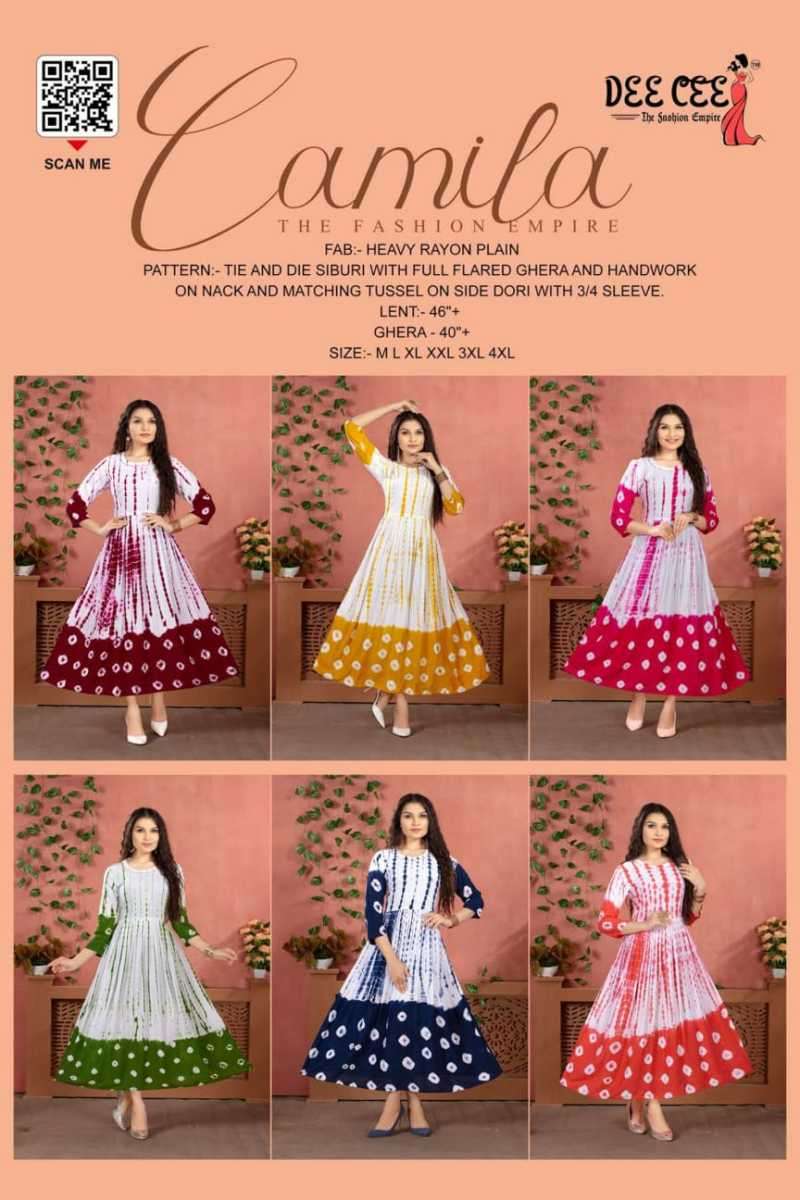 CAMILA KURTI BY DEE CEE DESIGNER WITH PRINTED AND WORK FLAIR GHERA KURTIS ARE AVAILABLE AT WHOLESALE PRICE