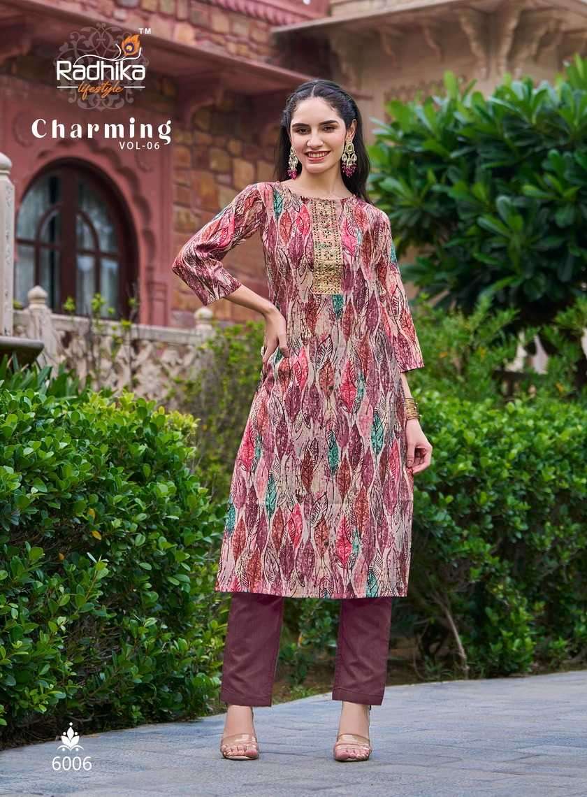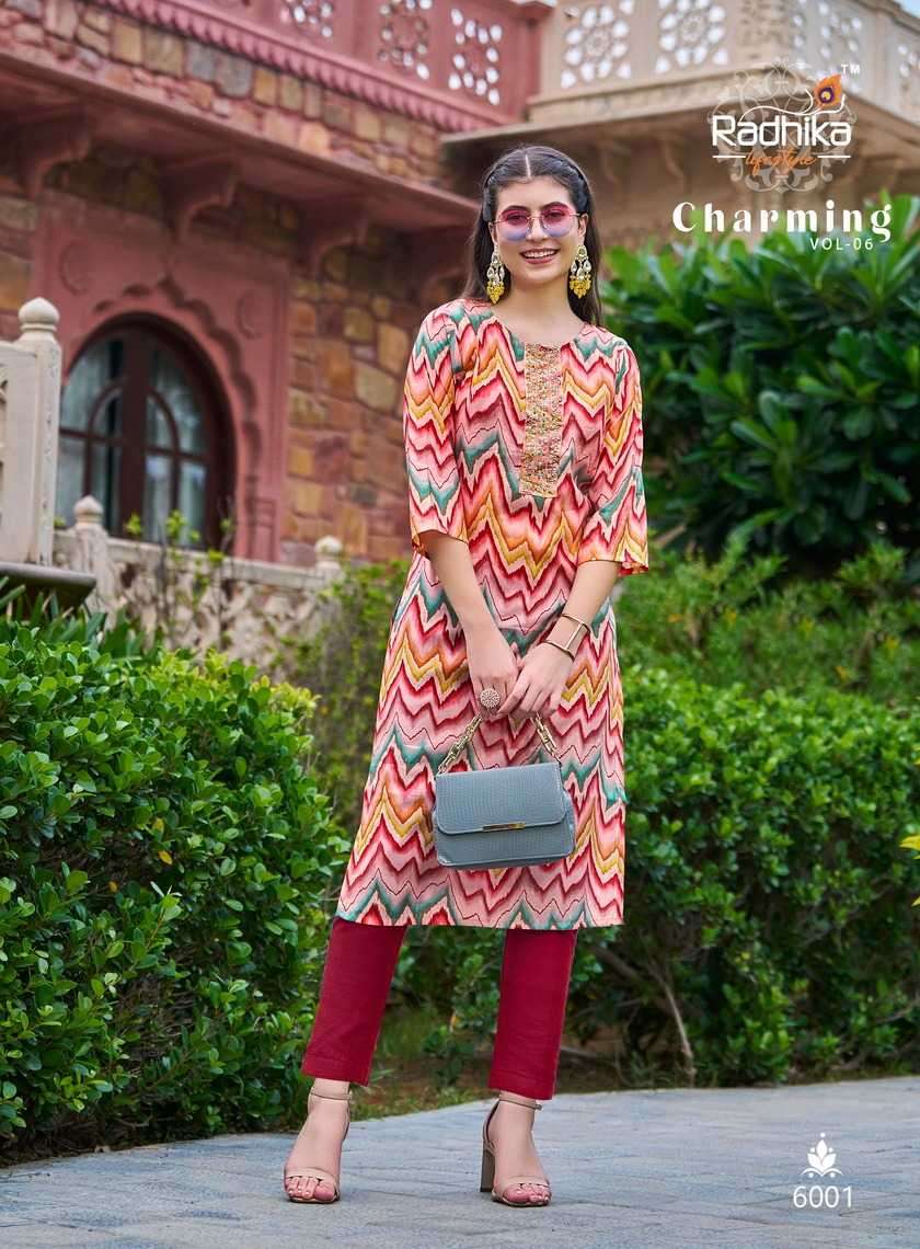 | Name: | radhika lifestyle-CHARMING VOL-6 SERIES 6001 TO 6006 KURTI BY RADHIKA |