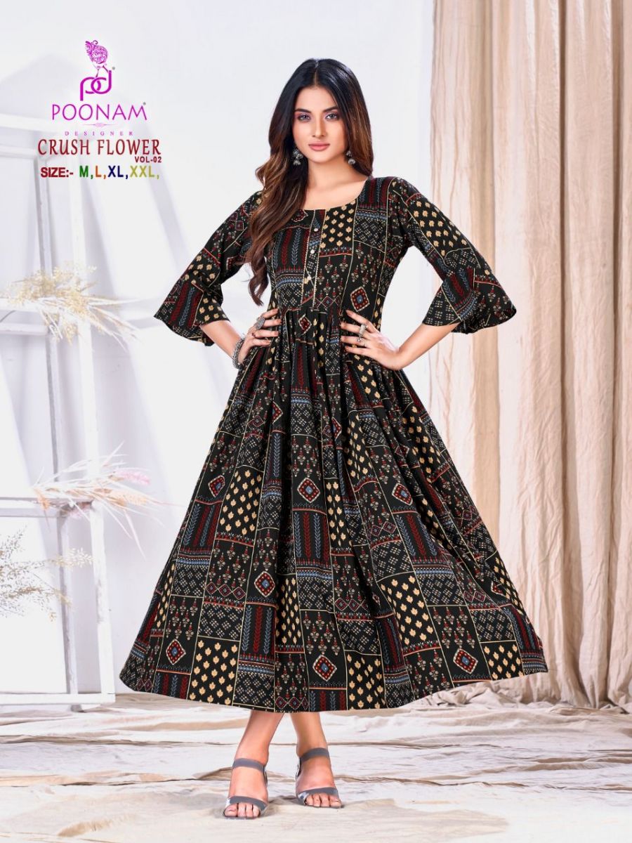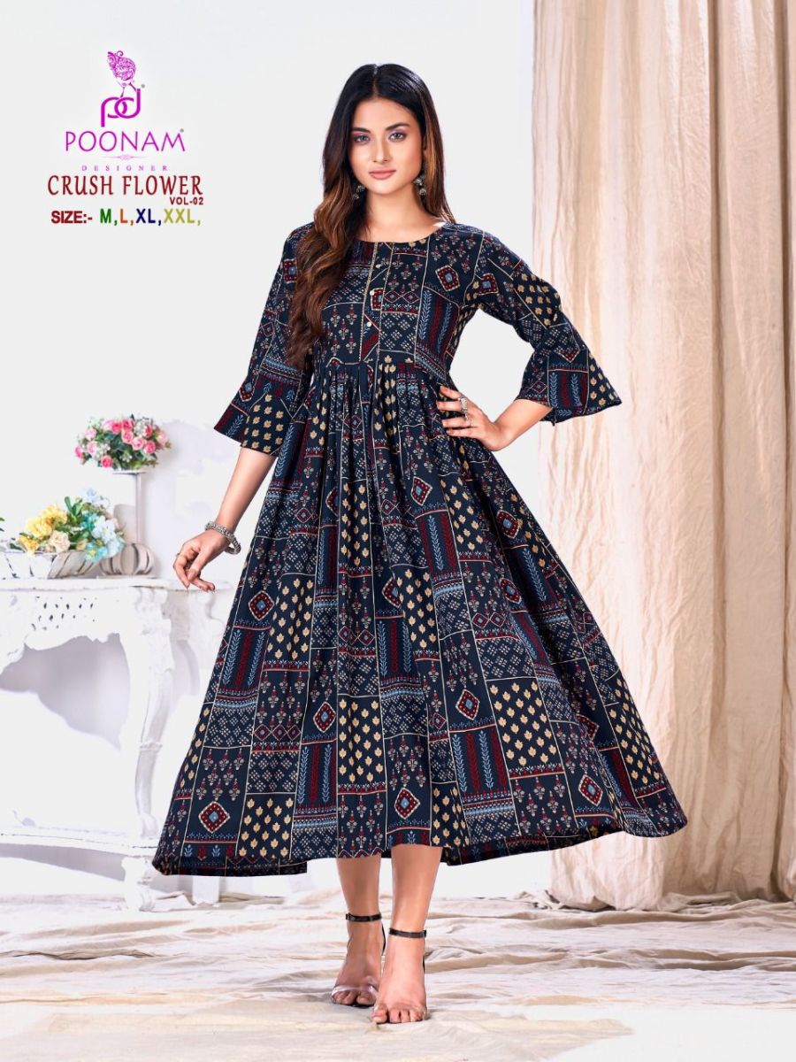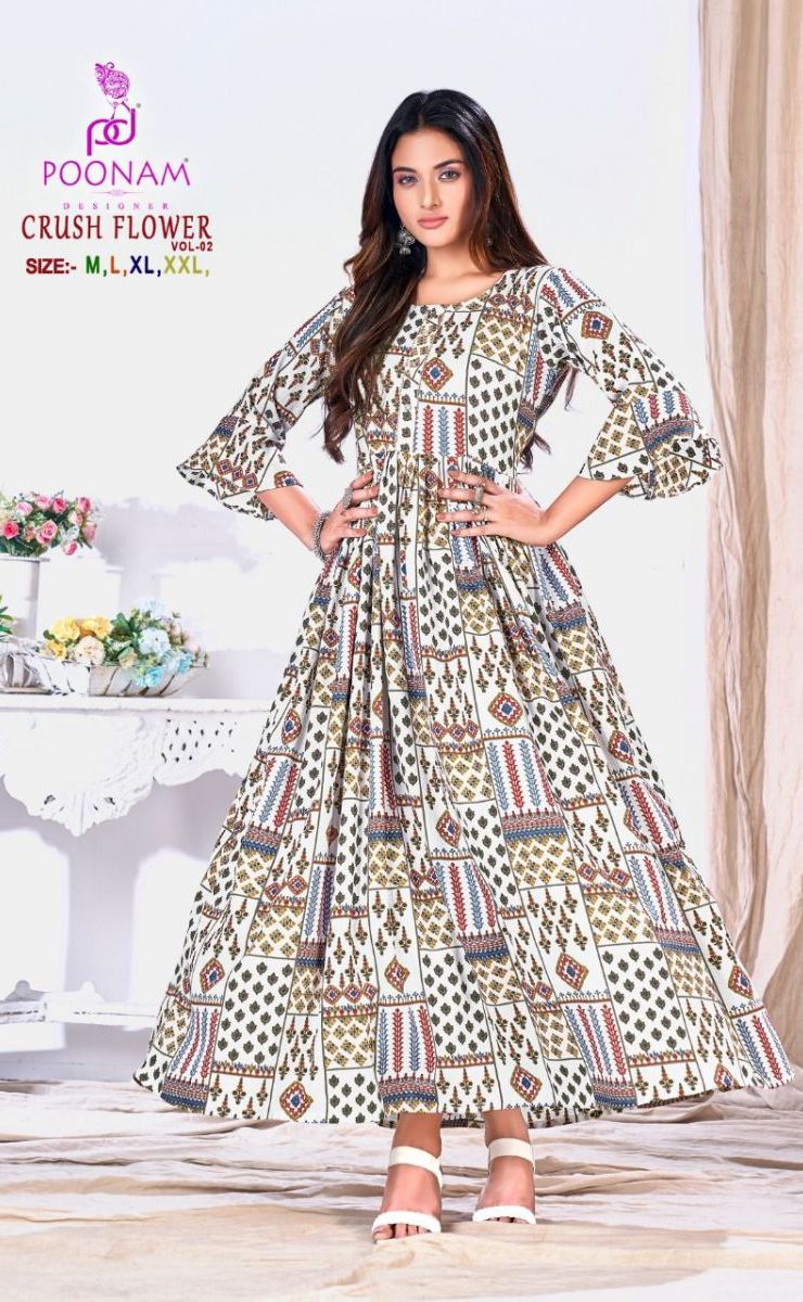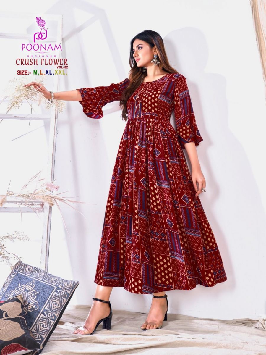 Crush Flower Vol-2 Kurti By Poonam Designer With Printed Gown Style Viscose Cotton Kurtis Are Available At Wholesale Price