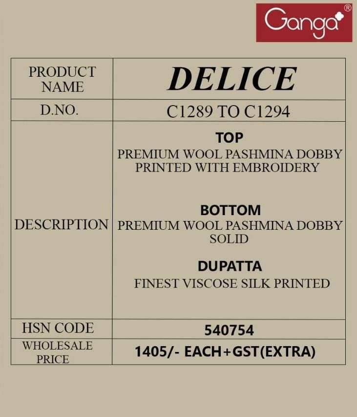 DELICE BY GANGA DESIGNER WITH EMBROIDERY WORK PASHMINA DOBBY SUITS ARE AVAILABLE AT WHOLESALE PRICE