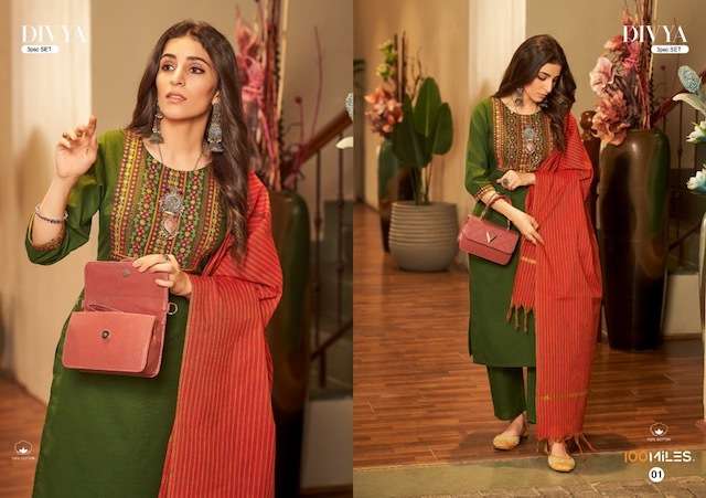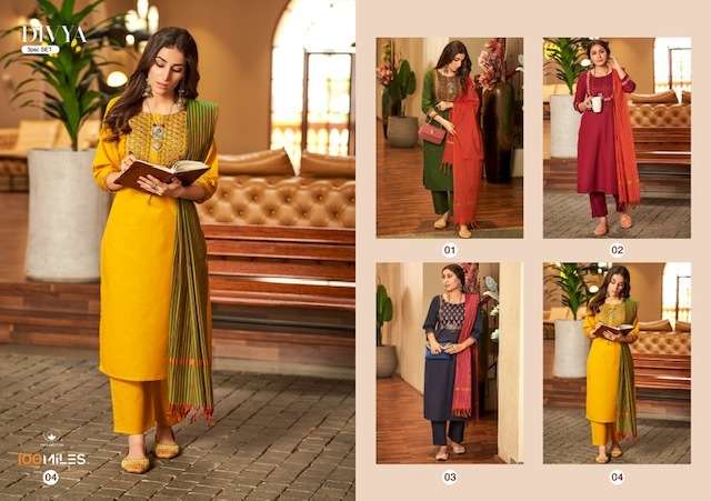 DIVYA KURTI BY 100 MILES DESIGNER WITH WORK COTTON KURTI WITH PANT AND DUPATTA ARE AVAILABLE AT WHOLESALE PRICE