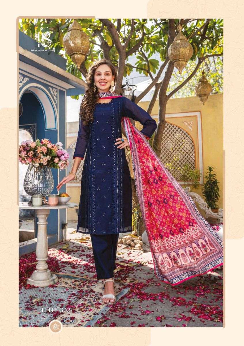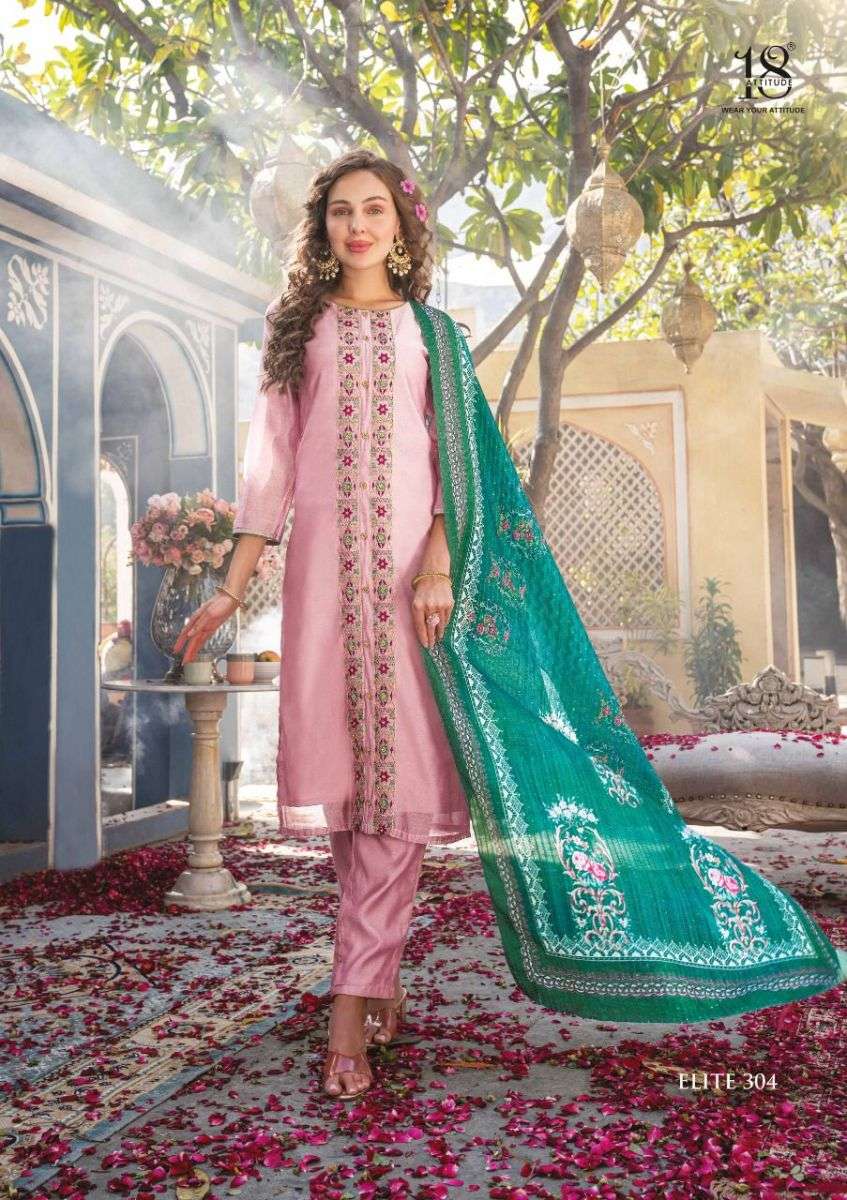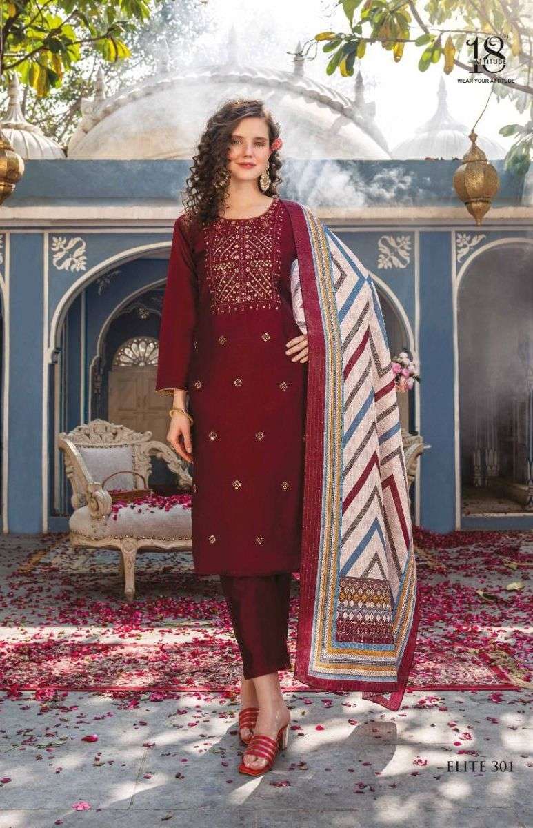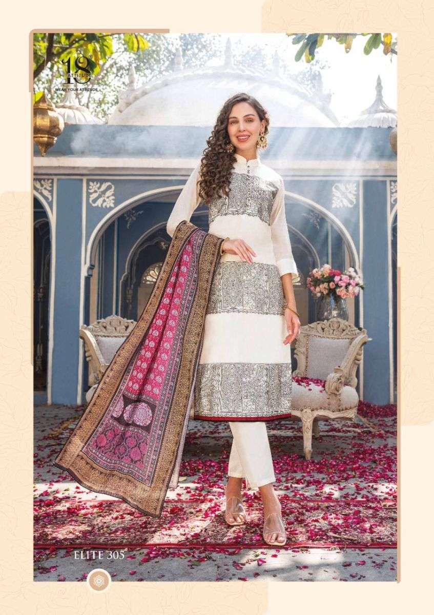 ELITE VOL-3 KURTI BY 18 AATITUDE DESIGNER WITH WORK CHANDERI KURTI WITH PANT AND DUPATTA ARE AVAILABLE AT WHOLESALE PRICE