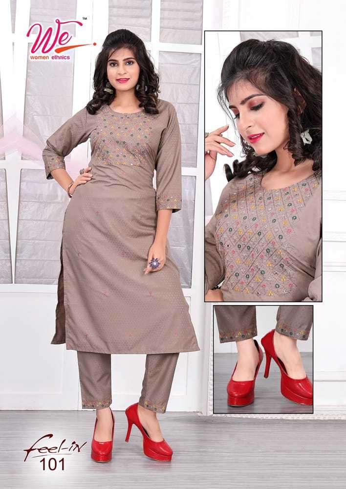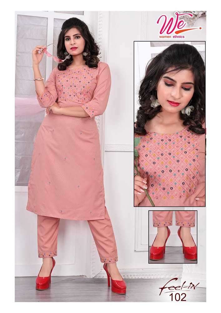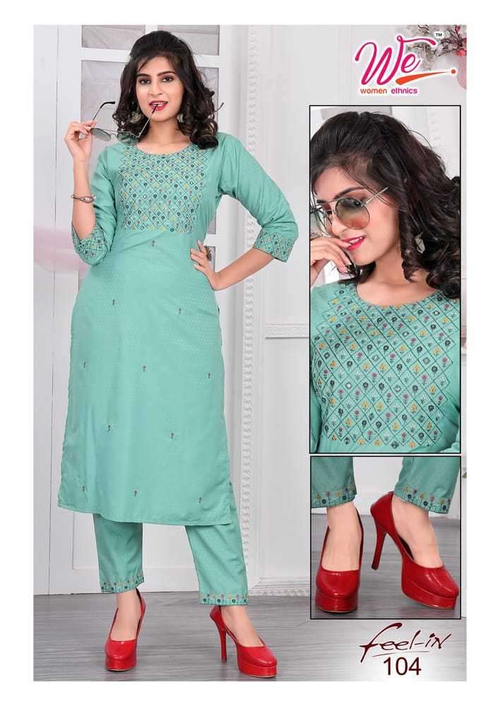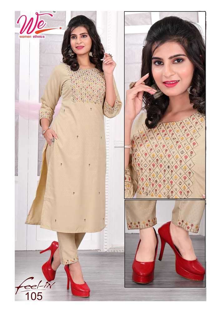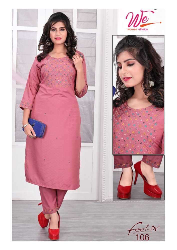 FEEL IN KURTI BY WE DESIGNER WITH EMBROIDERY WORK DOBBY KURTI WITH PANT ARE AVAILABLE AT WHOLESALE PRICE
