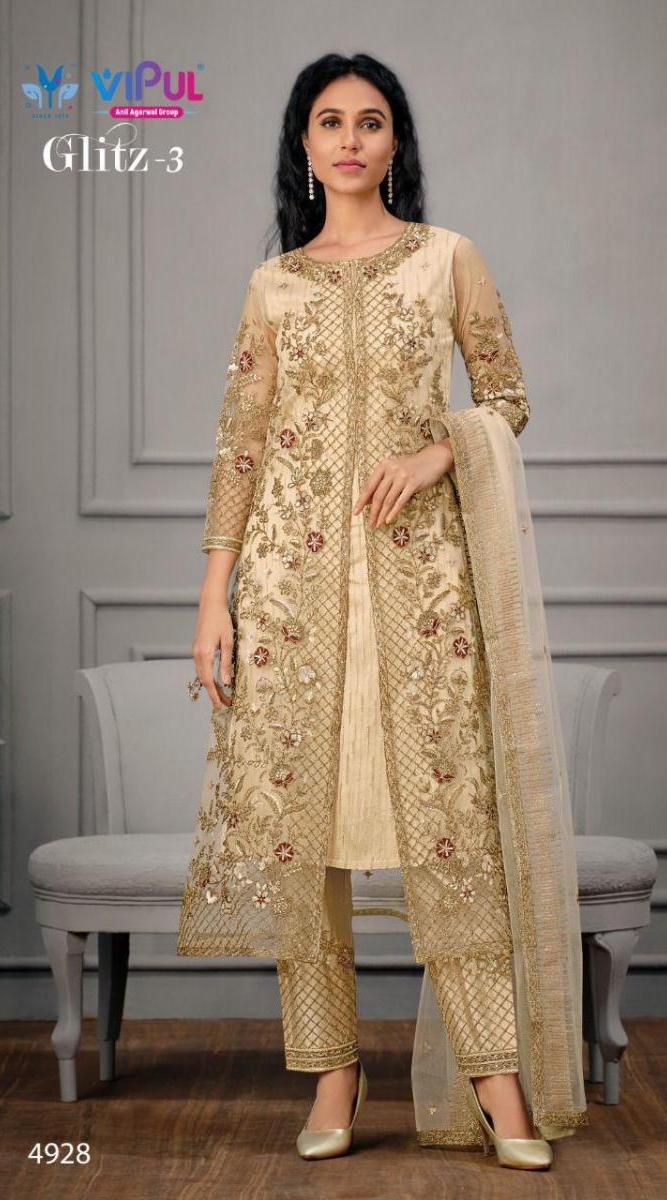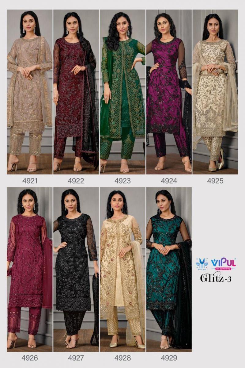 Glitz Vol-3 By Vipul Designer With Embroidery And Hand Work Satin Suits Are Available In Singles At Wholesale Price
