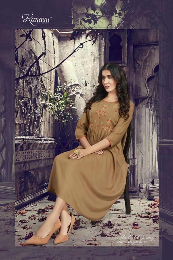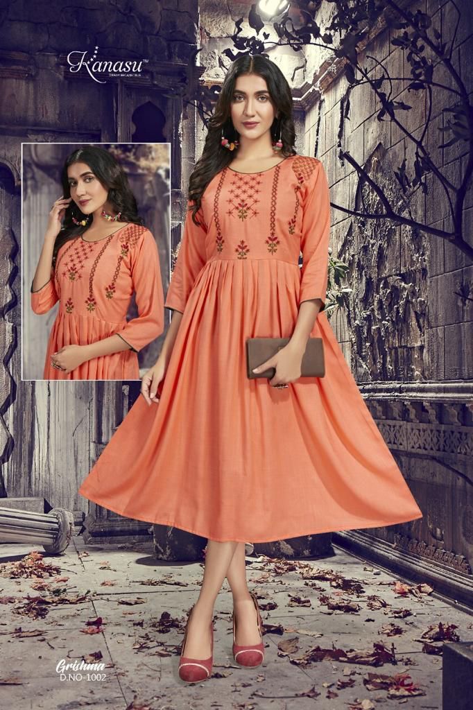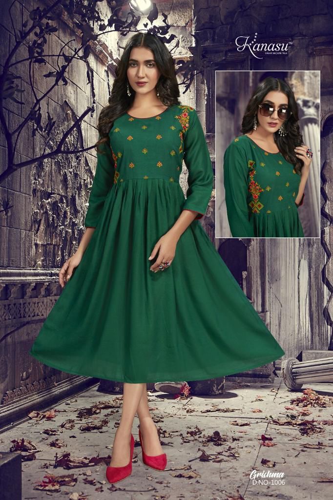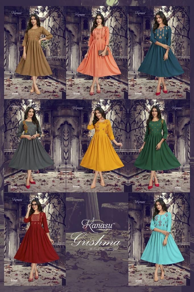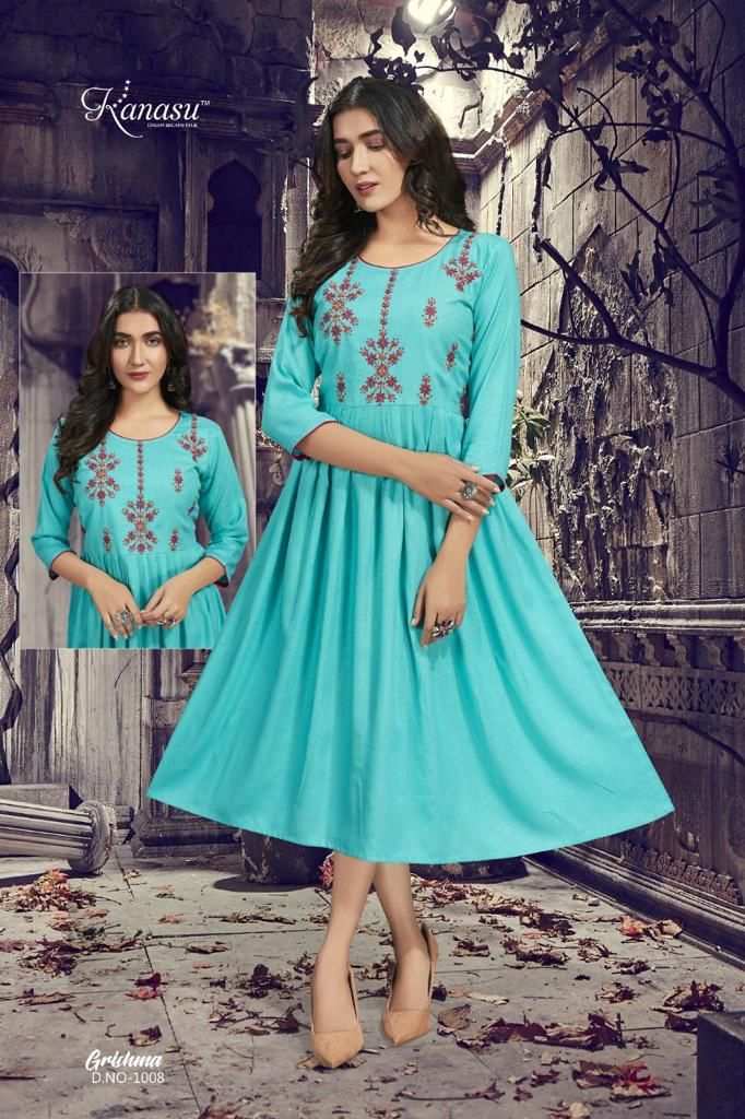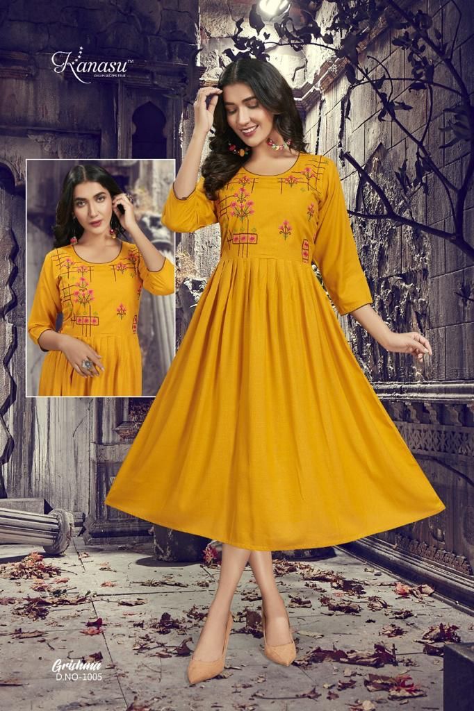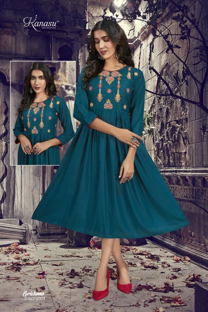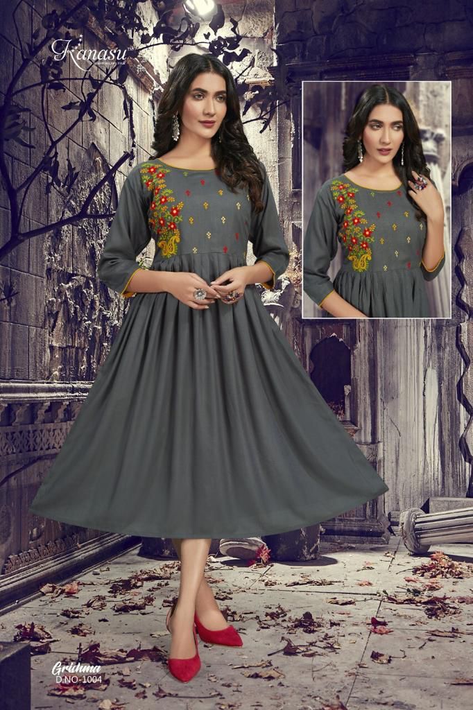 Grishma Kurti By Kanasu Designer With Work Gown Style Rayon Kurtis Are Available At Wholesale Price