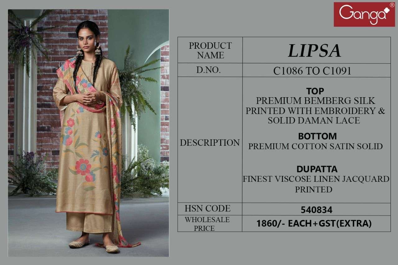 LIPSA BY GANGA DESIGNER WITH PRINTED AND EMBROIDERY WORK BEMBERG SILK SUITS ARE AVAILABLE AT WHOLESALE PRICE
