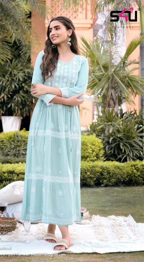 Lucknowi Kurti By S4u Designer With Work And Printed Viscose Rayon Gowns Are Available At Wholesale Price