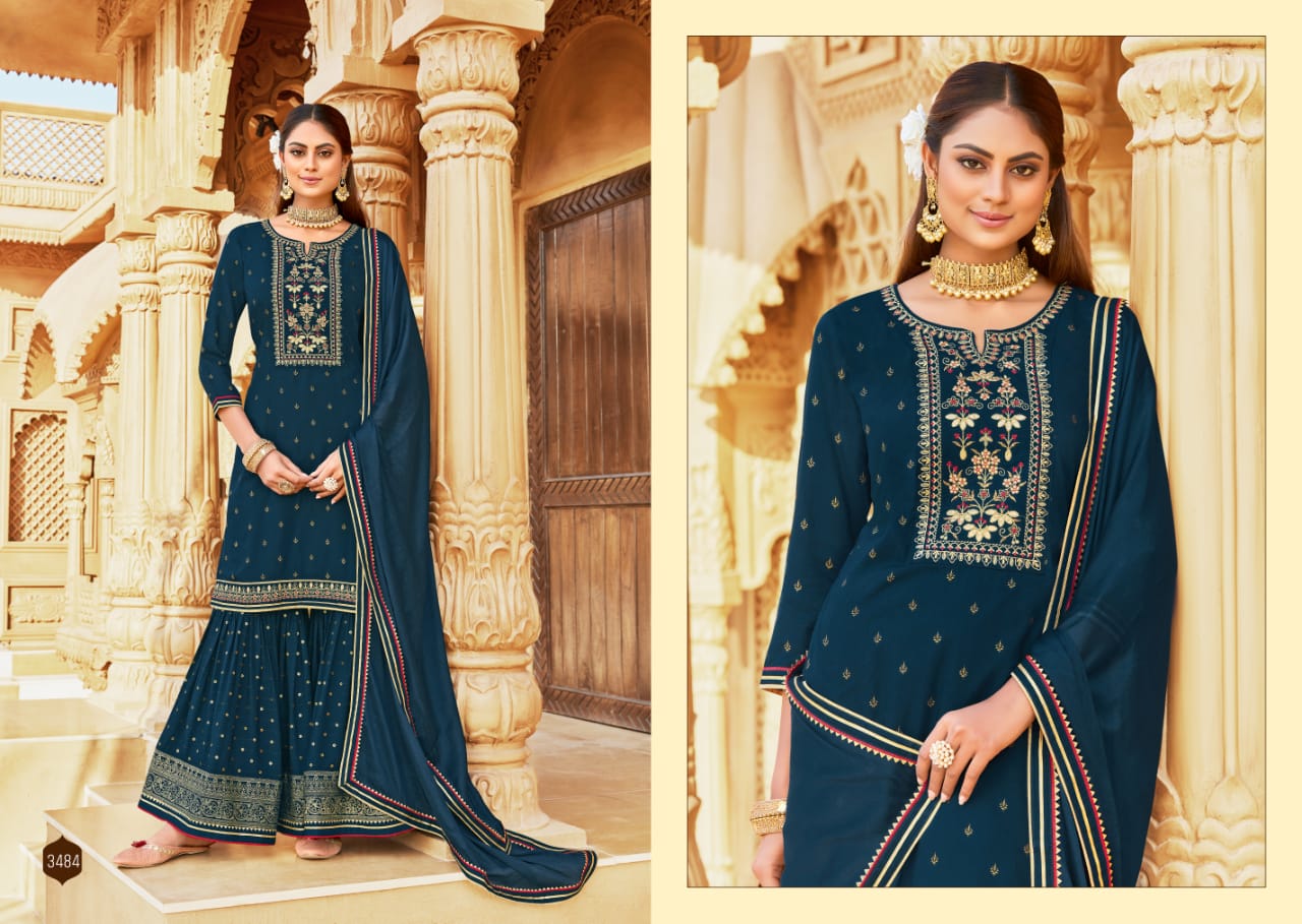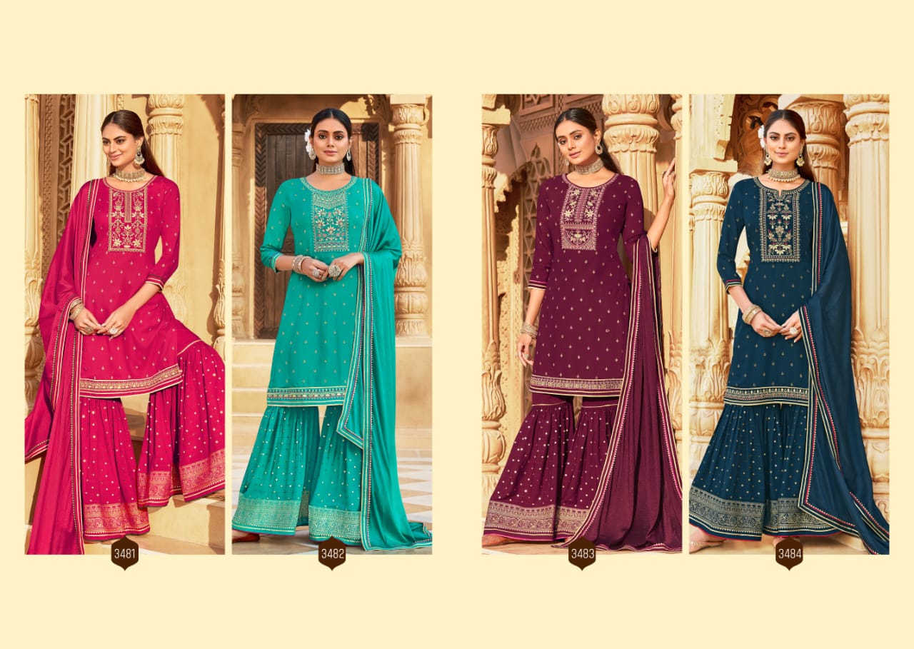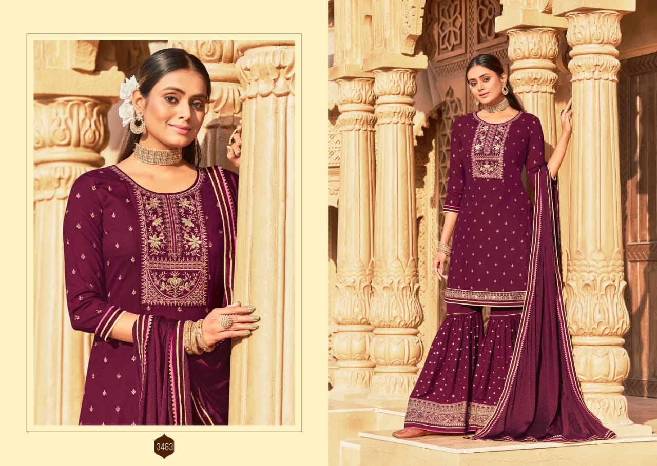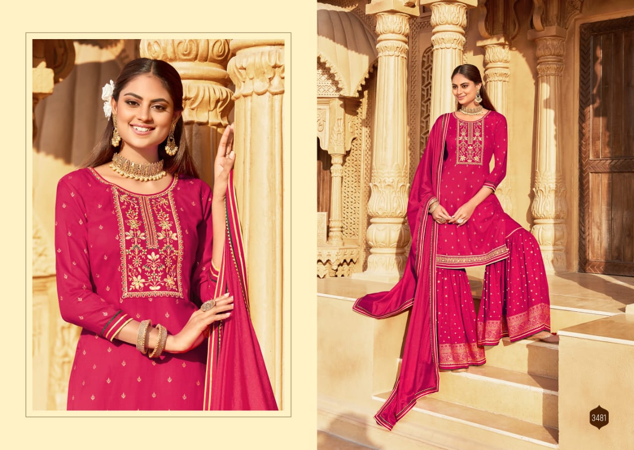 Madhubala By Rangoon Designer With Work Rayon Kurti With Sharara And Dupatta Are Available At Wholesale Price