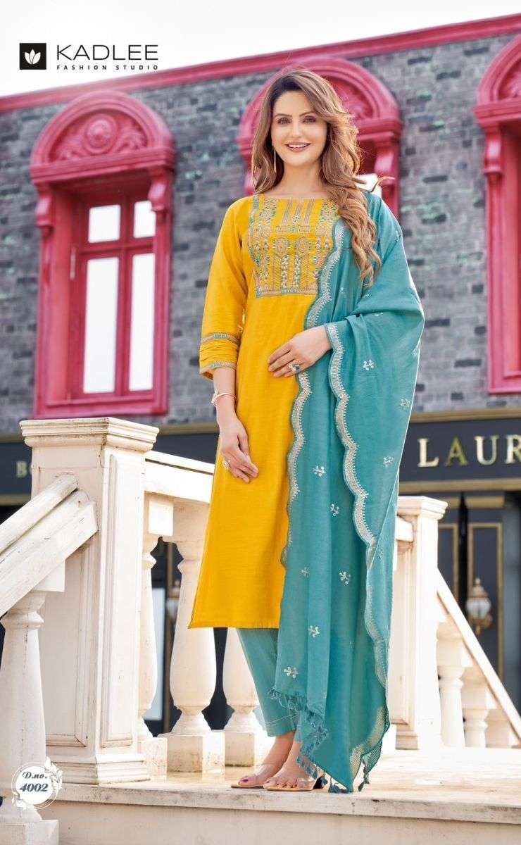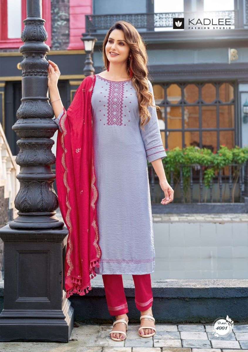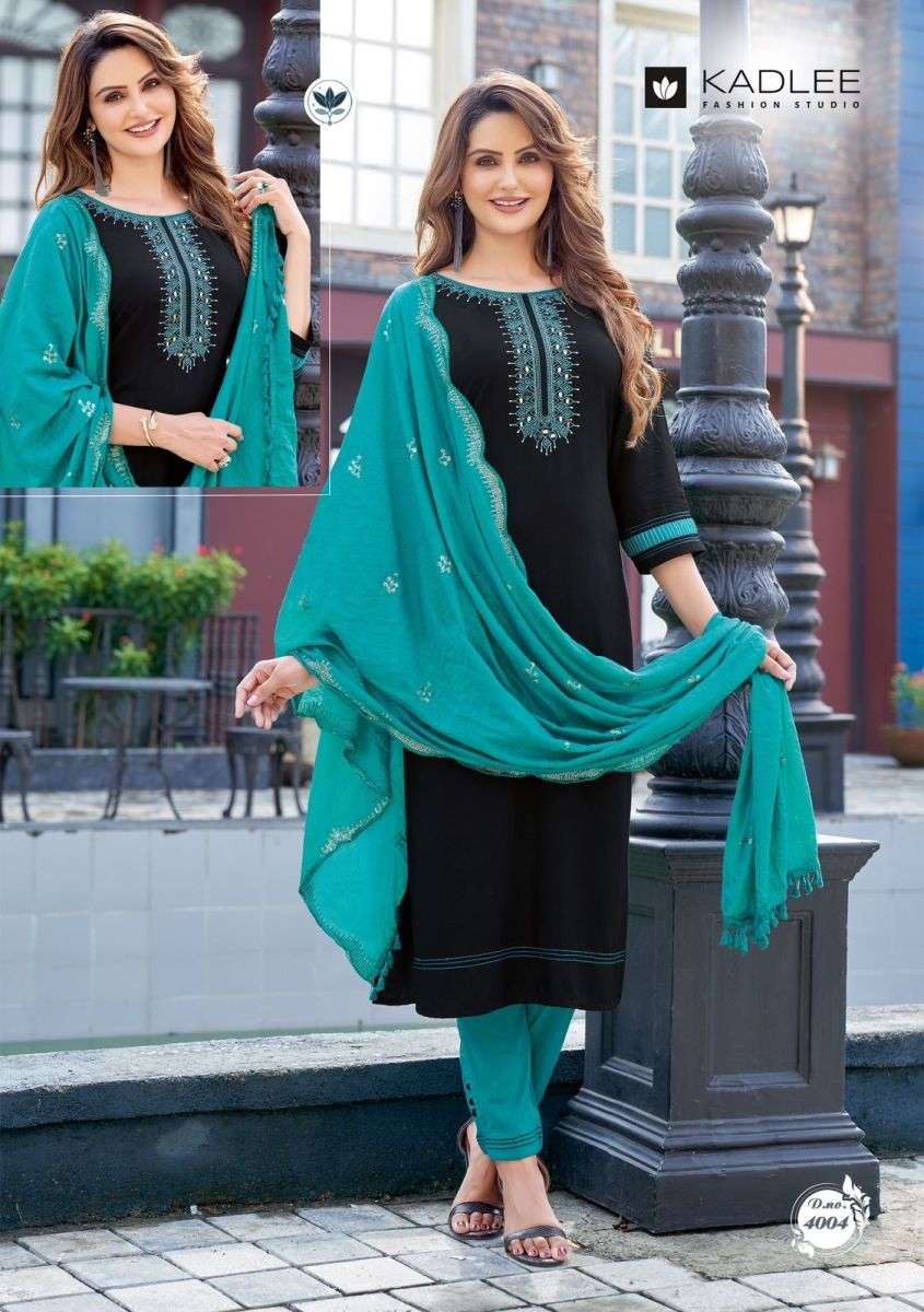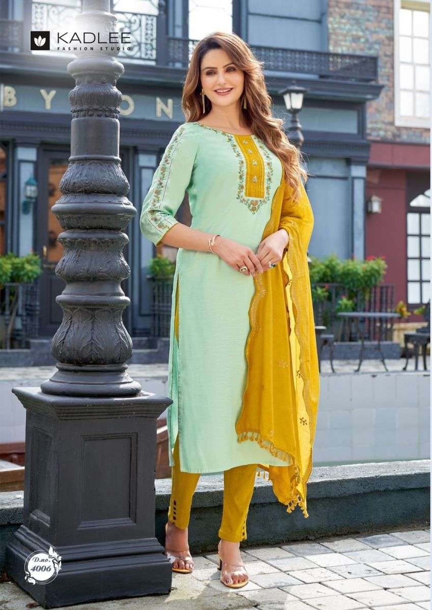 MANNAT KURTI BY KADLEE DESIGNER WITH WORK NAYLON VISCOSE KURTI WITH PANT AND DUPATTA ARE AVAILABLE AT WHOLESALE PRICE