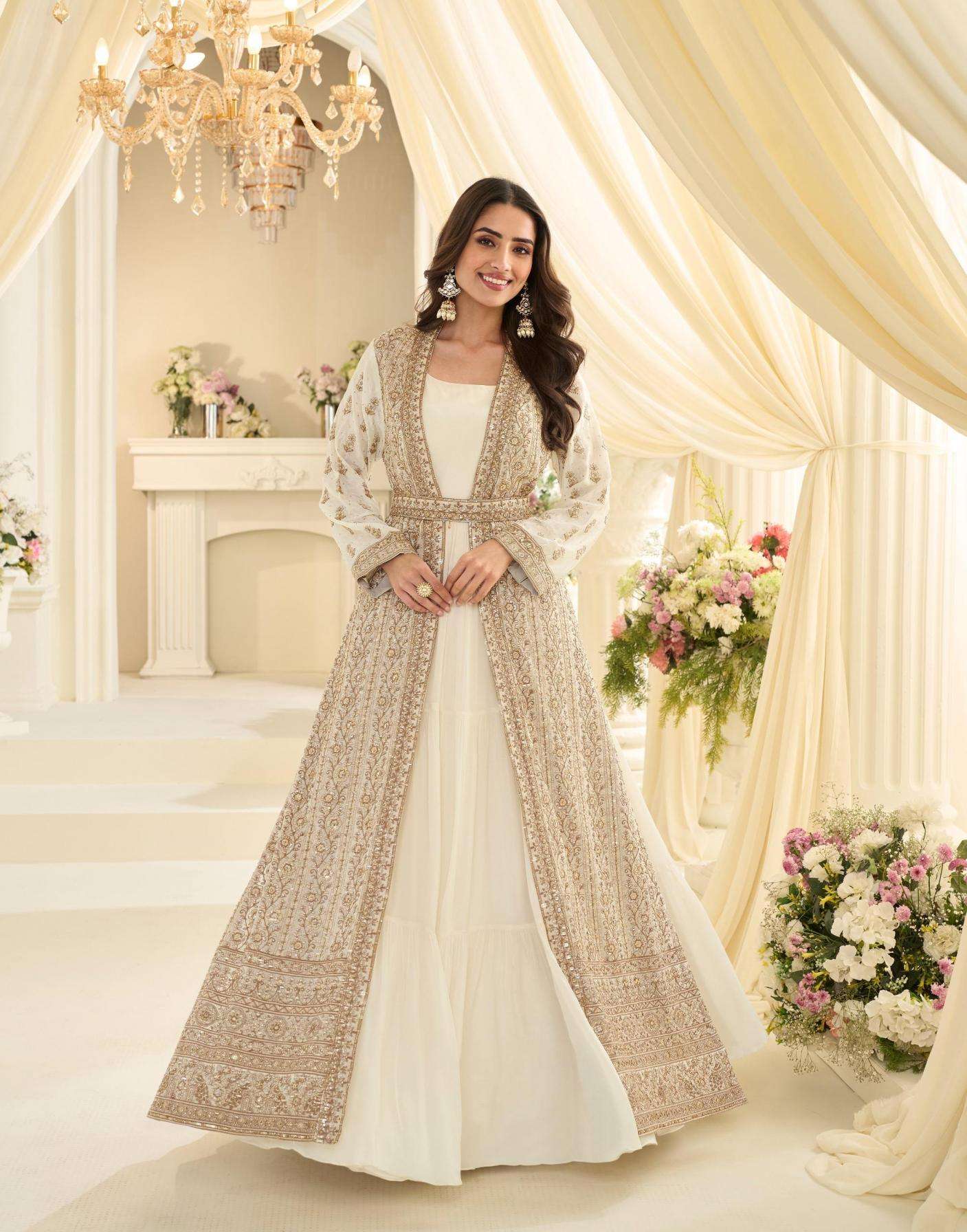 FABRIC - PREMIUM REAL CHİNON SILK ( TREDY FESTIVE LOOK FRONT AND BACK HEAVY EMBROIDERED JACKET WITH BELT AND CHINON SILK GOWN )