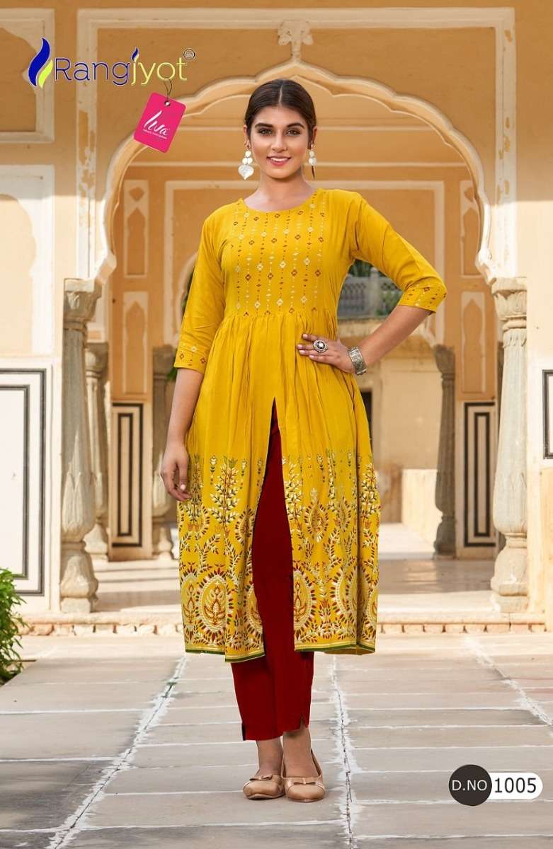 MIHIRA KURTI BY RANGJYOT DESIGNER WITH GOLD PRINTED RAYON 14KG KURTIS ARE AVAILABLE AT WHOLESALE PRICE