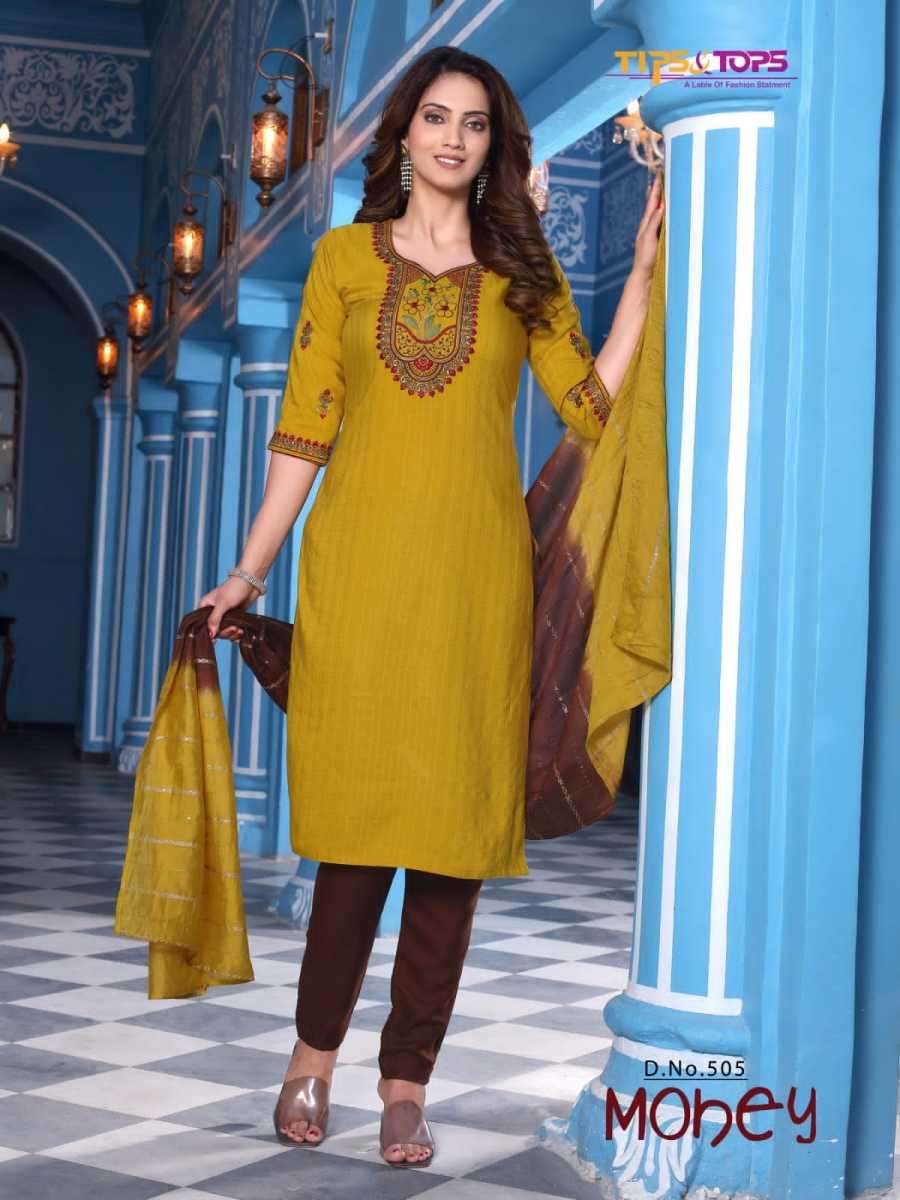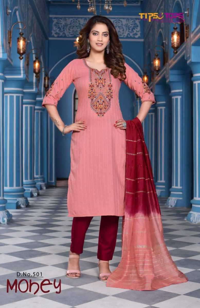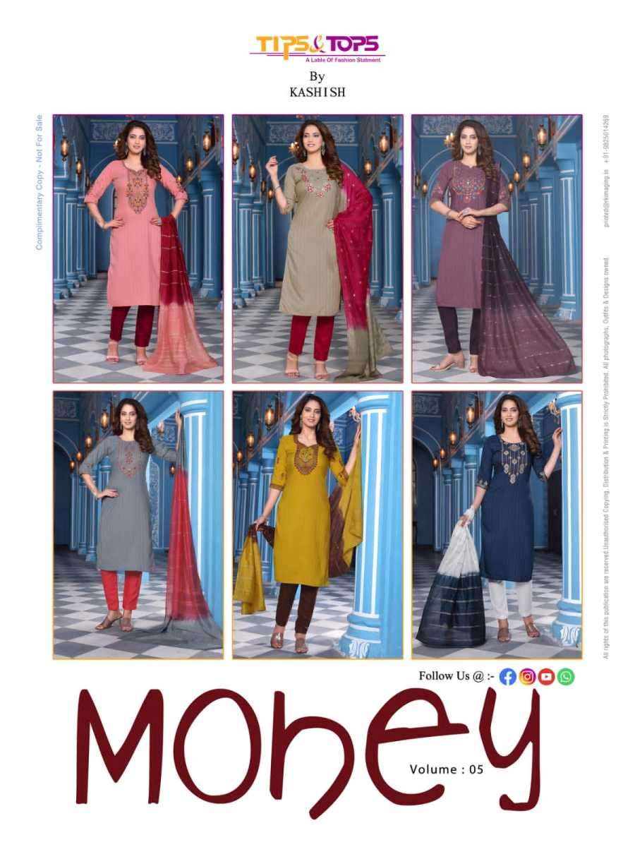 MOHEY VOL-5 BY TIPS & TOPS DESIGNER WITH WORK VISCOSE CHINON KURTI WITH BOTTOM AND DUPATTA ARE AVAILABLE AT WHOLESALE PRICE