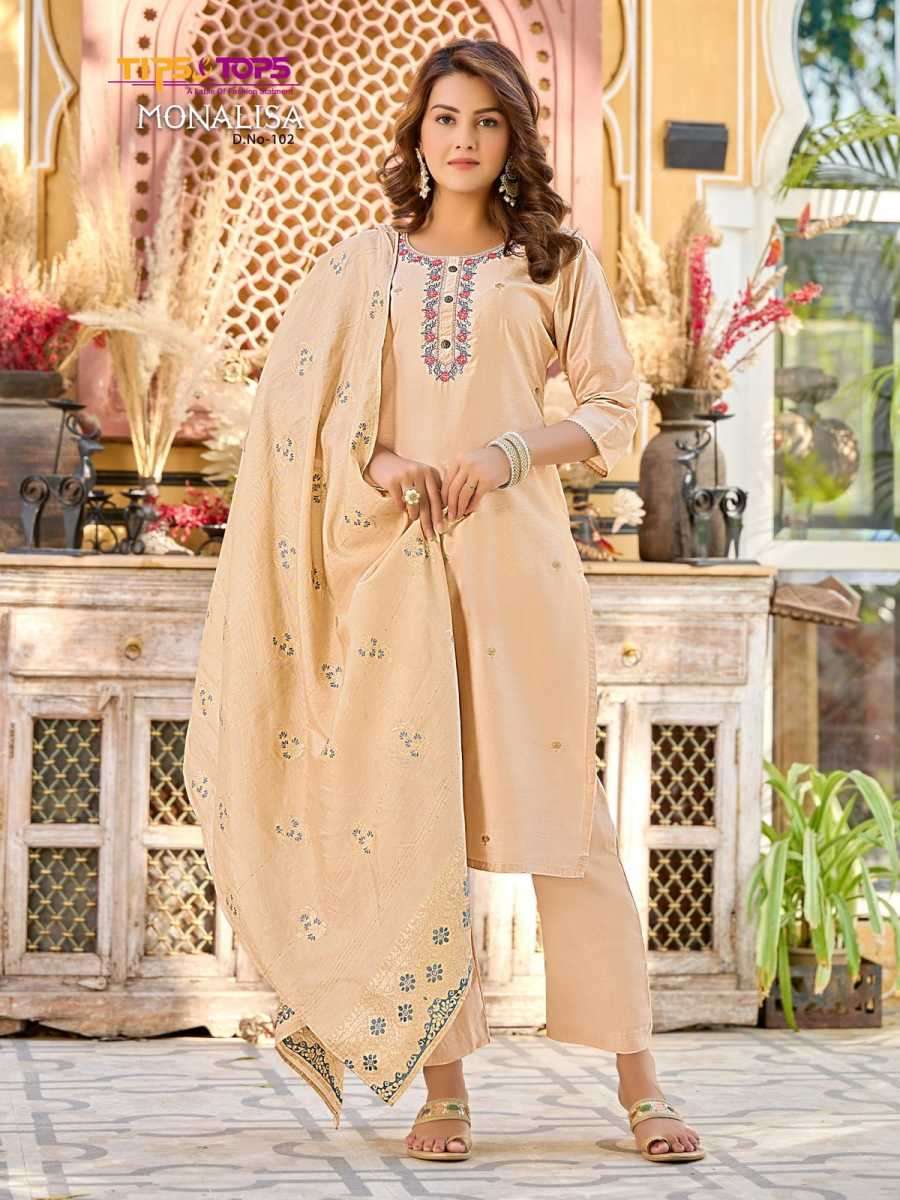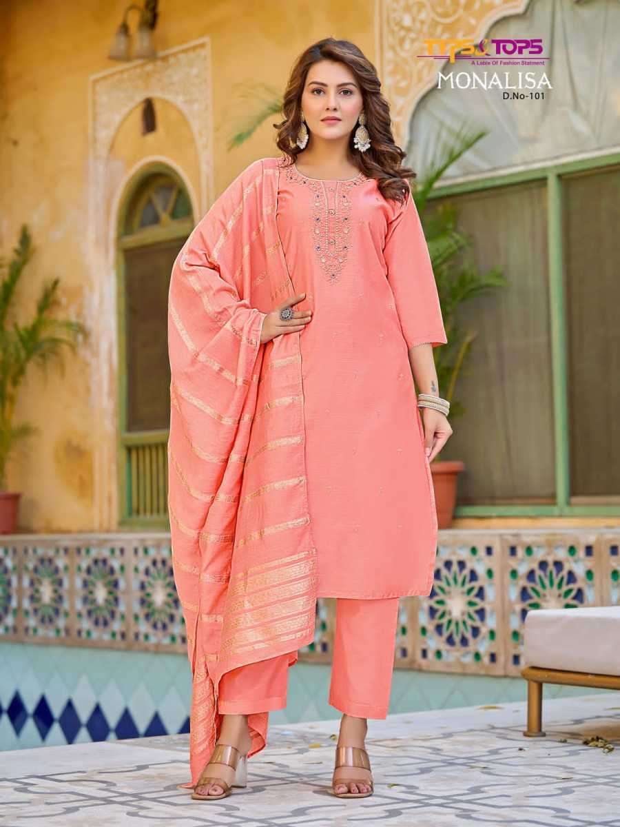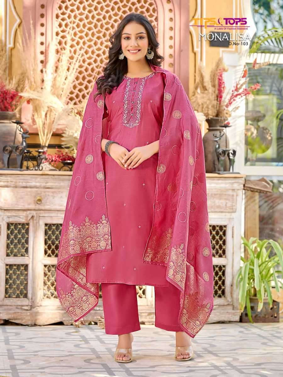 MONALISA BY TIPS & TOPS DESIGNER WITH WORK VISCOSE CHANDERI SILK KURTI WITH PANT AND DUPATTA ARE AVAILABLE AT WHOLESALE PRICE