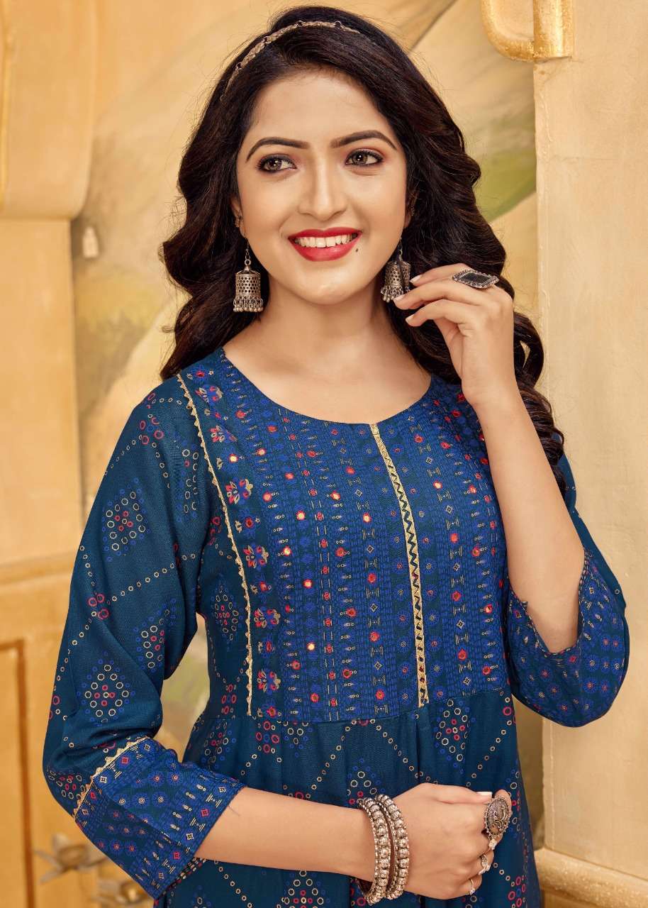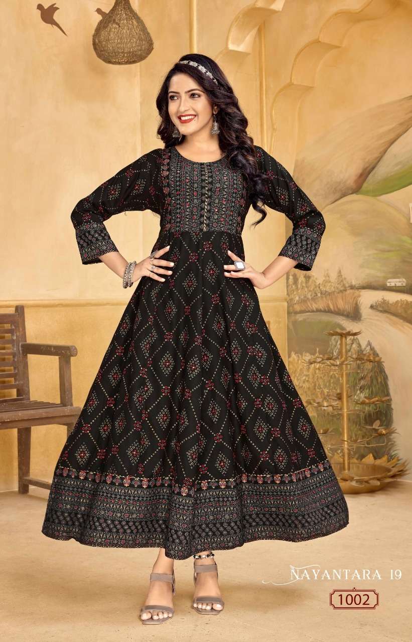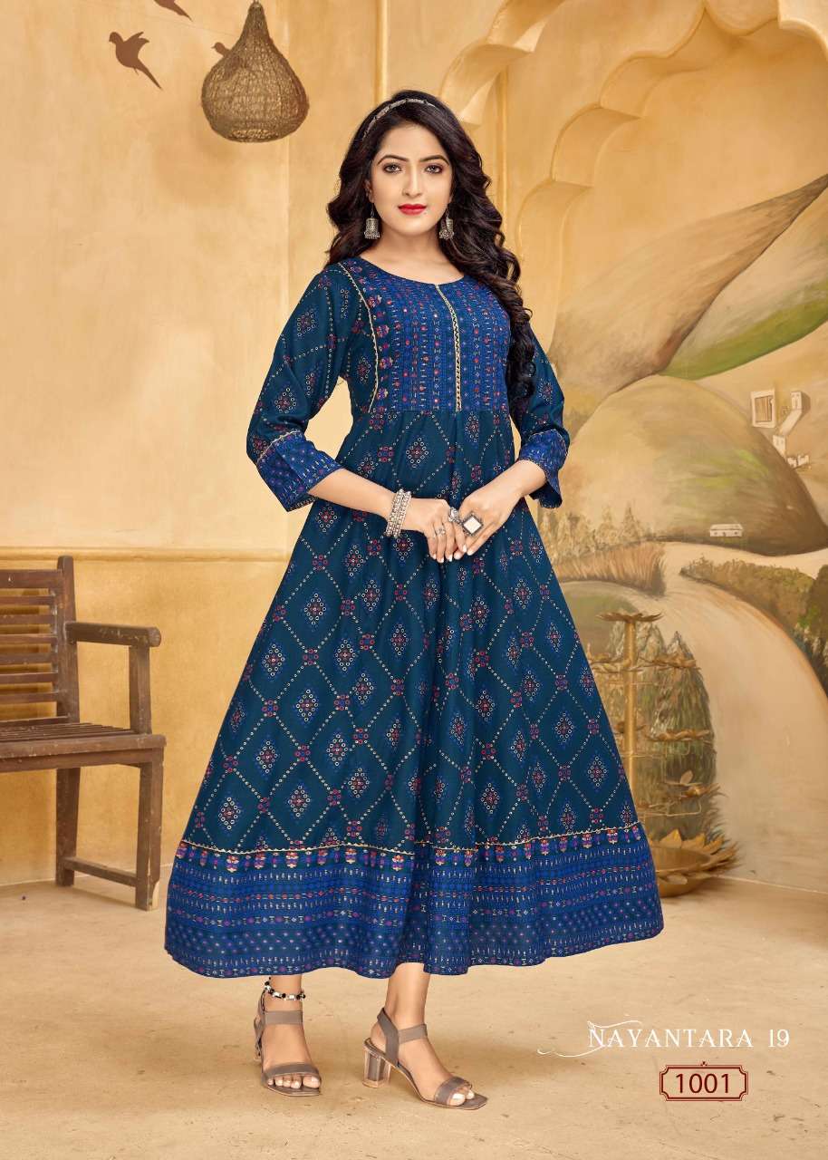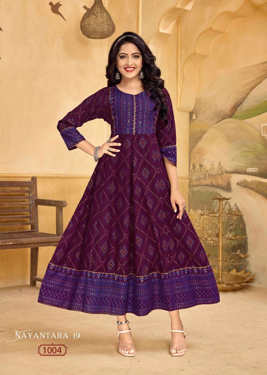NAYANTHATA VOL-19 KURTI BY BANWERY DESIGNER WITH FOIL PRINTED RAYON KURTIS ARE AVAILABLE AT WHOLESALE PRICE