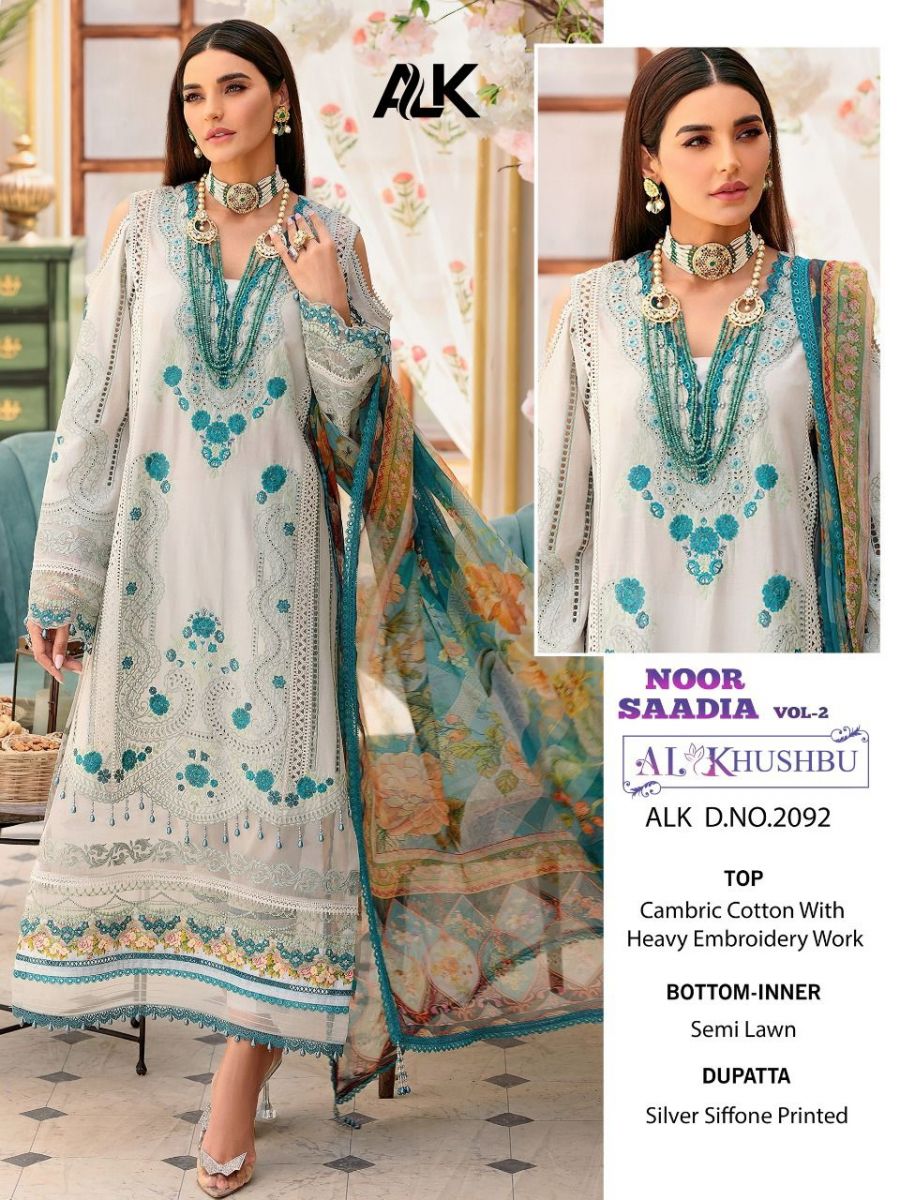 Noor Saadia Vol-2 By Al Khushbu Designer With Work Cambric Cotton Pakistani Style Suits Are Available At Wholesale Price
