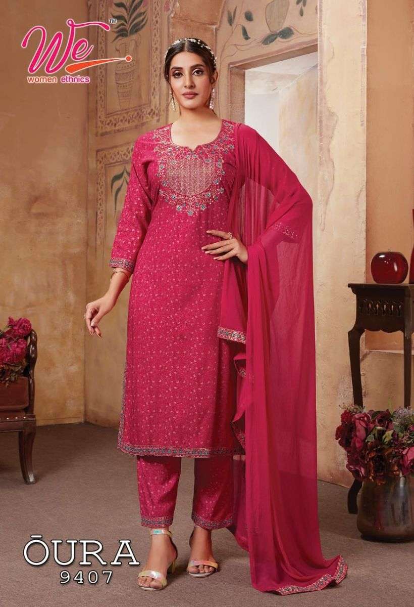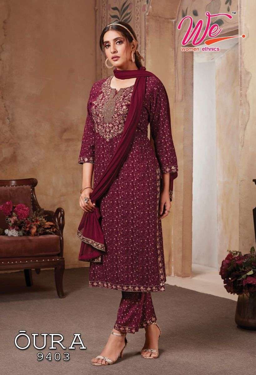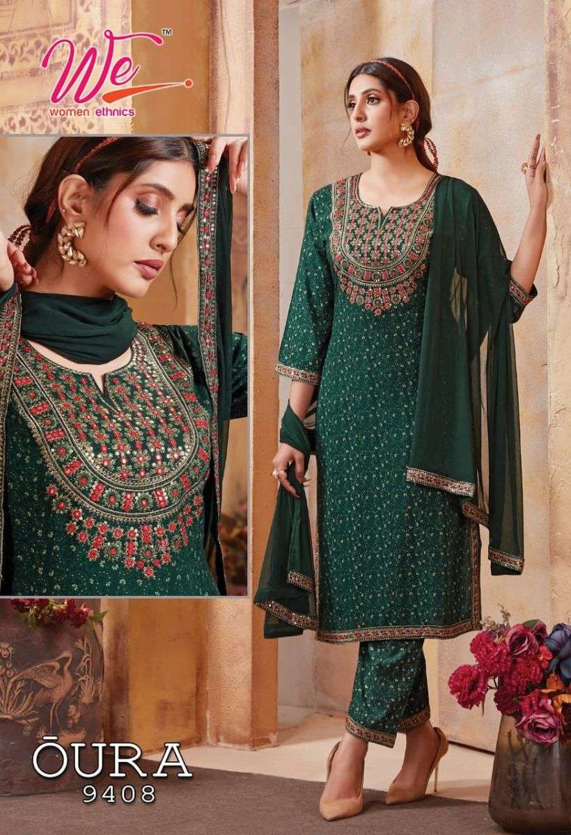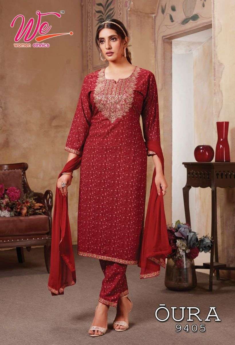 OURA KURTI BY WE DESIGNER WITH WORK RAYON KURTI WITH PANT AND DUPATTA ARE AVAILABLE AT WHOLESALE PRICE