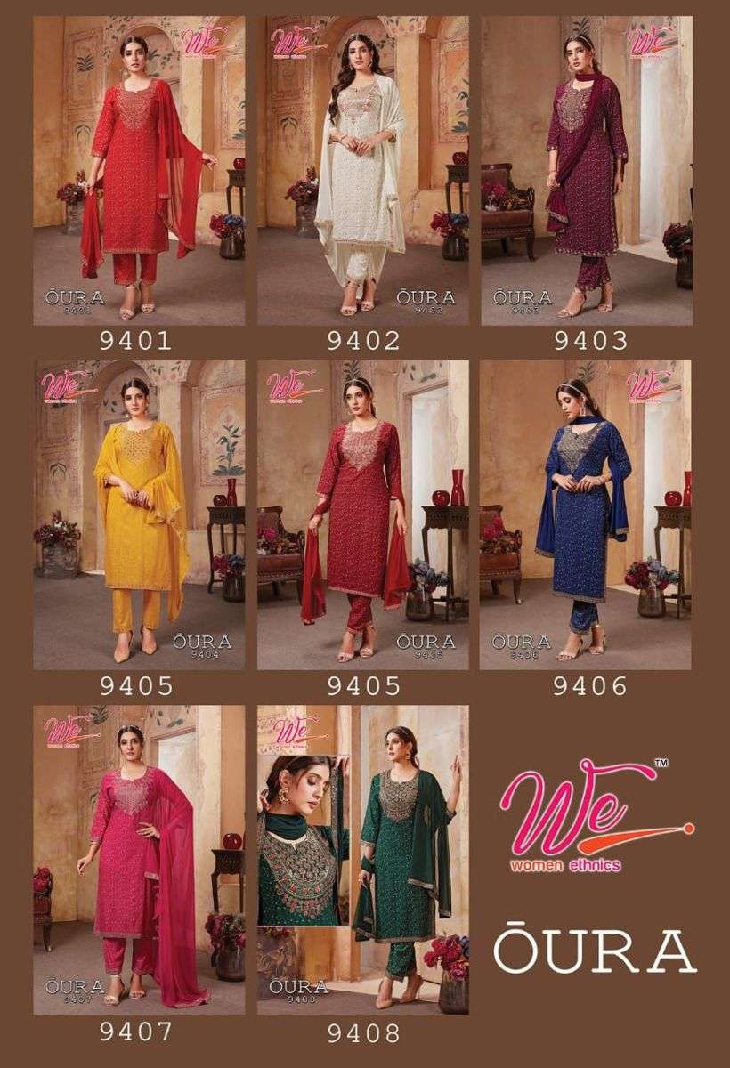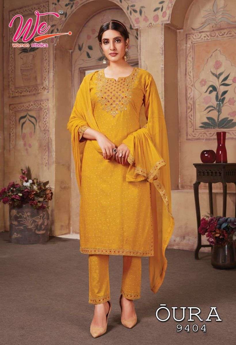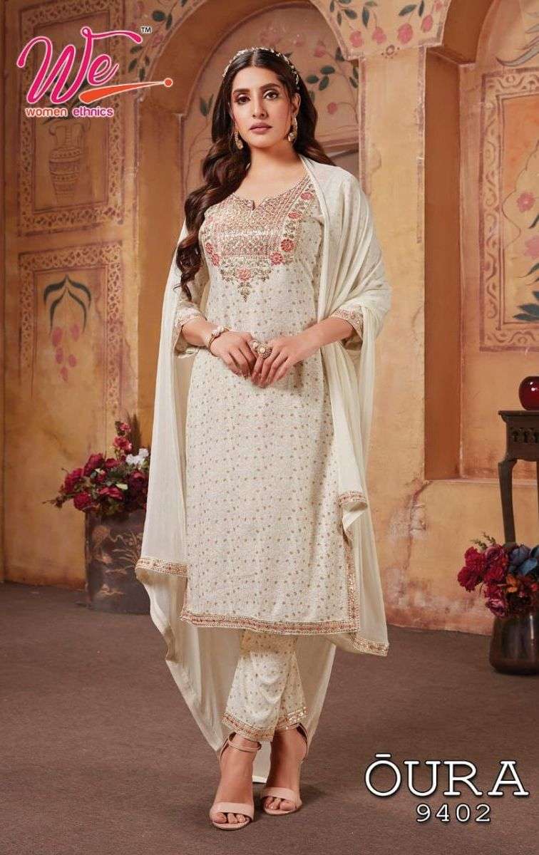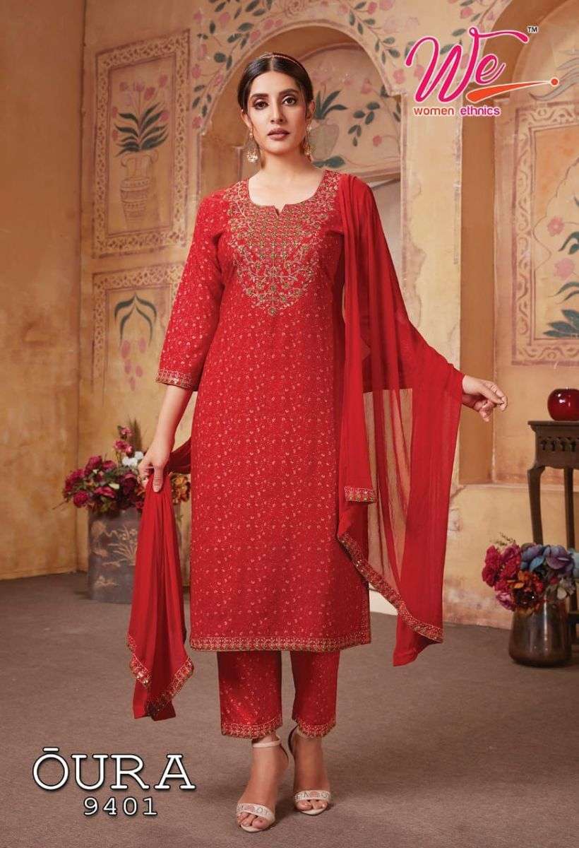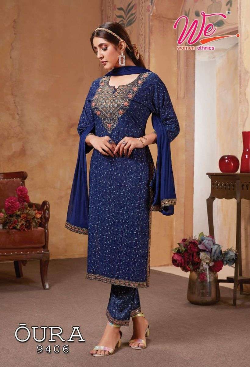 OURA KURTI BY WE DESIGNER WITH WORK RAYON KURTI WITH PANT AND DUPATTA ARE AVAILABLE AT WHOLESALE PRICE