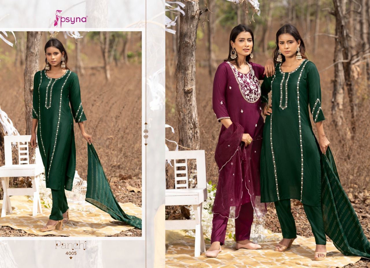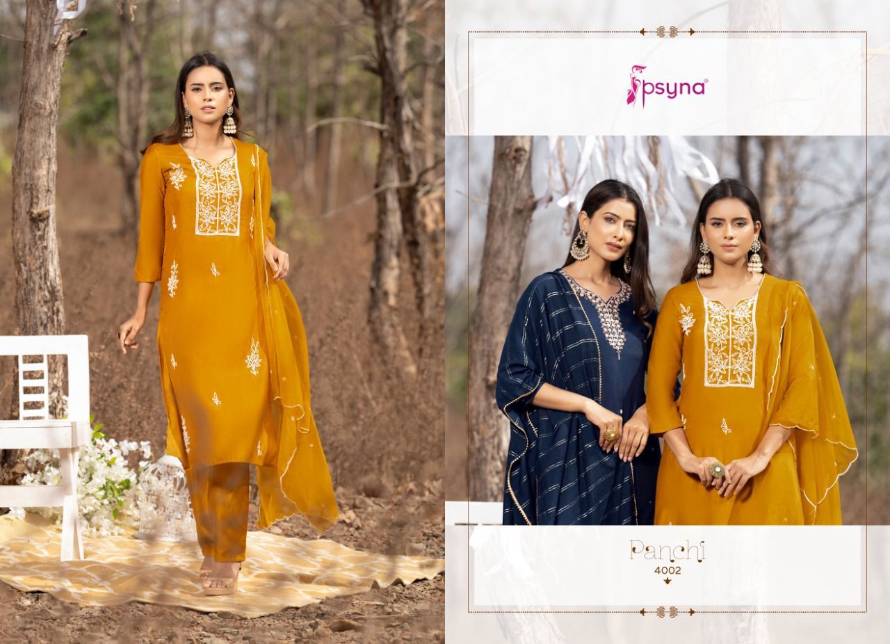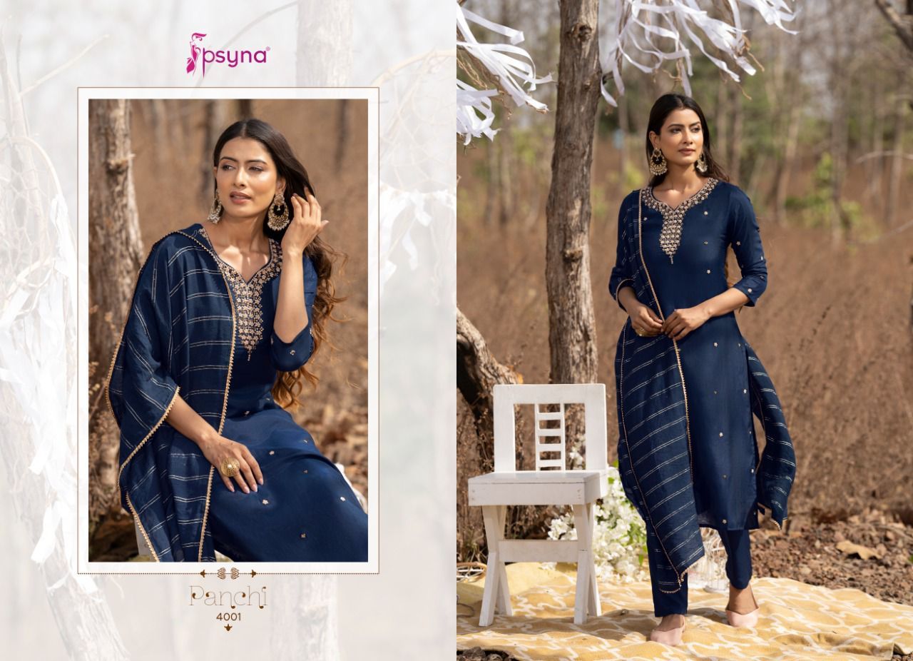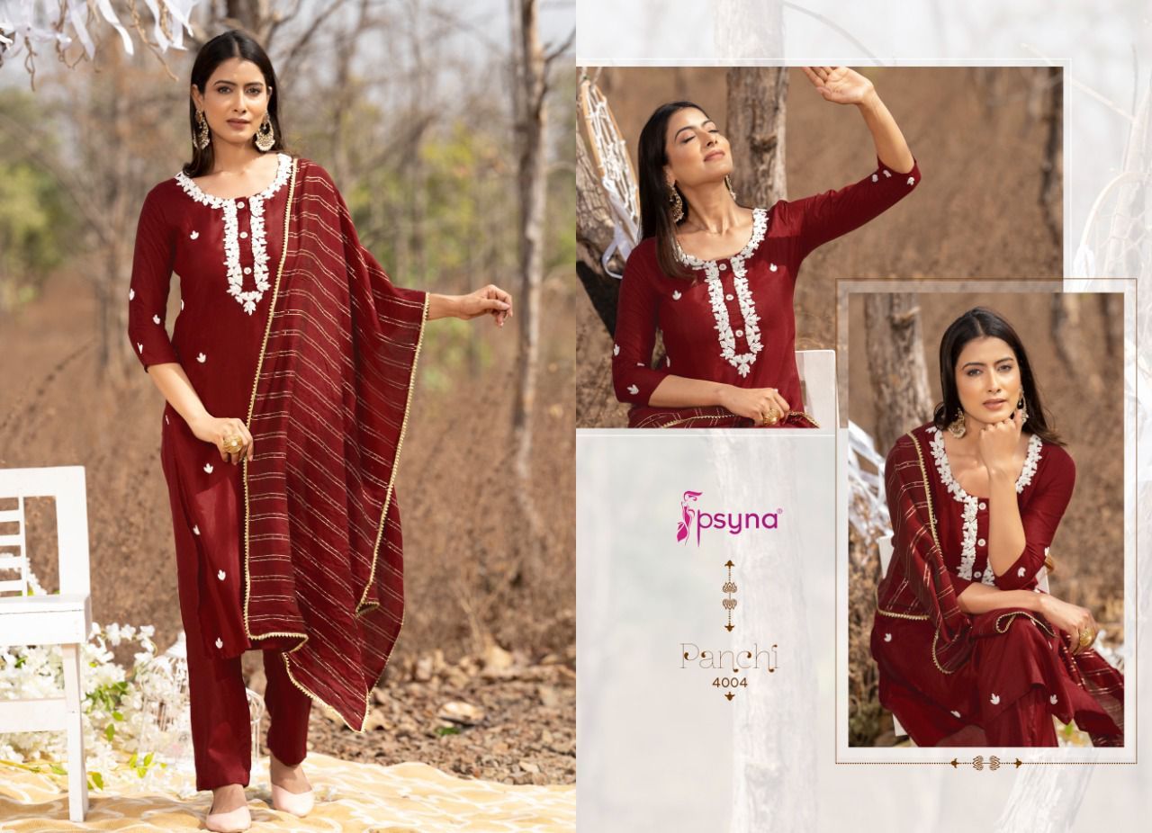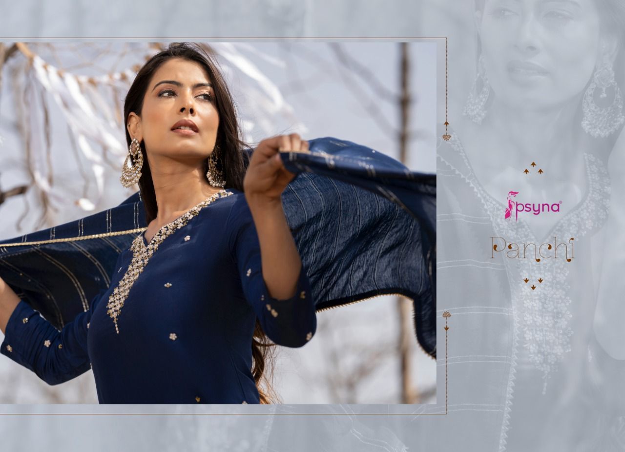 Panchi Vol-4 Kurti By Psyna Designer With Embroidery Work Muslin Kurti With Pant And Dupatta Are Available At Wholesale Price