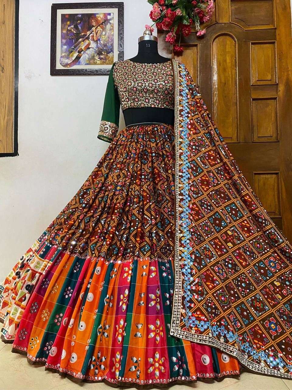 LEHENGA - HEAVY BUTTER SILK WITH DIGITAL PRINT & 4 MTR FLAIR FULLY STITCH WITH FULLY REAL MIRROR WORK