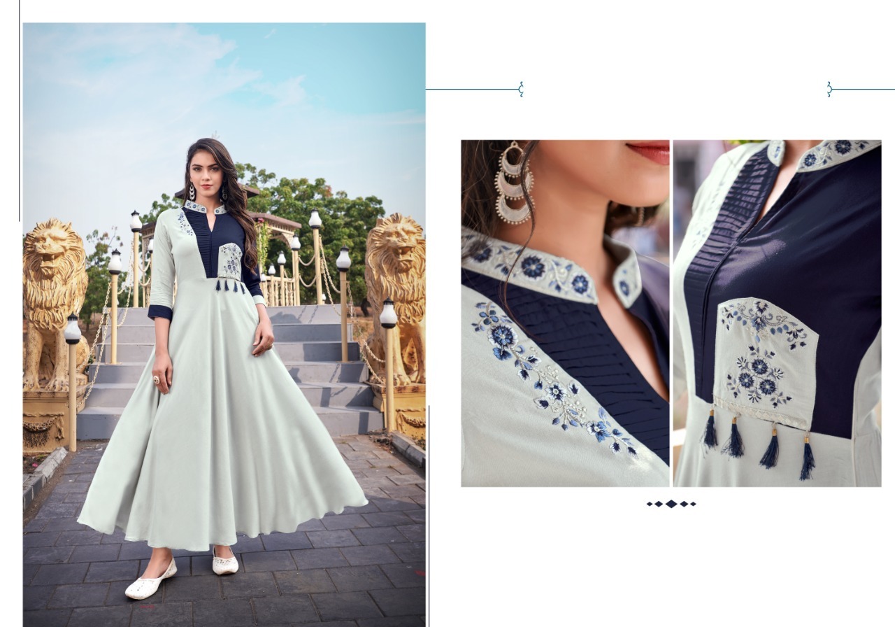 Ravia Vol-1 Kurti By Vardan Designer With Embroidery Work Rayon Long Gown Style Kurtis Are Available At Wholesale Price