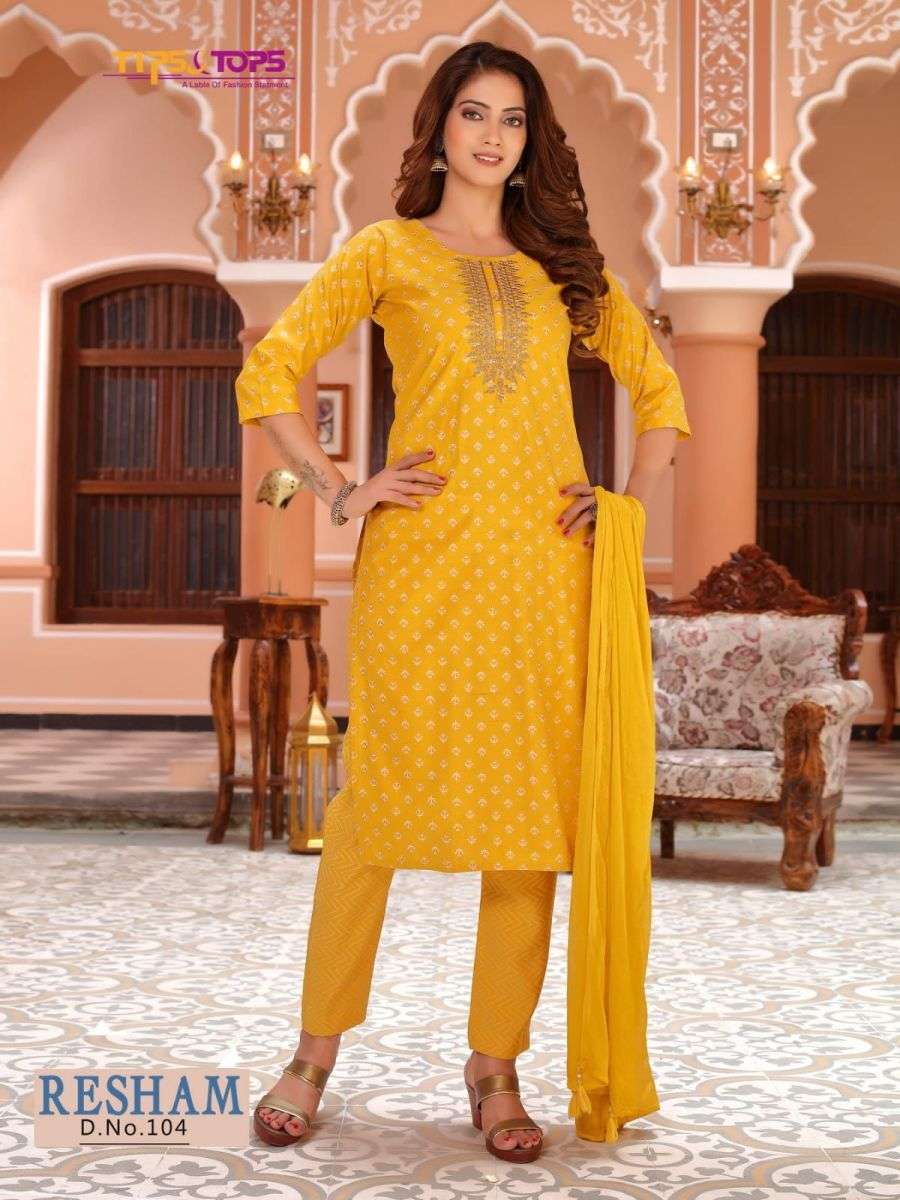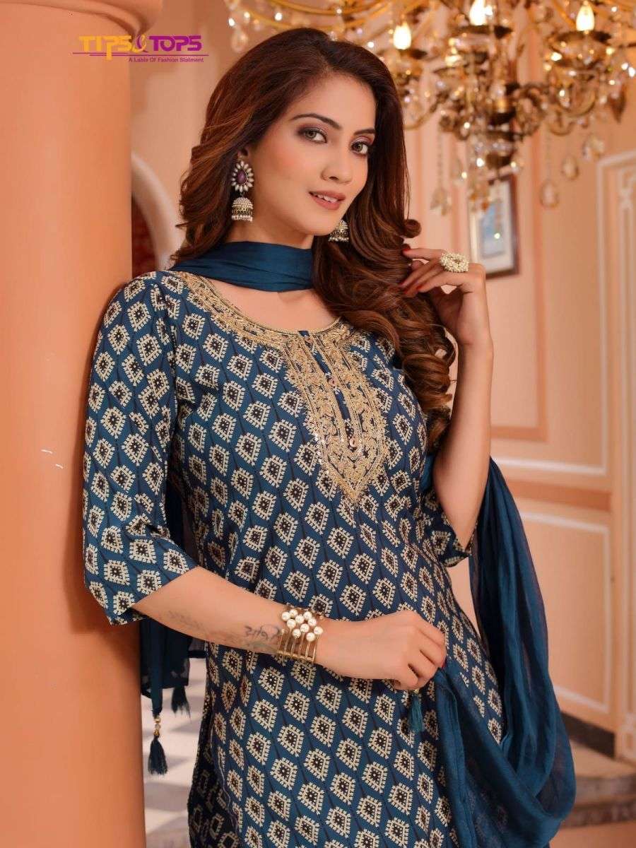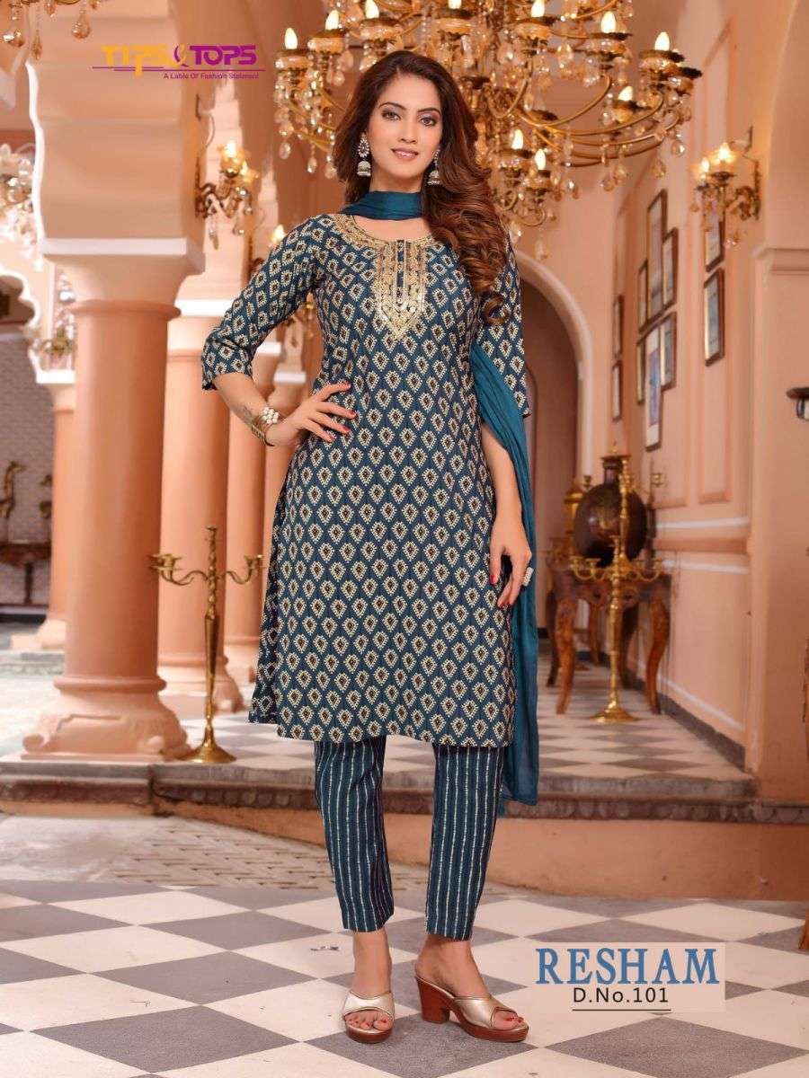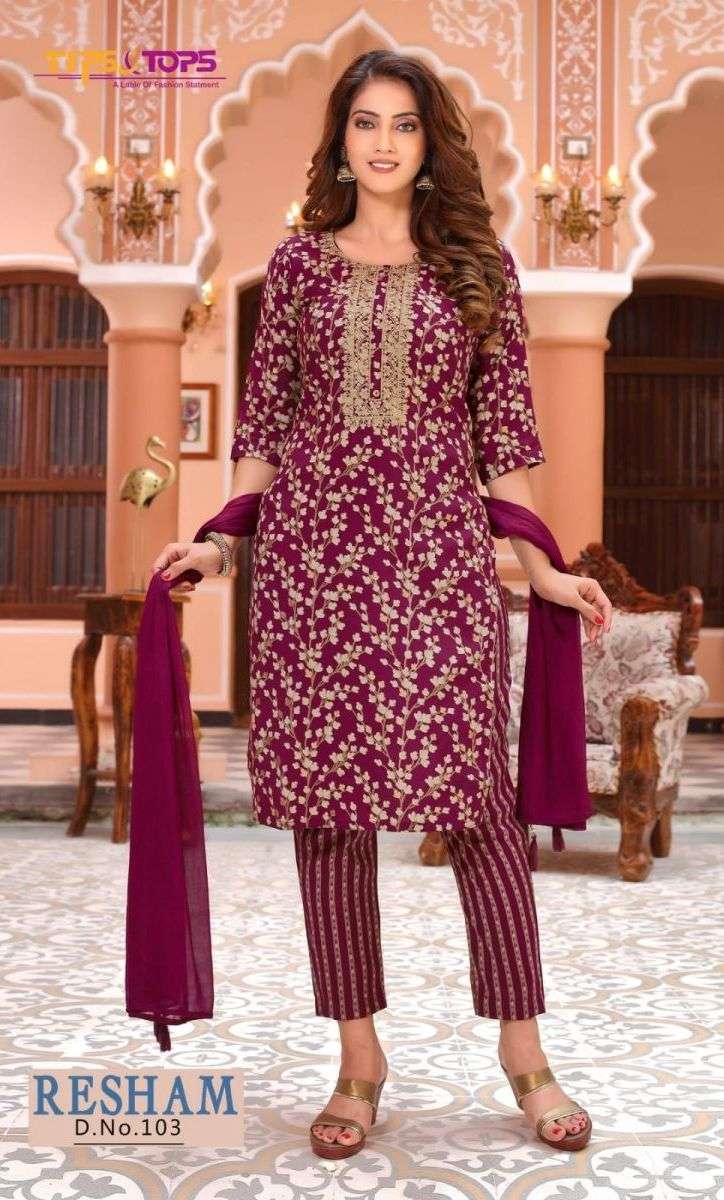RESHAM KURTI BY TIPS & TOPS DESIGNER WITH PRINTED CHANDERI KURTI WITH PANT AND DUPATTA ARE AVAILABLE AT WHOLESALE PRICE