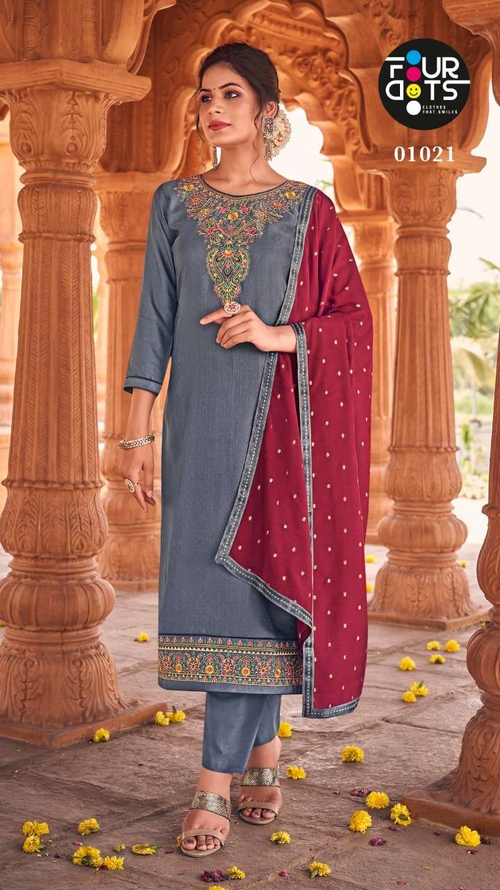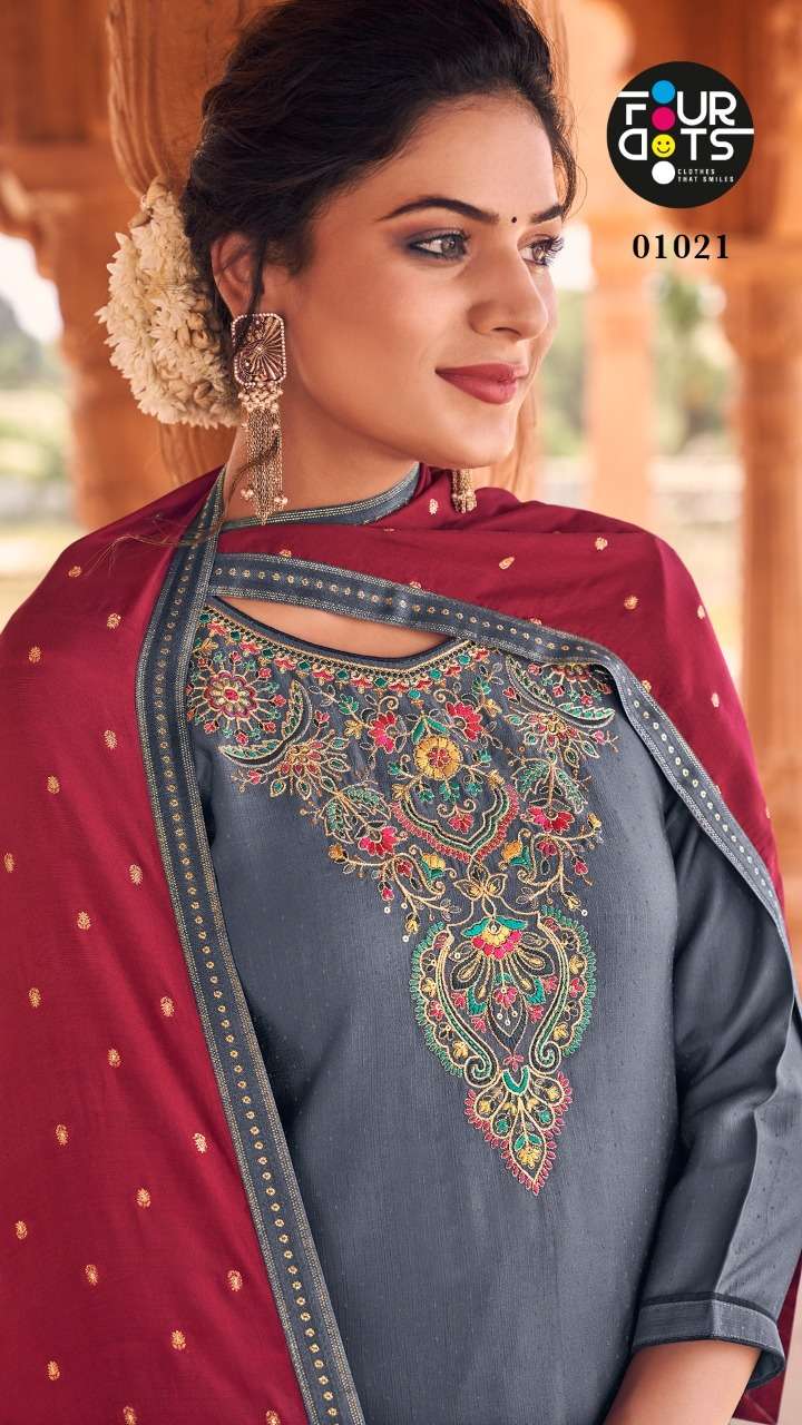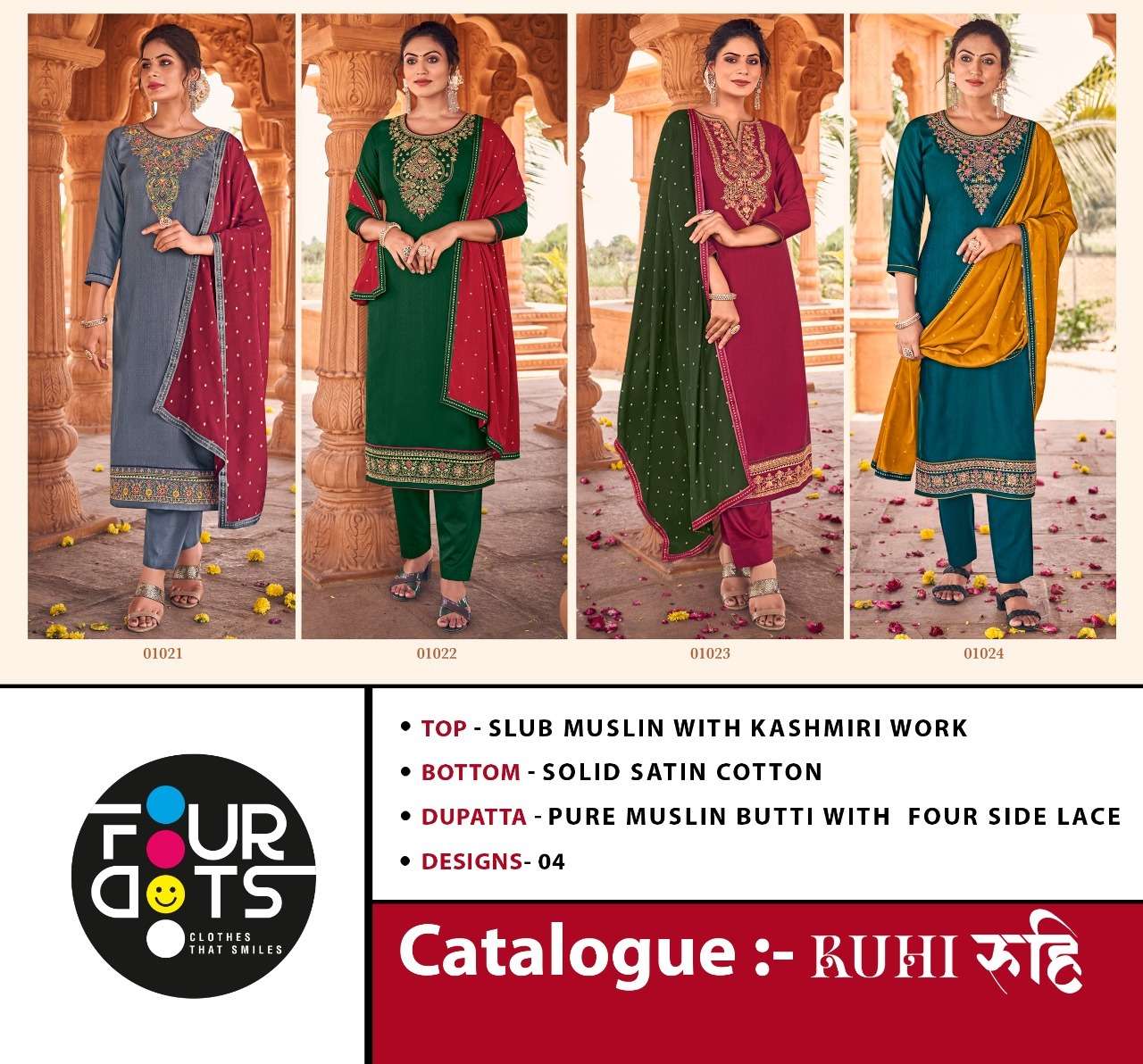 RUHI BY FOUR DOTS DESIGNER WITH EMBROIDERY WORK MUSLIN SUITS ARE AVAILABLE AT WHOLESALE PRICE