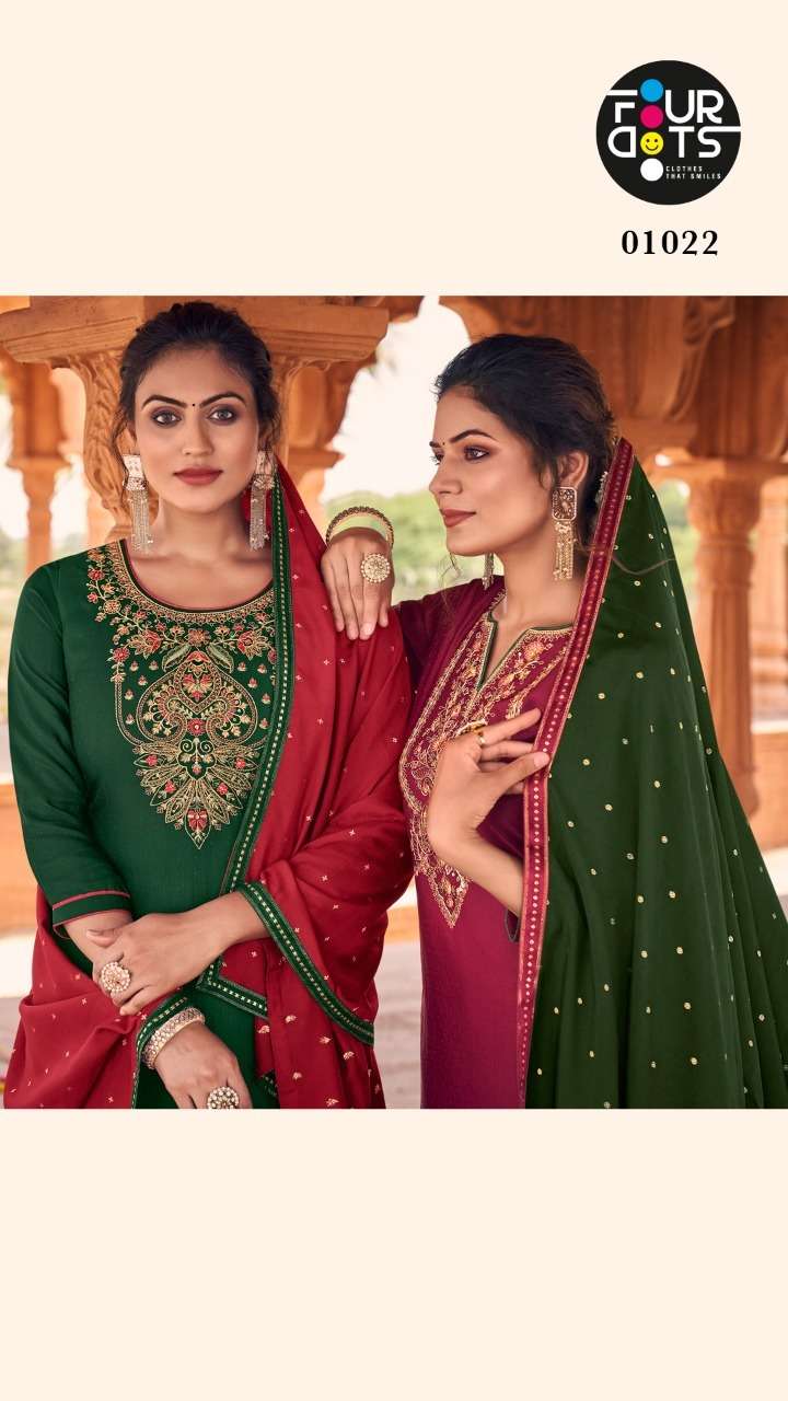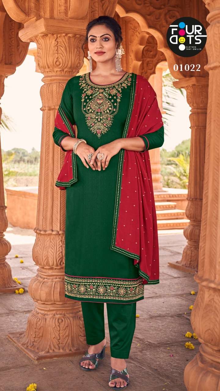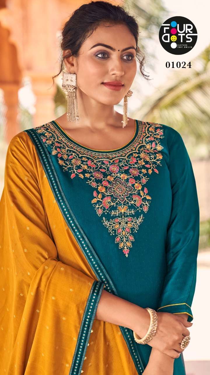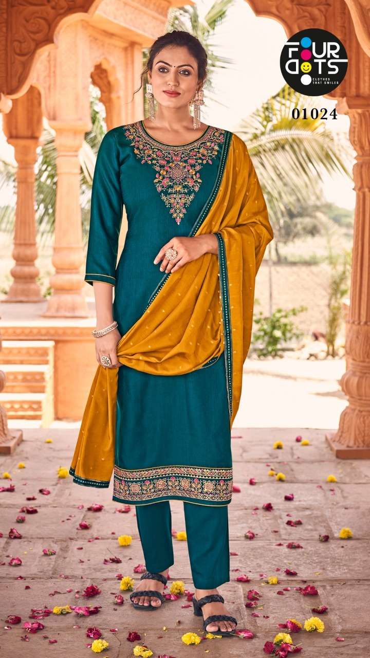 RUHI BY FOUR DOTS DESIGNER WITH EMBROIDERY WORK MUSLIN SUITS ARE AVAILABLE AT WHOLESALE PRICE