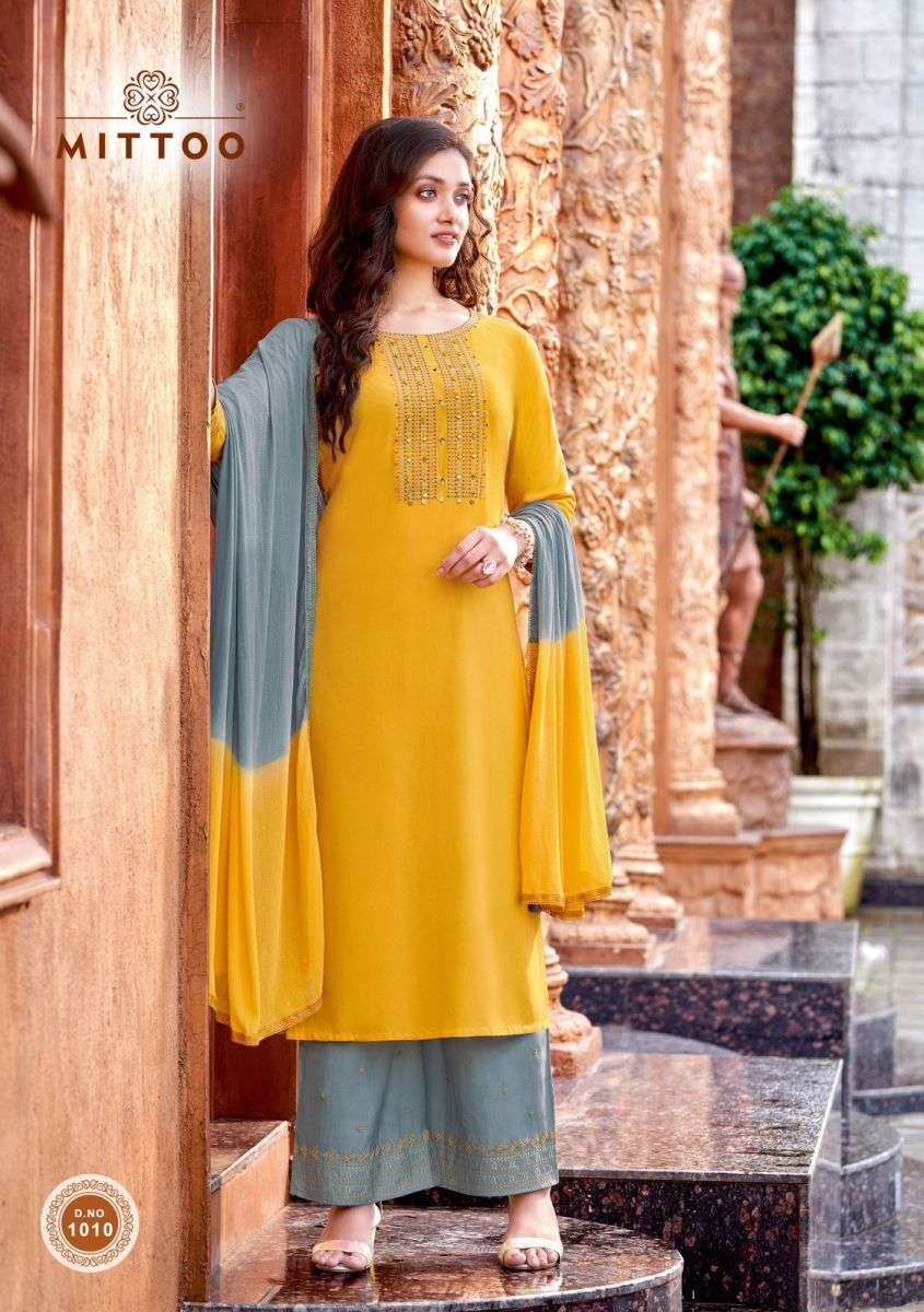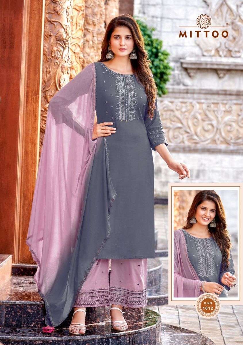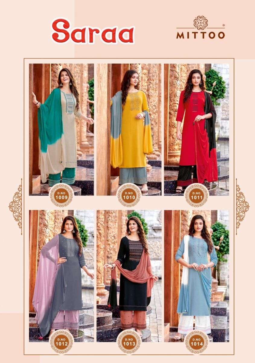 SARAA KURTI BY MITTO DESIGNER WITH WORK RAYON KURTI WITH PANT AND DUPATTA ARE AVAILABLE AT WHOLESALE PRICE