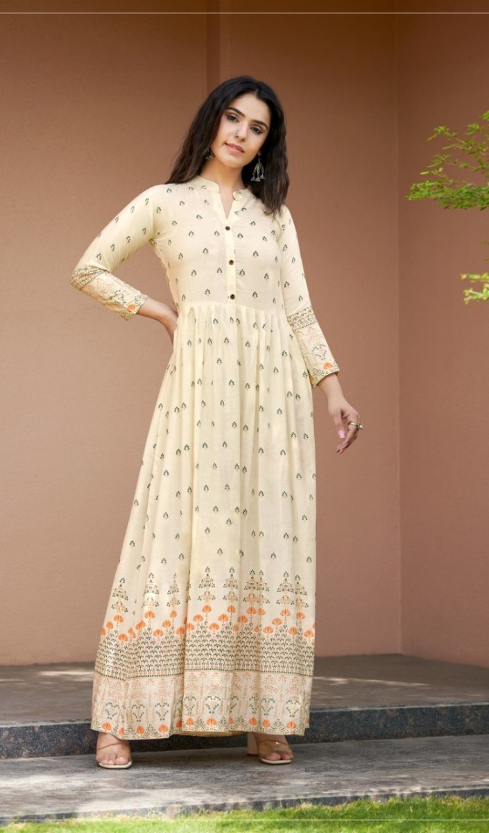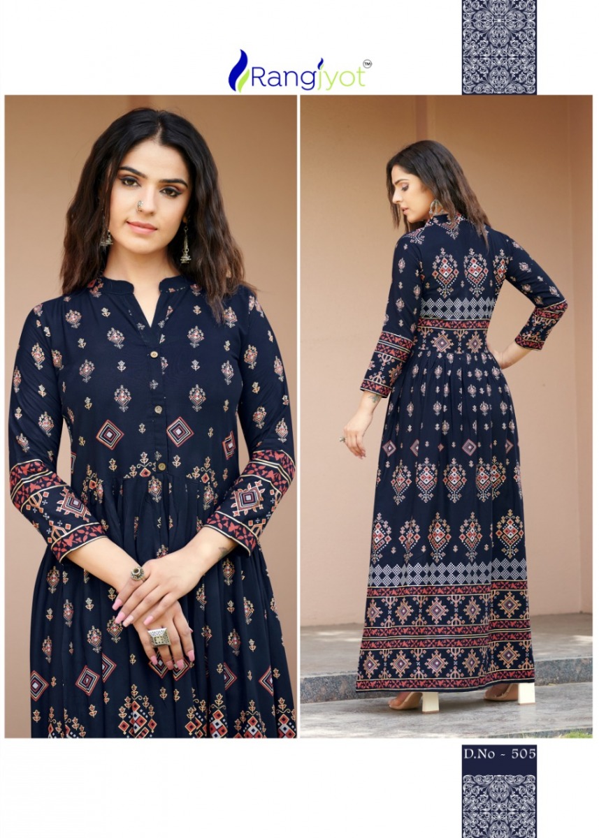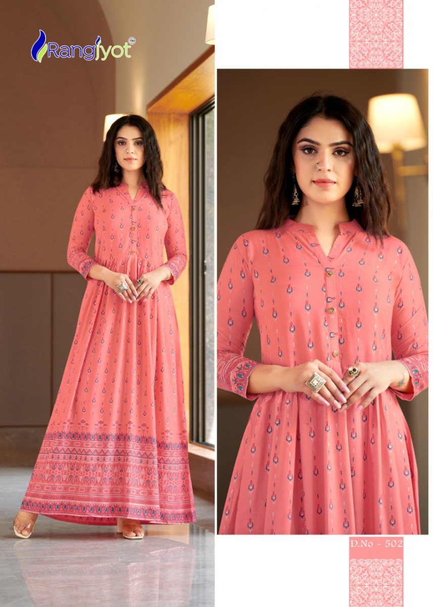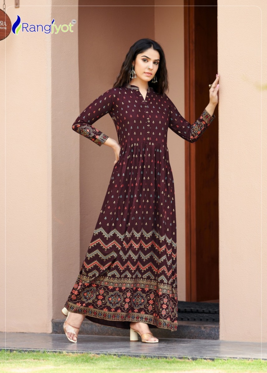 Sehnaaz Vol-5 Kurti By Rangjyot Designer With Printed Long Gown Style Rayon Kurtis Are Available At Wholesale Price