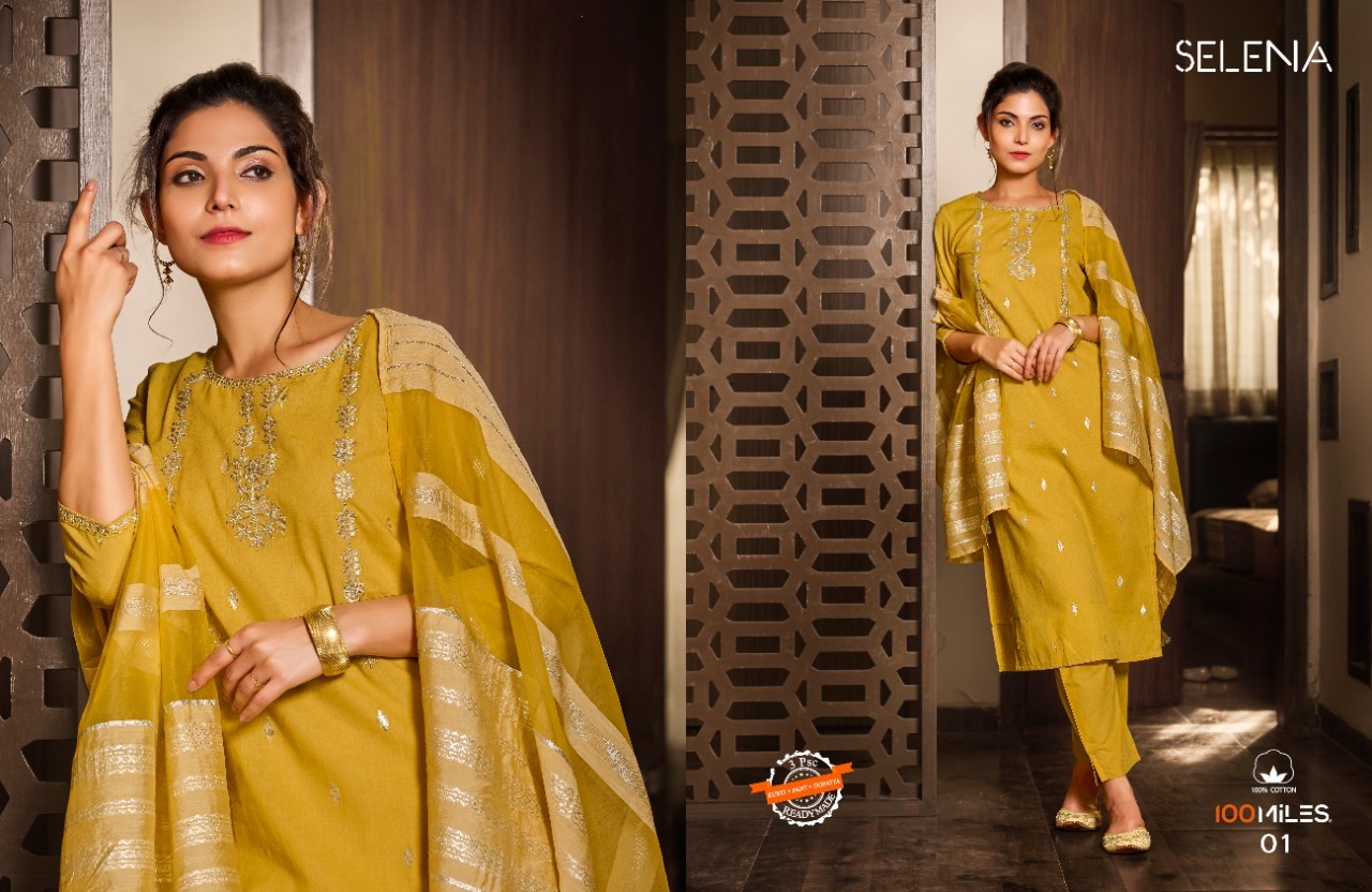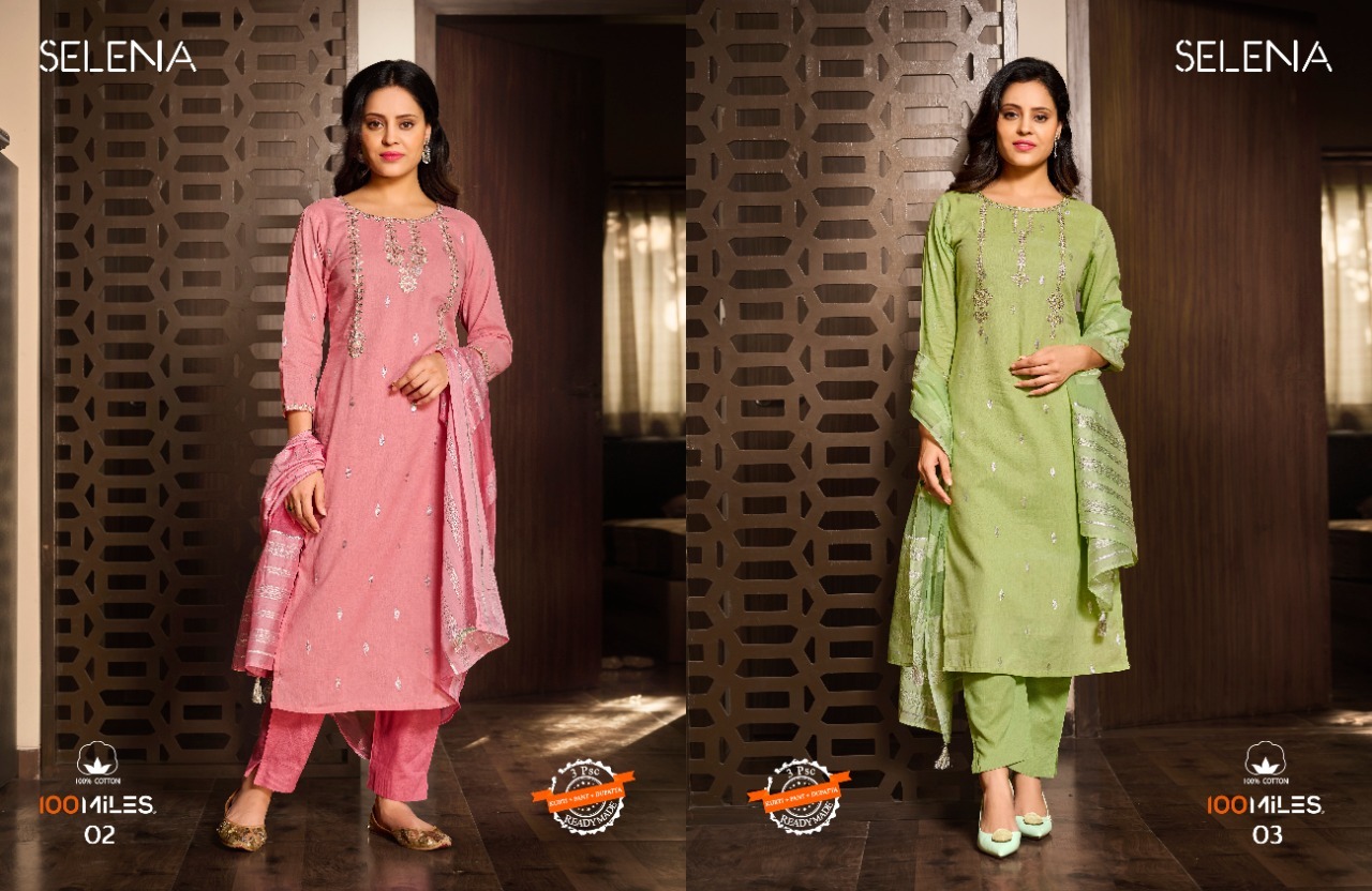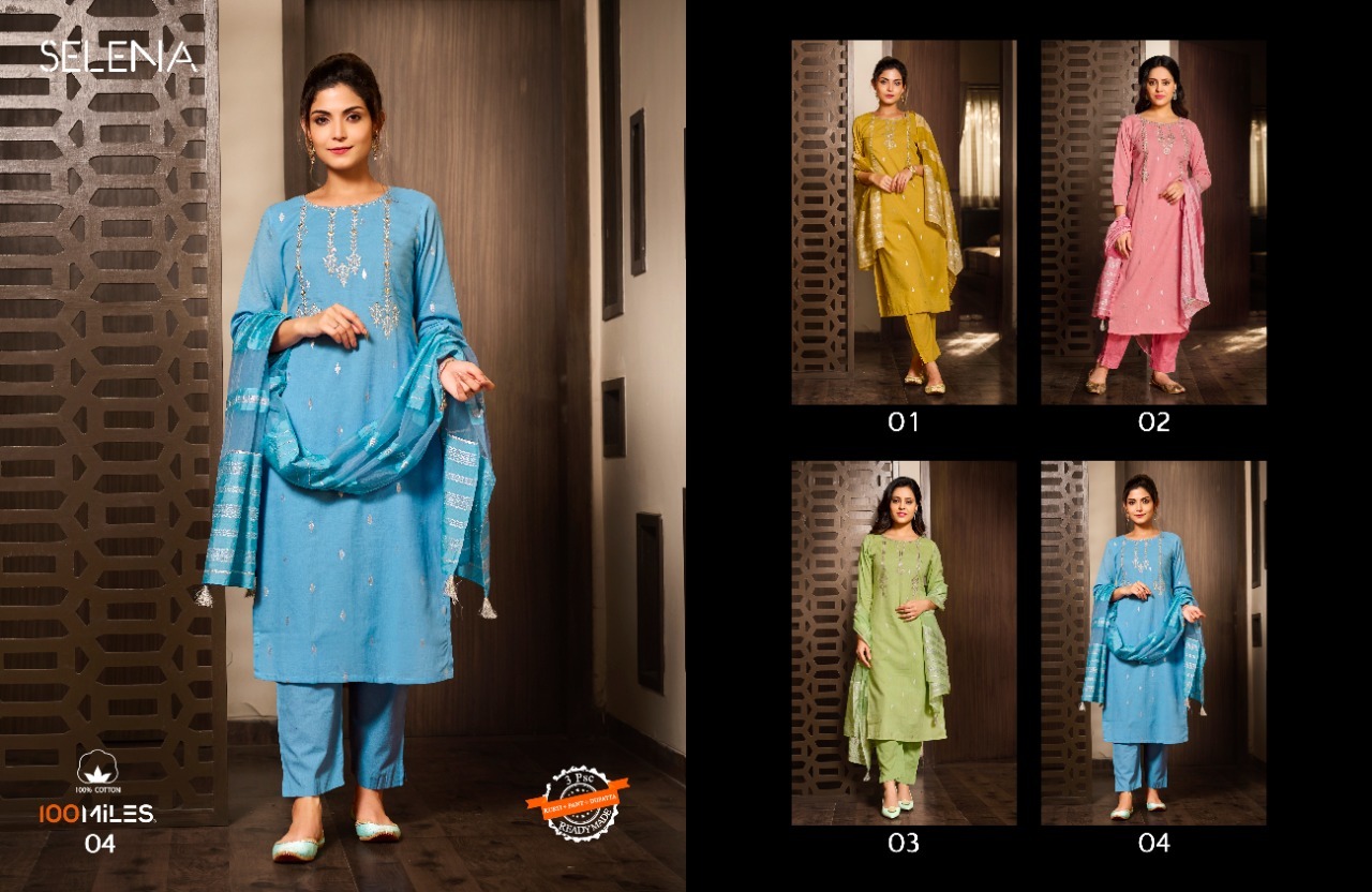 Selena Kurti By 100 Miles Designer With Work Cotton Kurti With Bottom And Dupatta Are Available At Wholesale Price