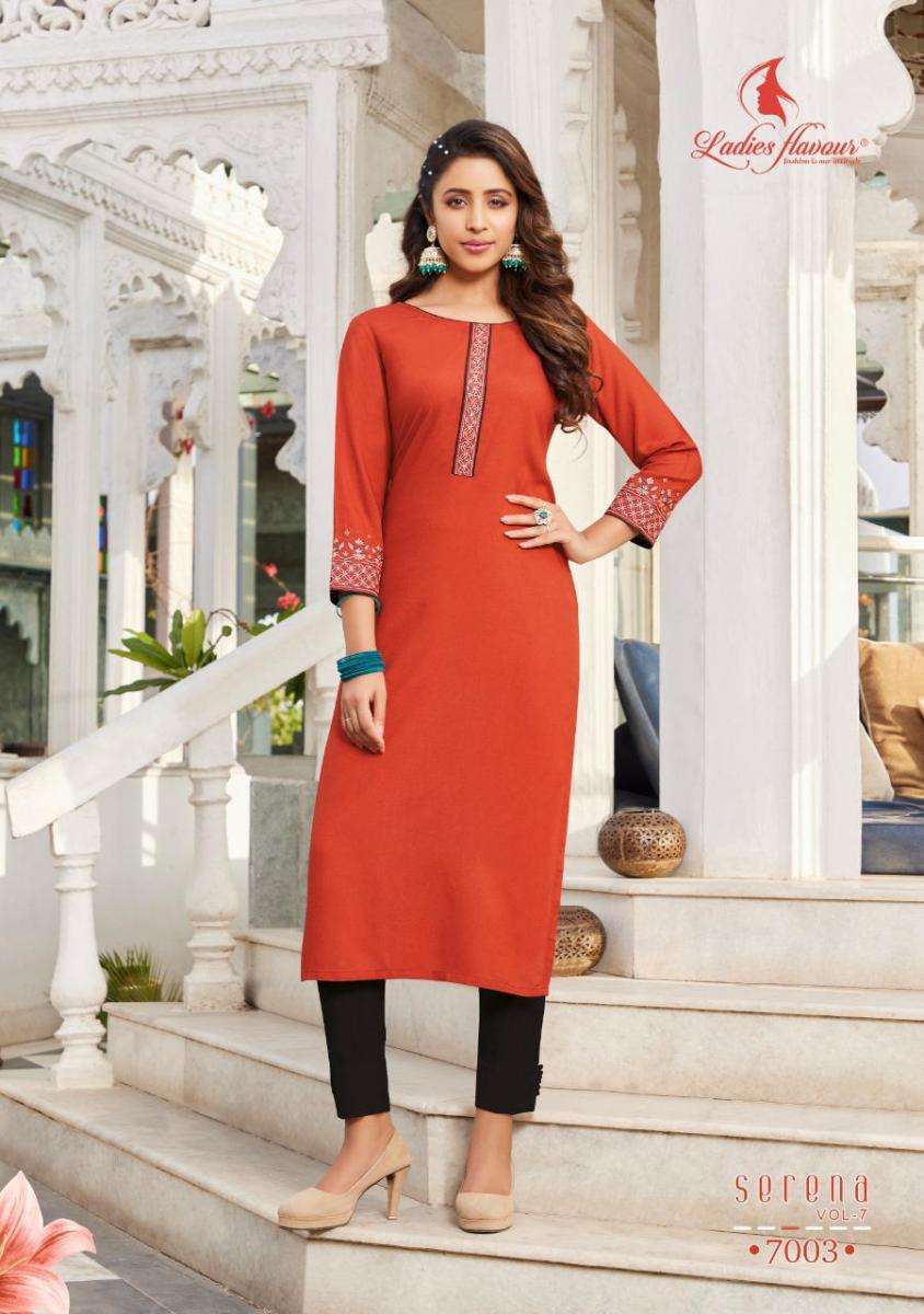 SERENA VOL-7 KURTI BY LADIES FLAVOUR DESIGNER WITH EMBROIDERY WORK RAYON KURTIS ARE AVAILABLE AT WHOLESALE PRICE