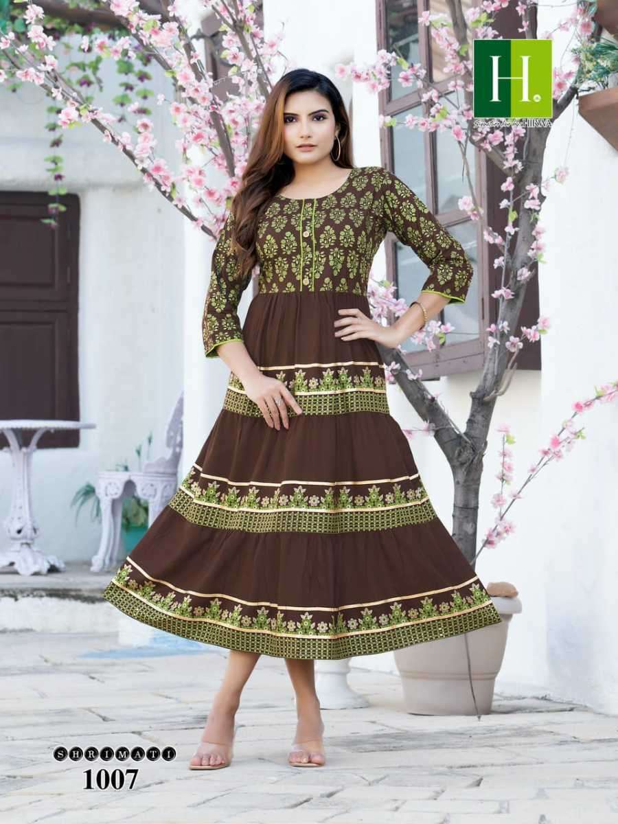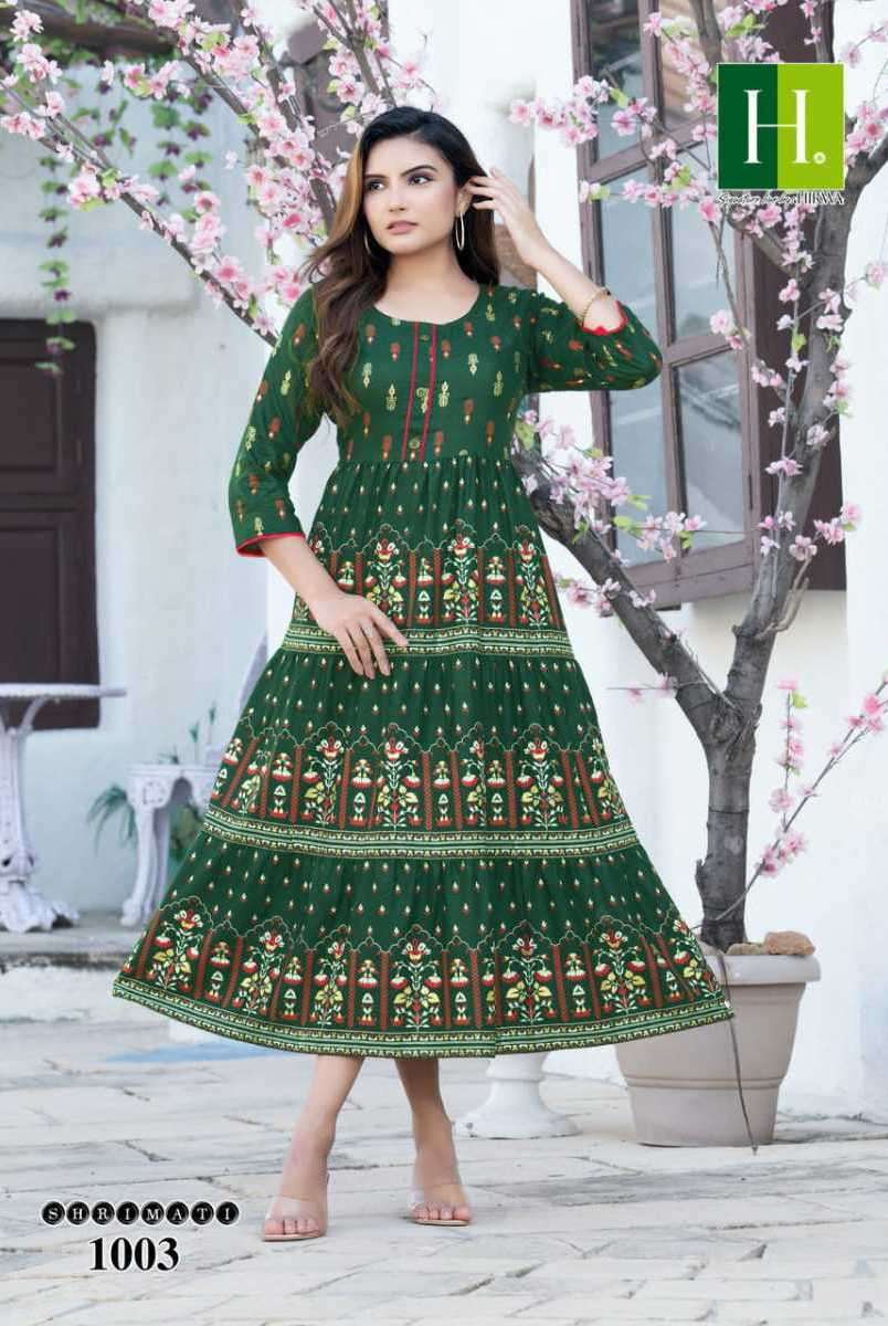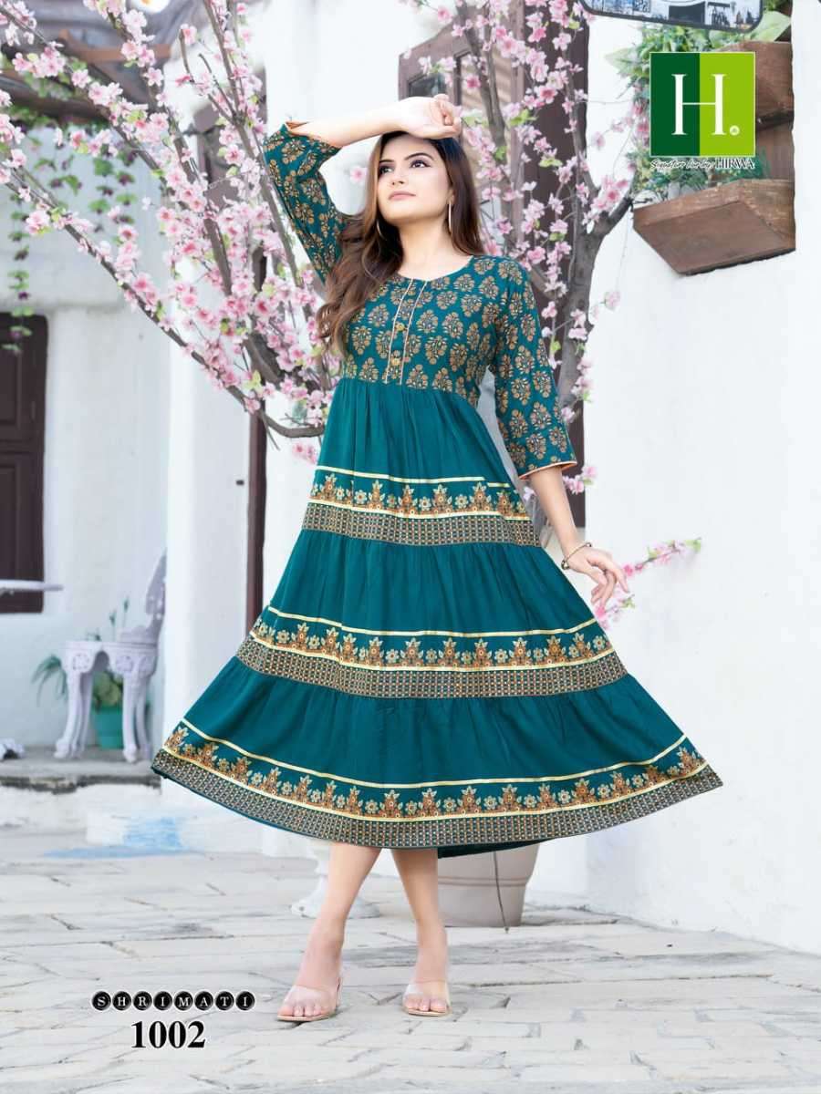 SHRIMATI KURTI BY HIRWA DESIGNER WITH PRINTED AND WITH GHERA RAYON KURTIS ARE AVAILABLE AT WHOLESALE PRICE