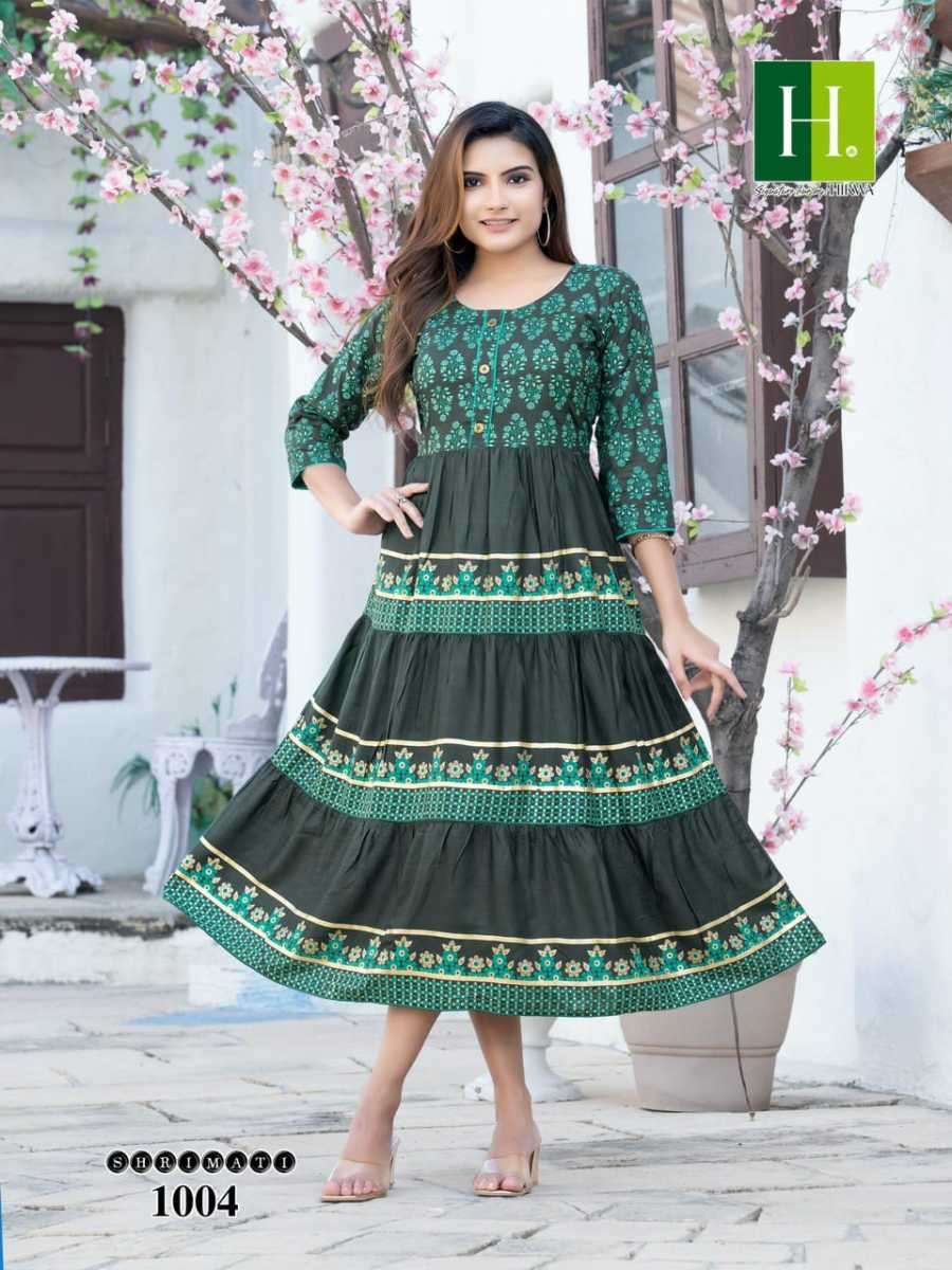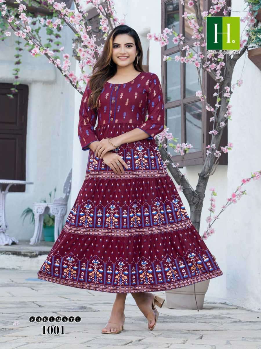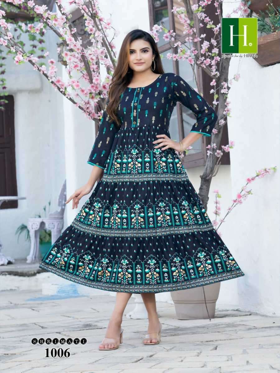 SHRIMATI KURTI BY HIRWA DESIGNER WITH PRINTED AND WITH GHERA RAYON KURTIS ARE AVAILABLE AT WHOLESALE PRICE