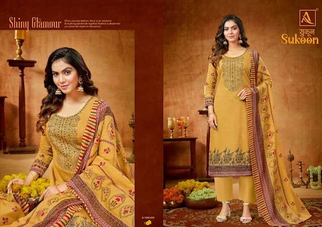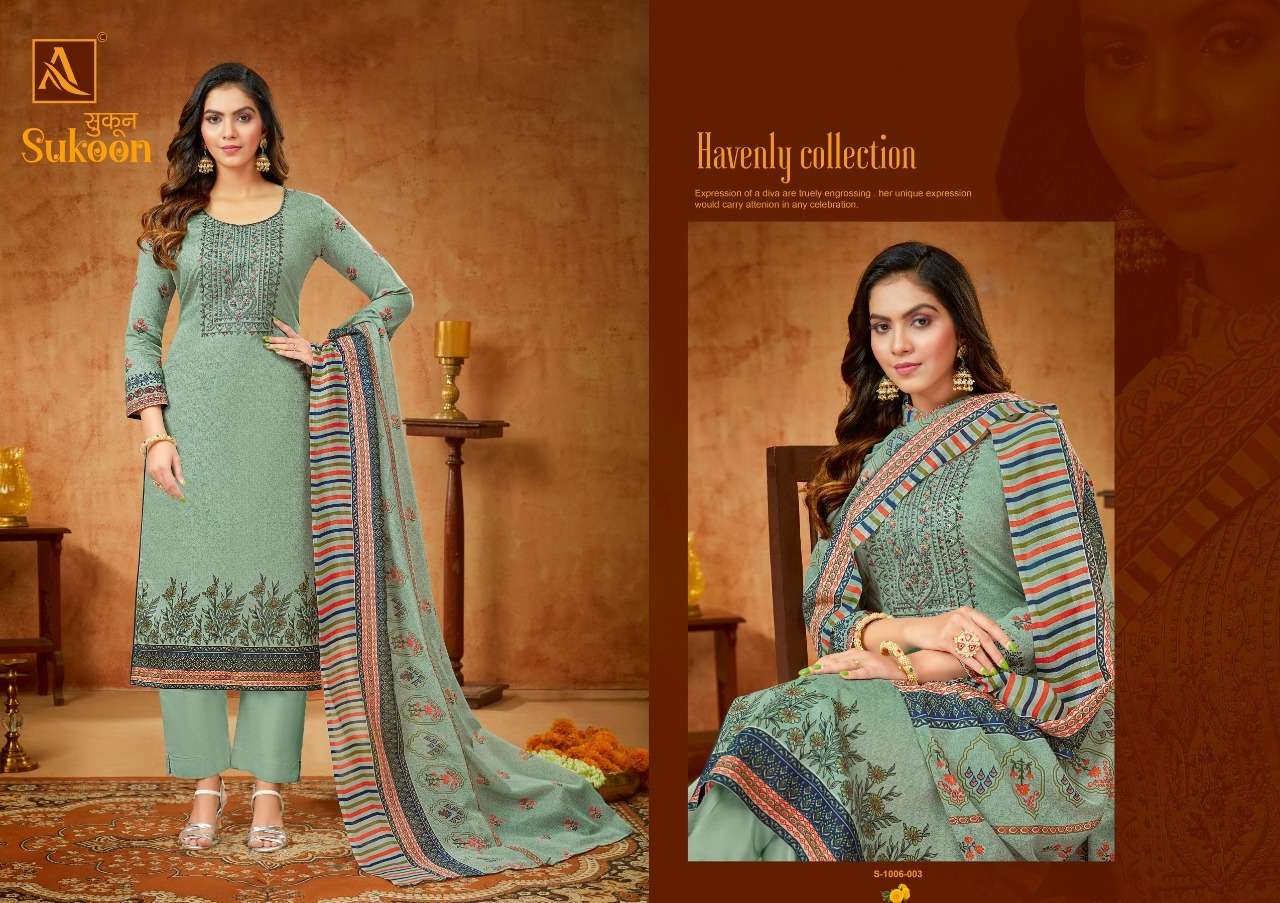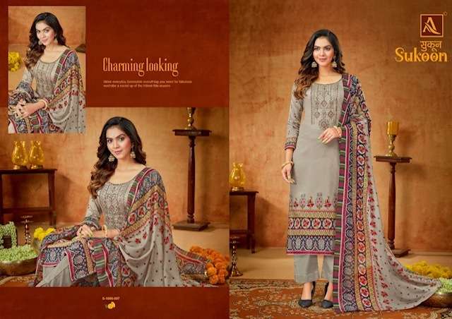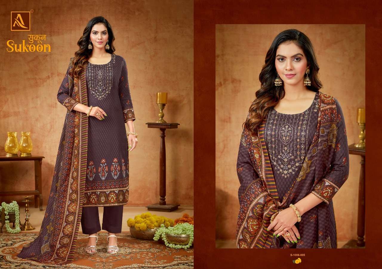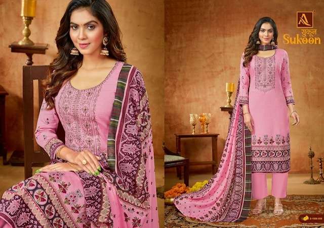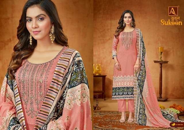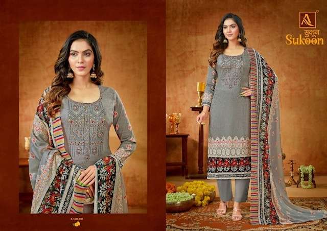 SUKOON BY ALOK SUITS DESIGNER WITH PRINTED AND EMBROIDERY WORK PURE ZAM SUITS ARE AVAILABLE AT WHOLESALE PRICE