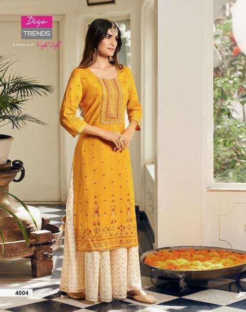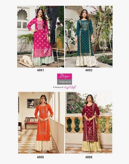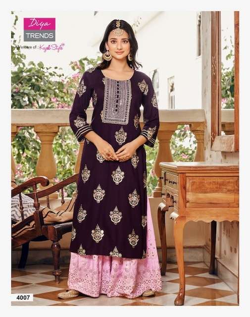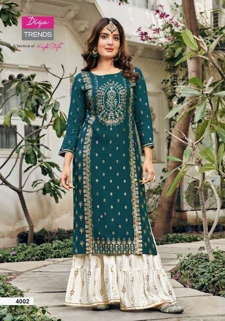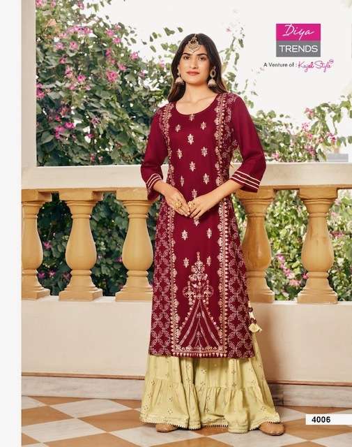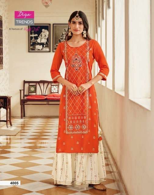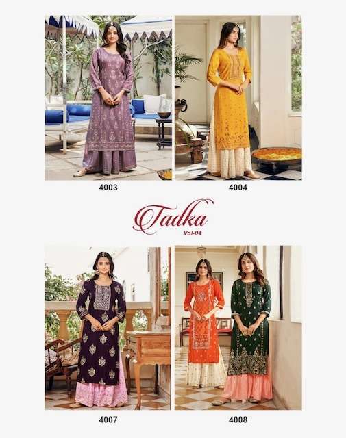 TADKA VOL-4 KURTI BY DIYA TRENDS DESIGNER WITH PRINTED AND WORK RAYON KURTI WITH SHARARA ARE AVAILABLE IN SINGLES AT WHOLESALE PRICE