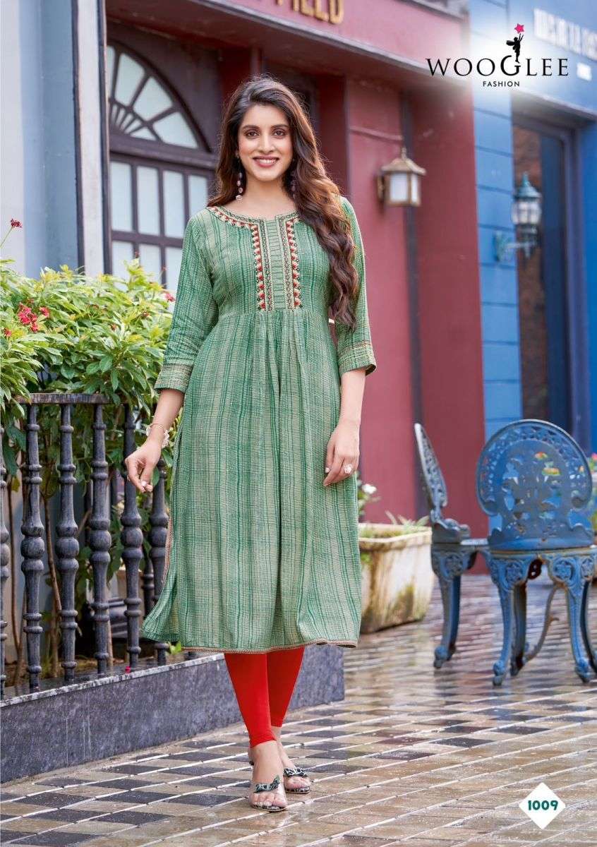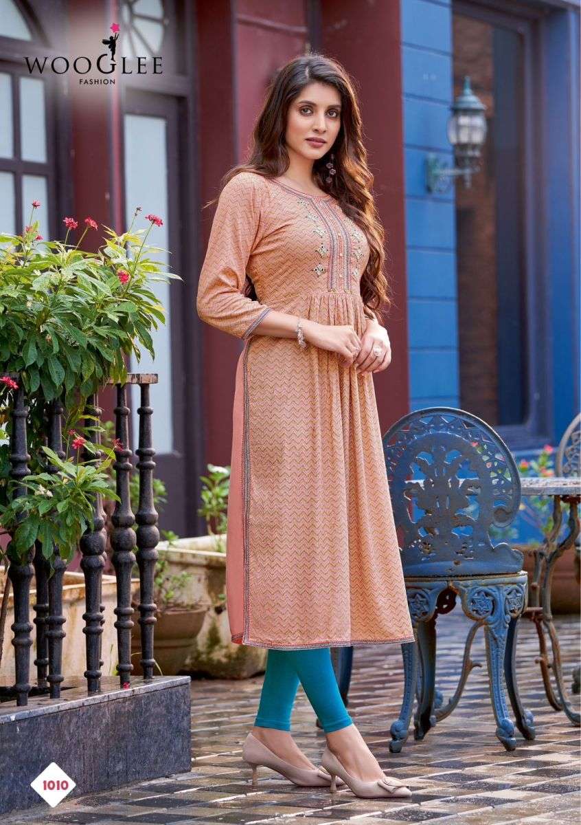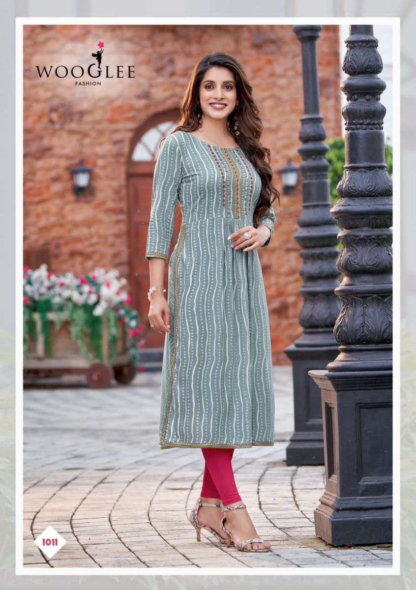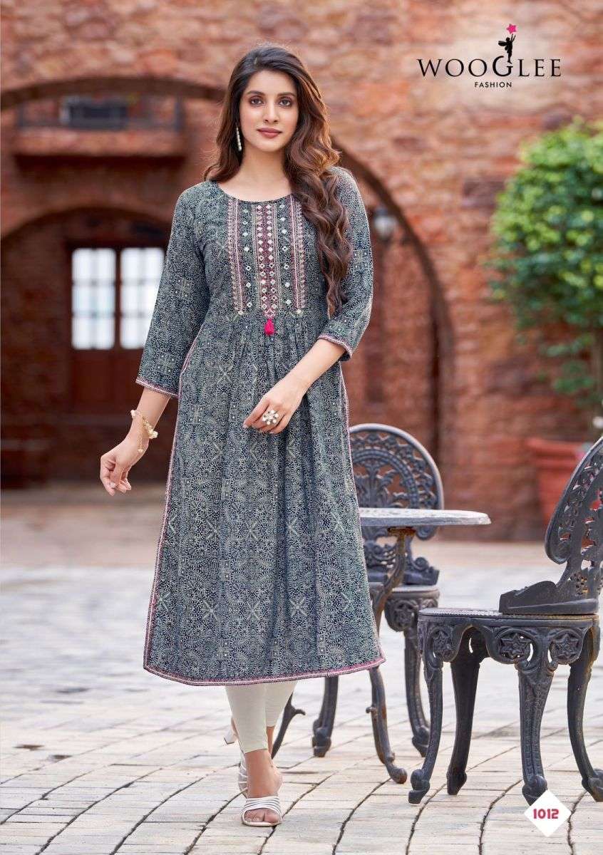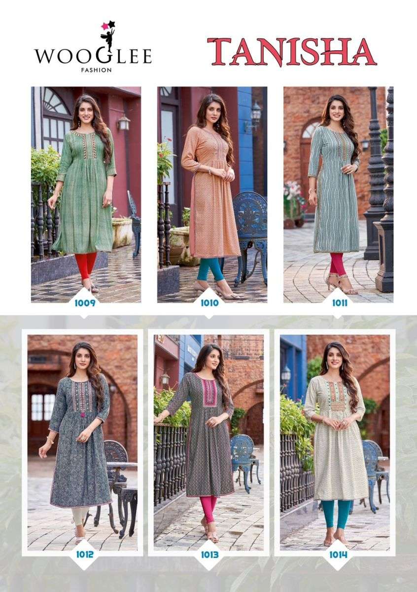 TANISHA KURTI BY WOOGLEE DESIGNER WITH PRINTED AND NYRA CUT RAYON KURTIS ARE AVAILABLE AT WHOLESALE PRICE