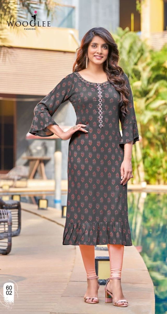Tarang Kurti By Wooglee Designer With Work And Printed Rayon Kurtis Are Available At Wholesale Price