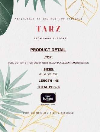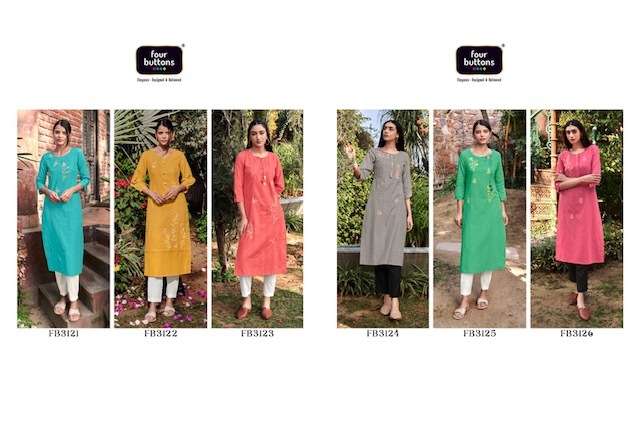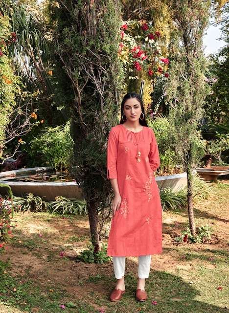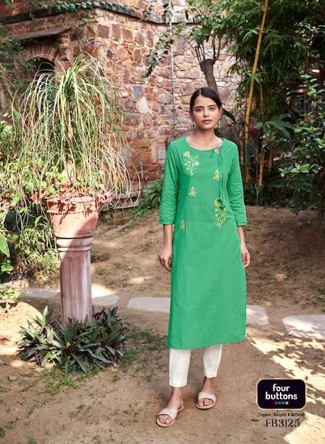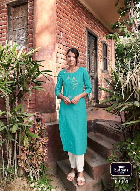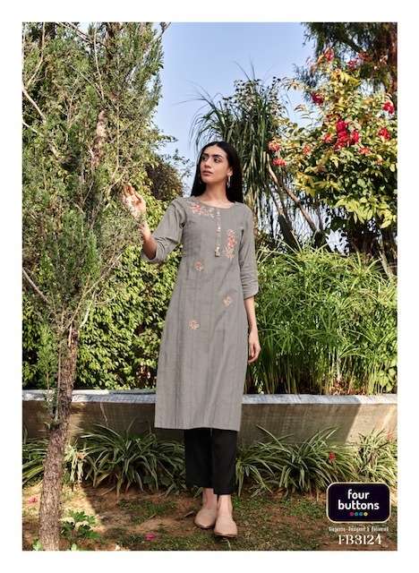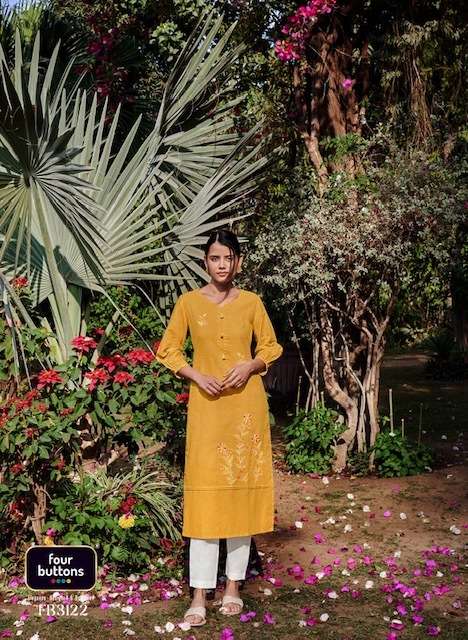 TARZ KURTI BY FOUR BUTTONS DESIGNER WITH EMBROIDERY WORK COTTON KURTIS ARE AVAILABLE AT WHOLESALE PRICE