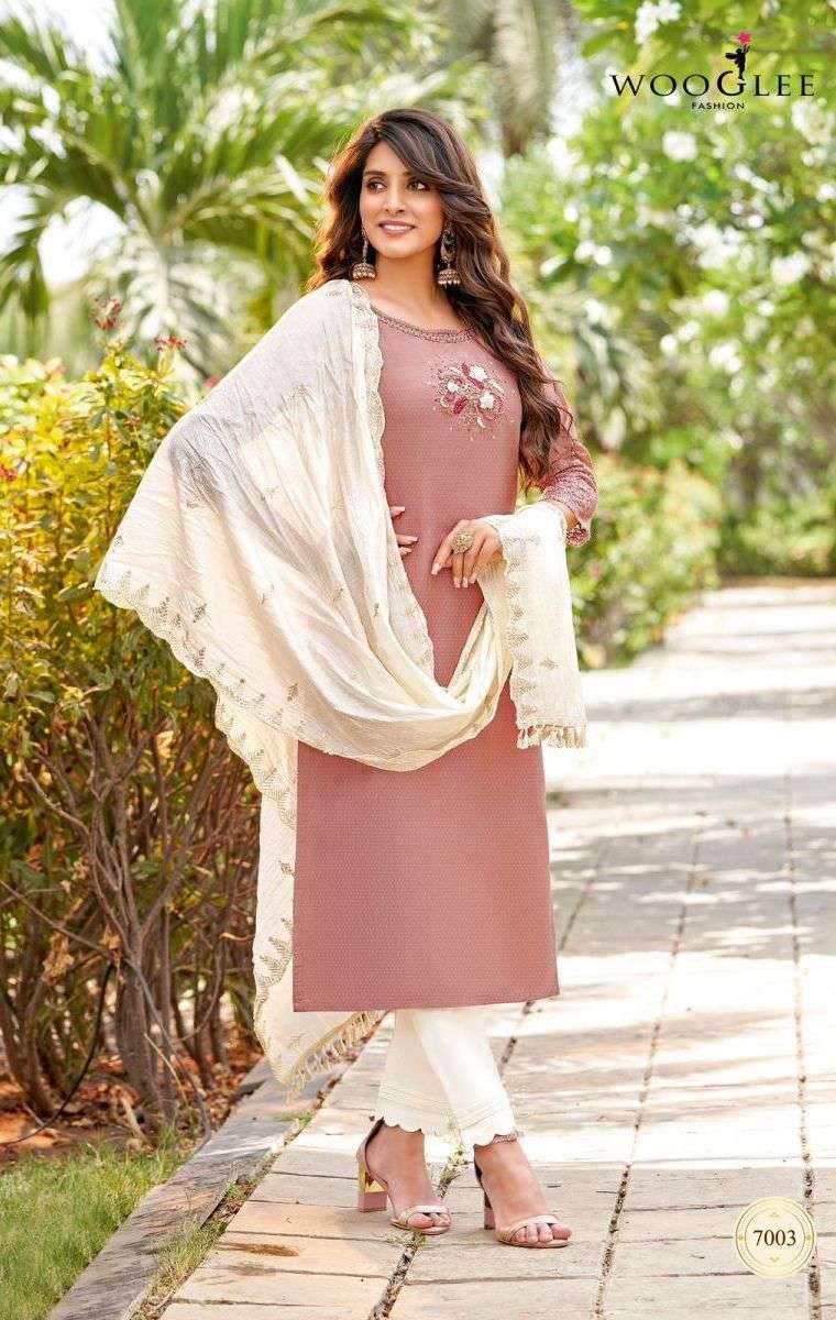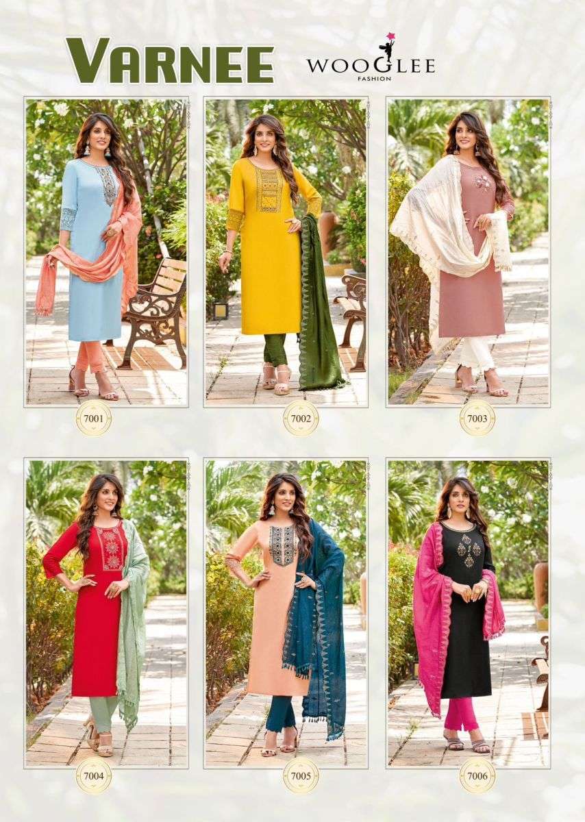 VARNEE KURTI BY WOOGLEE DESIGNER WITH WORK RAYON KURTI WITH BOTTOM AND DUPATTA ARE AVAILABLE AT WHOLESALE PRICE
