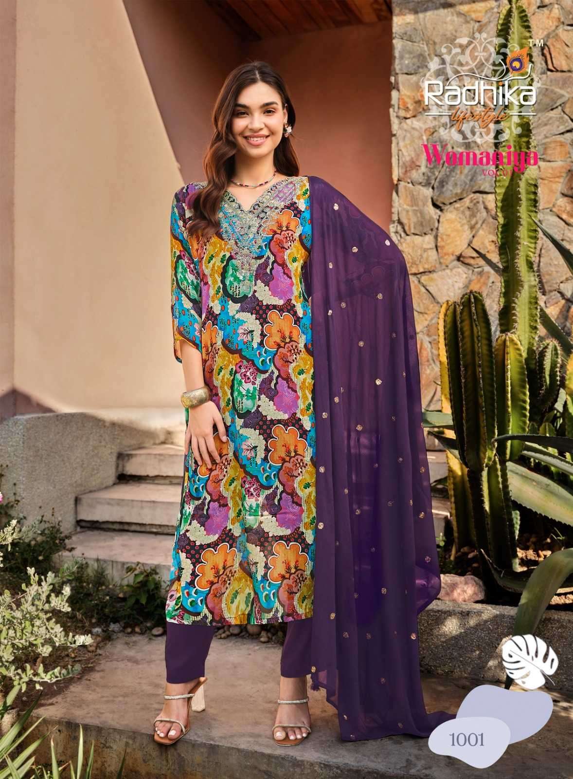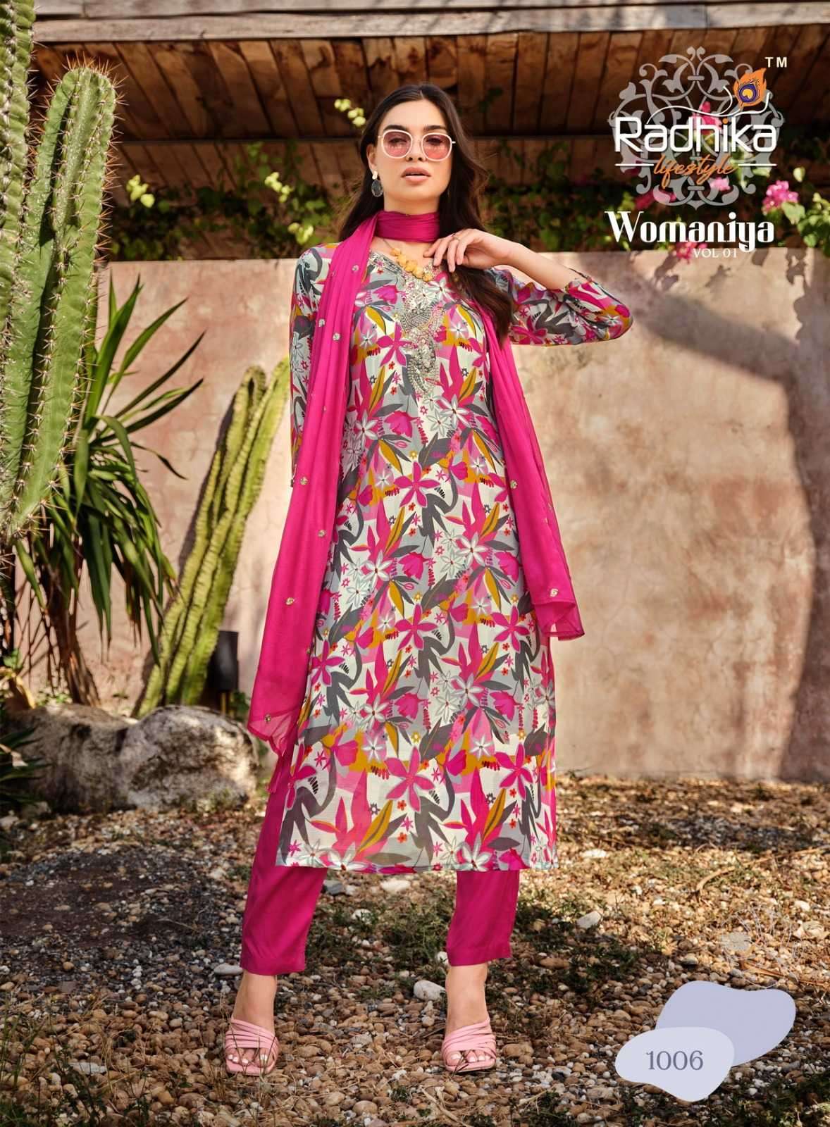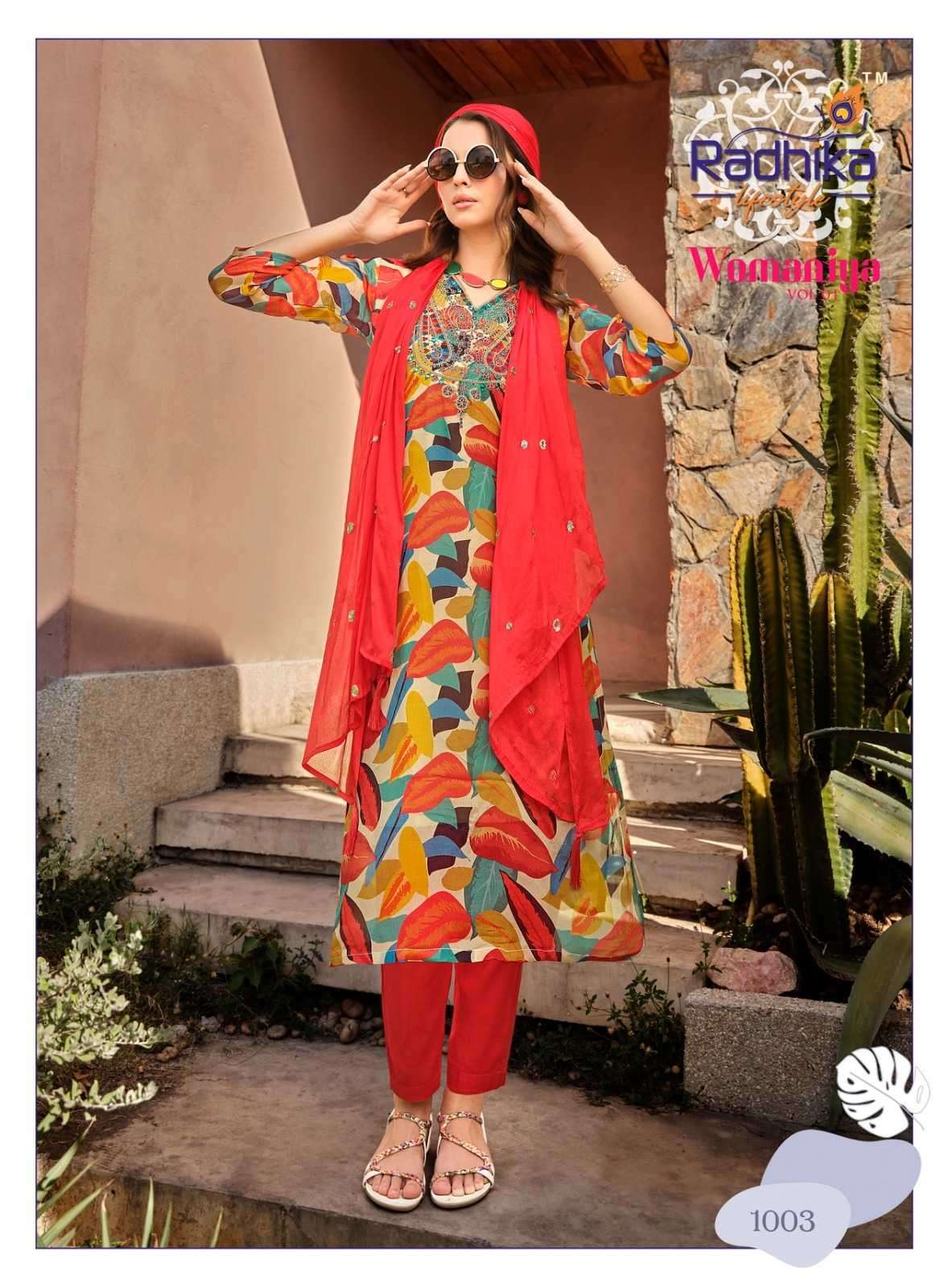 | Name: | radhika lifestyle-WOMANIYA VOL-1 SERIES 1001 TO 1006 KURTI BY RADHIKA |